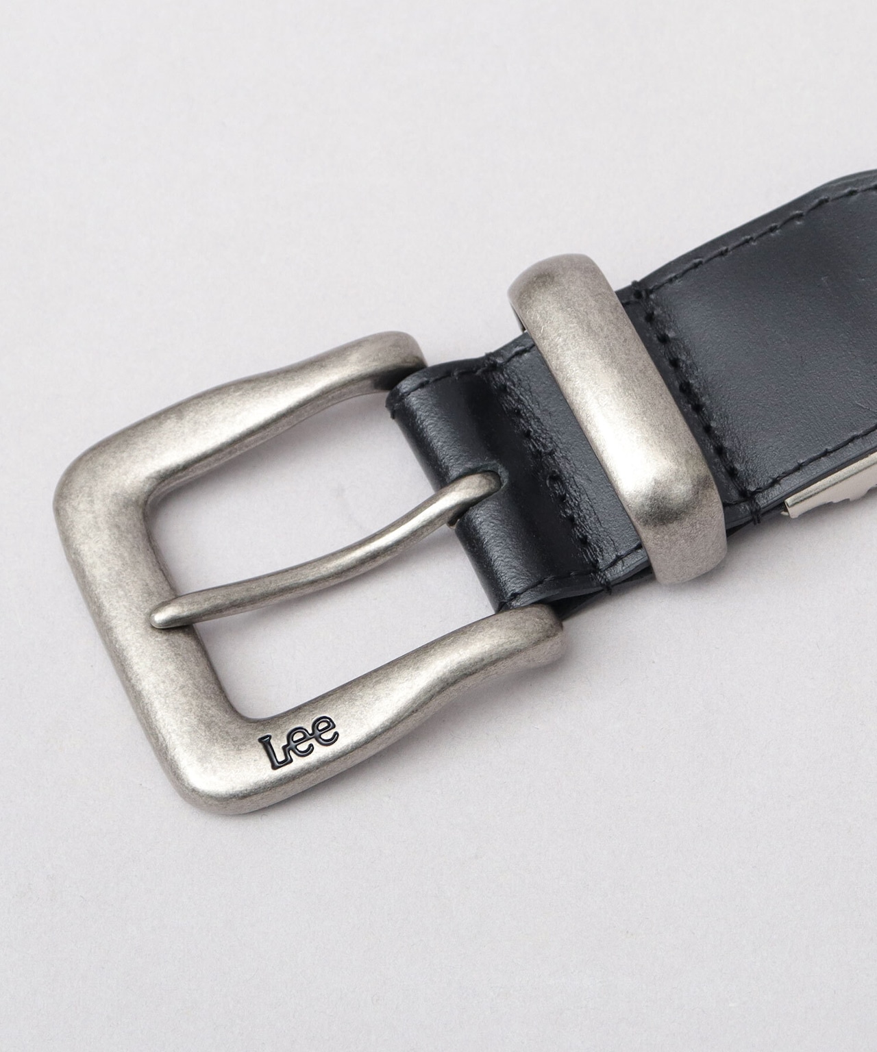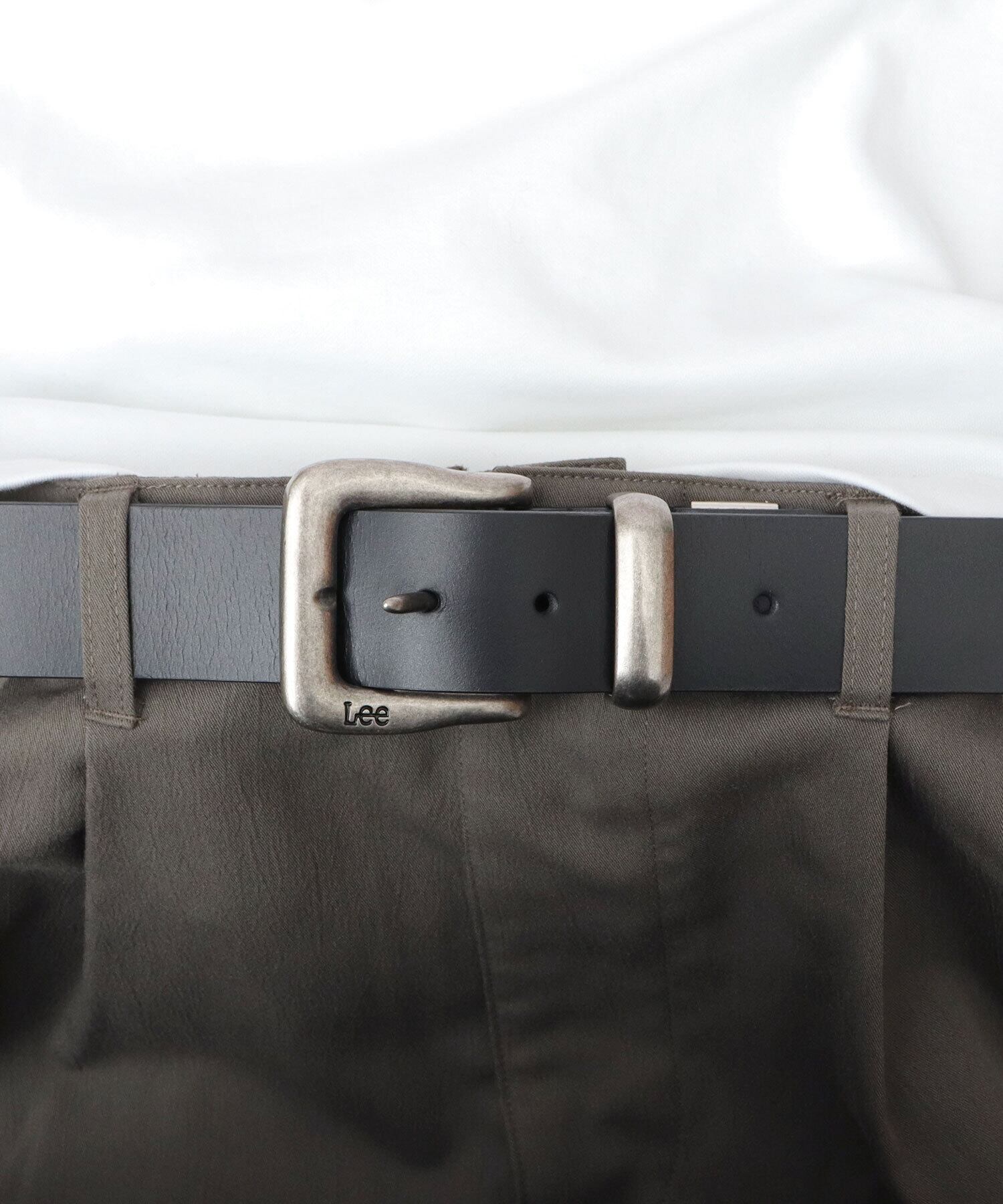 約4cmのしっかりとしたホールド感のある太めの帯は、カジュアルな装いにおすすめ。ベルト裏にさり気なく施された“Lee”刻印も魅力。