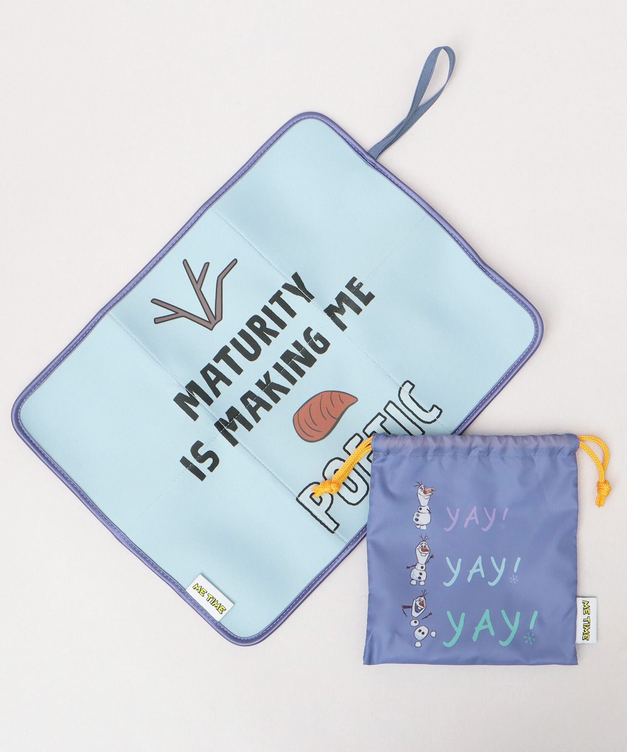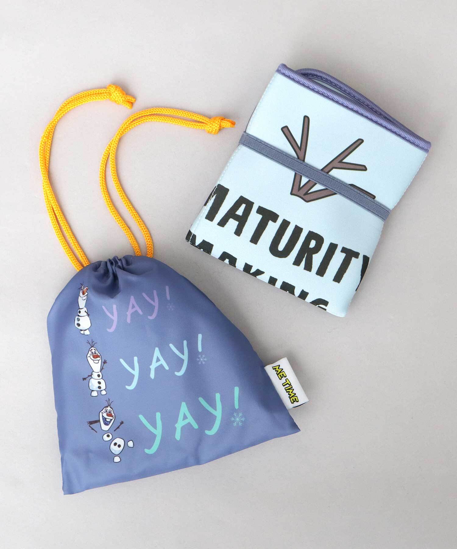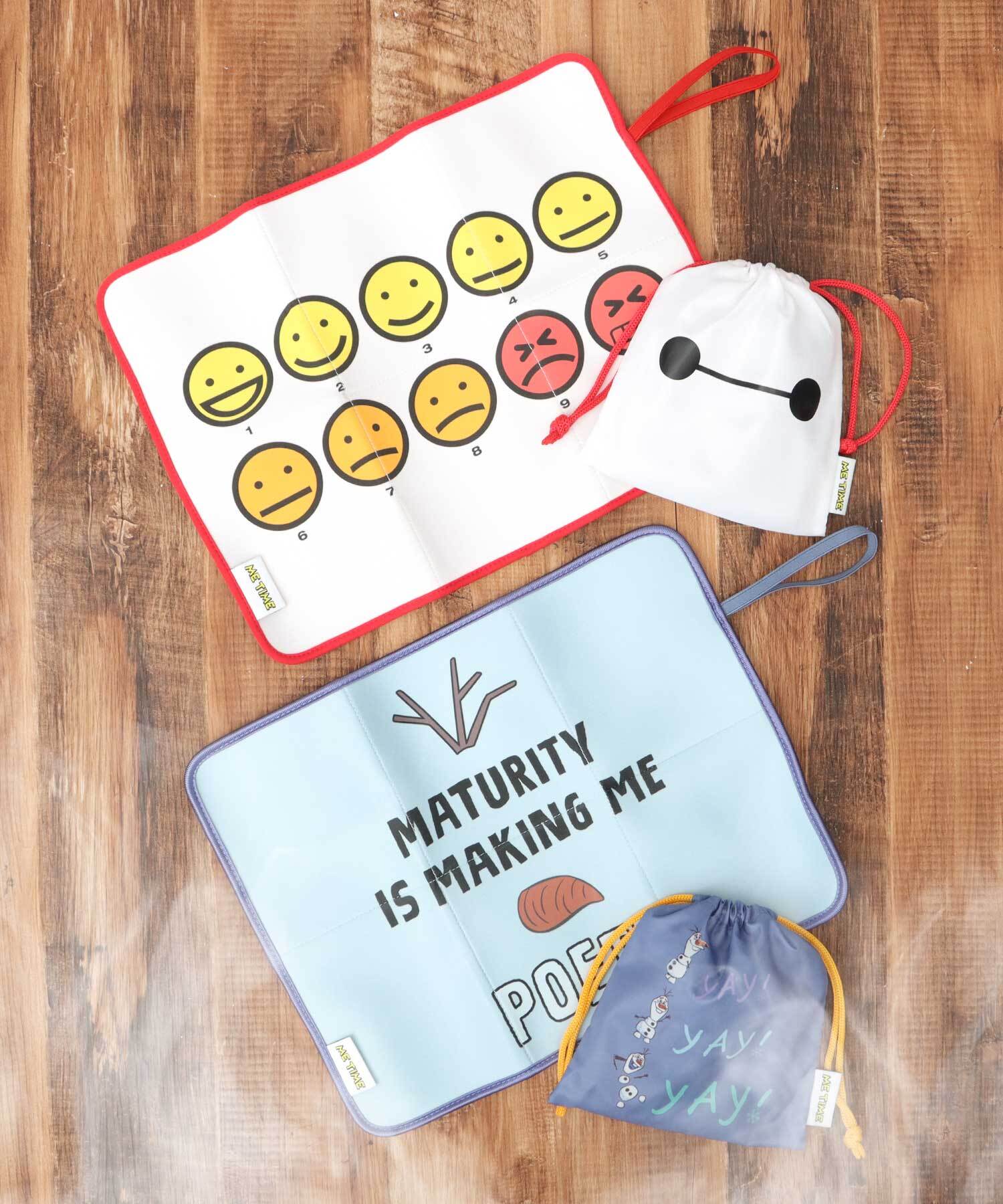 お気に入りのディズニーキャラクターと一緒にサウナ時間を楽しめちゃう、巾着付きサウナマット。“ME TIME(ひとり時間)”のピスタグがアクセントに。