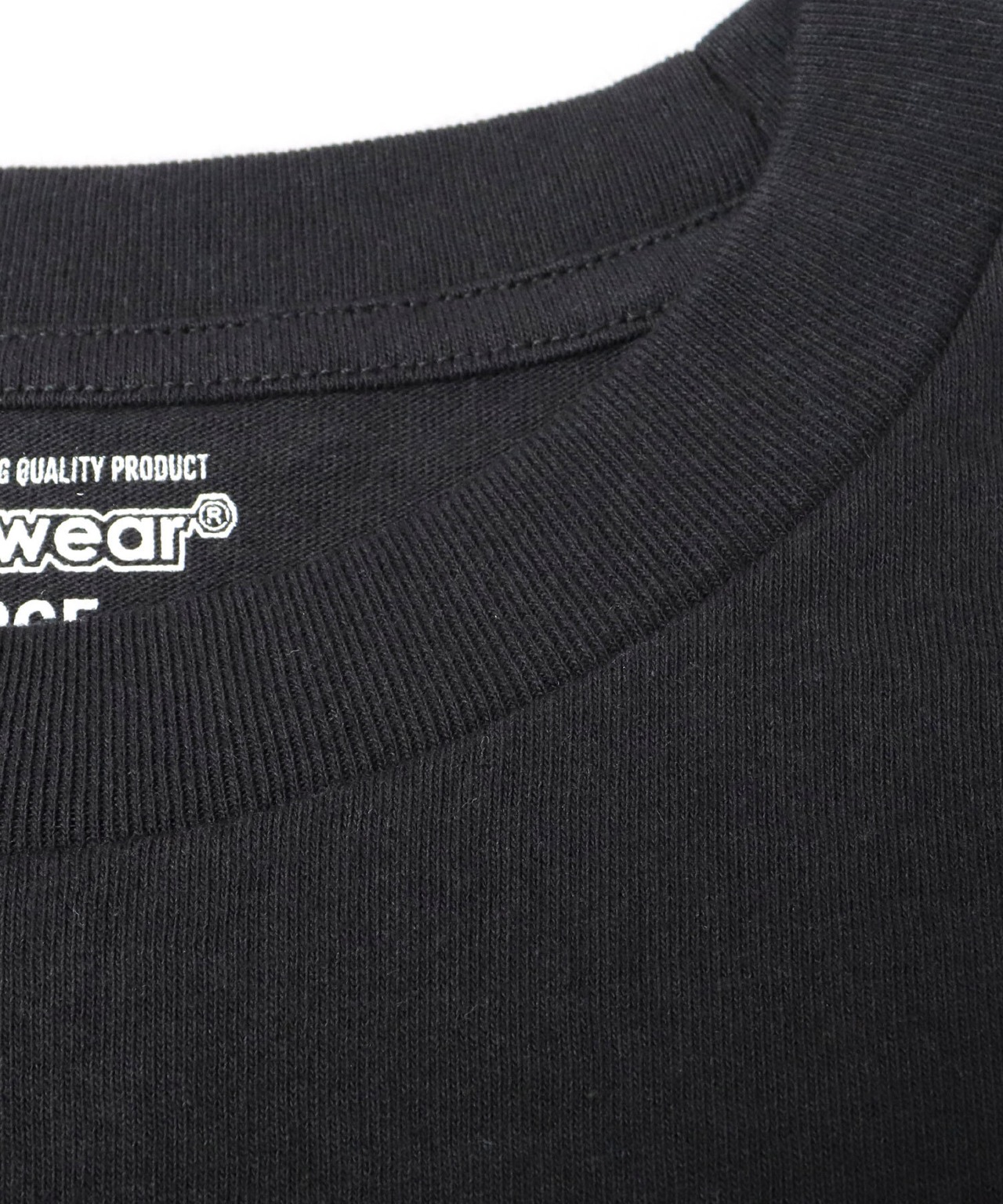 首元のタグを取り除き、プリント。肌に当たってチクチクすることもないので、1枚での着用やインナーとしてもおすすめ。