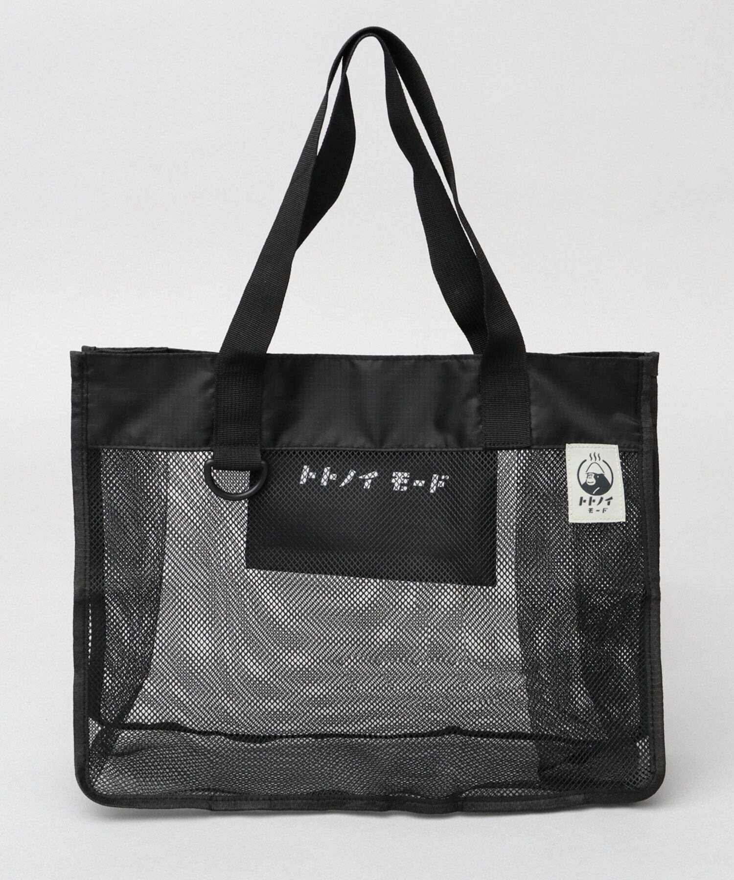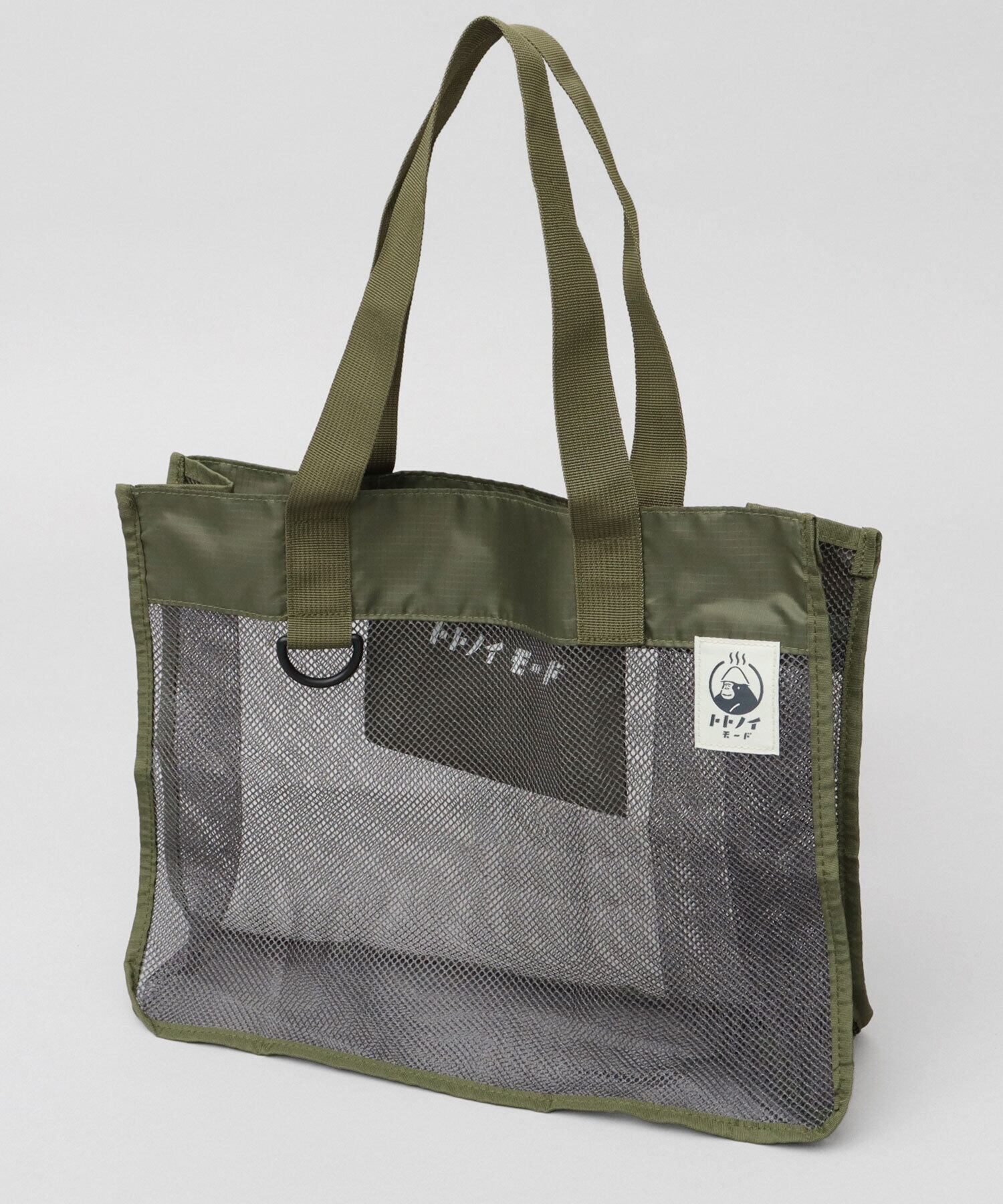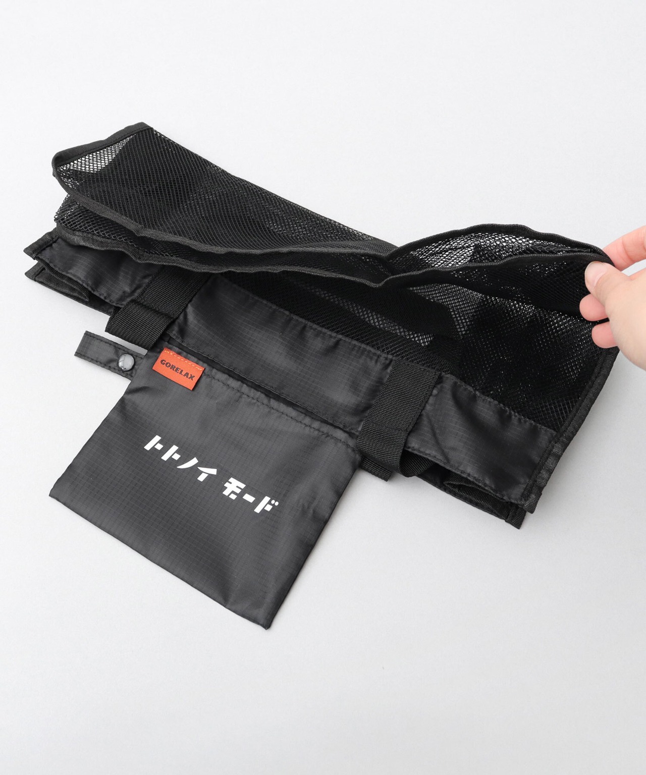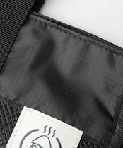 バッグ内側には、吊るし式のオープンポケットとメッシュポケットを完備。メッシュから覗く、オープンポケットの“トトノイモード”プリントがアクセントに。