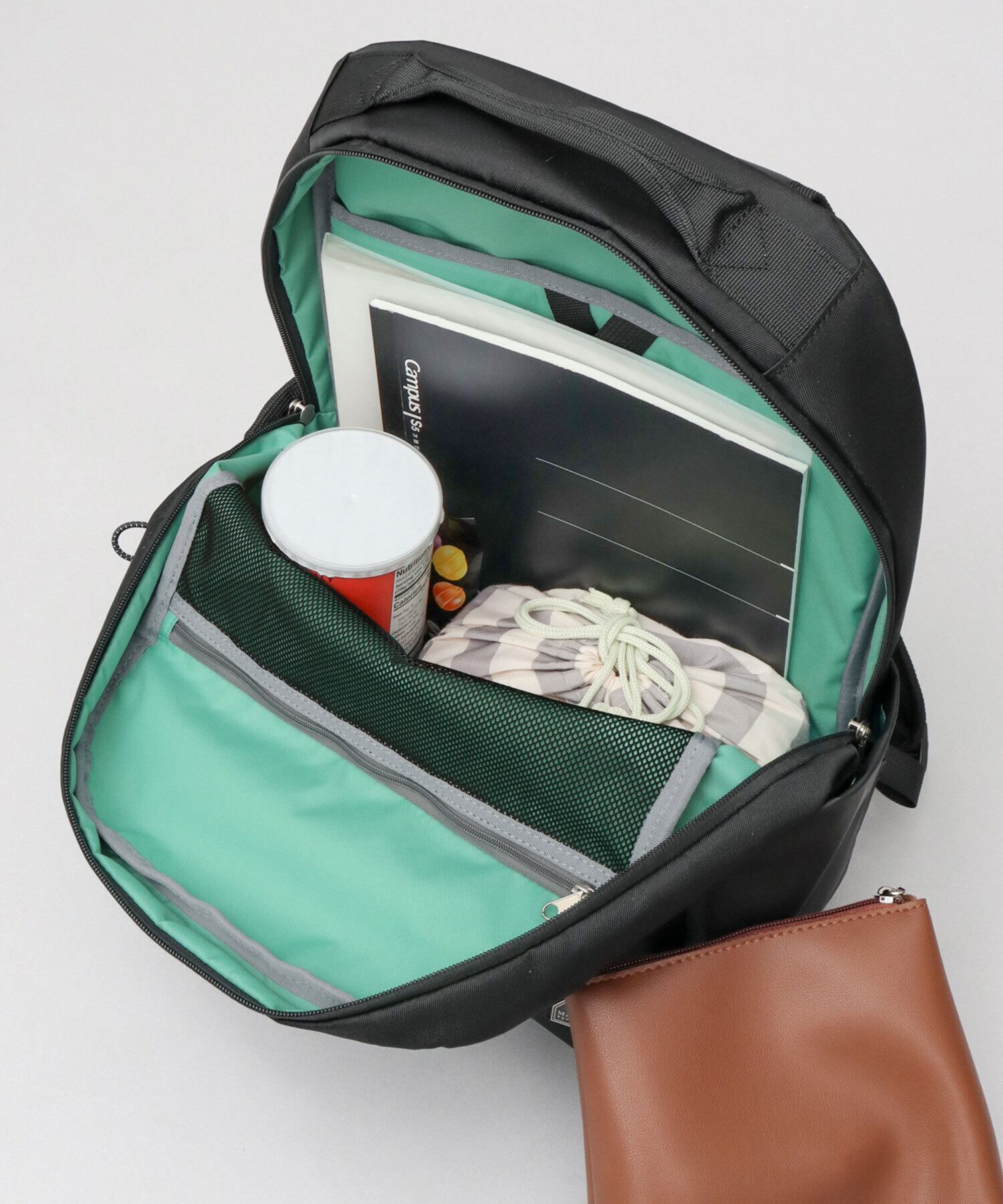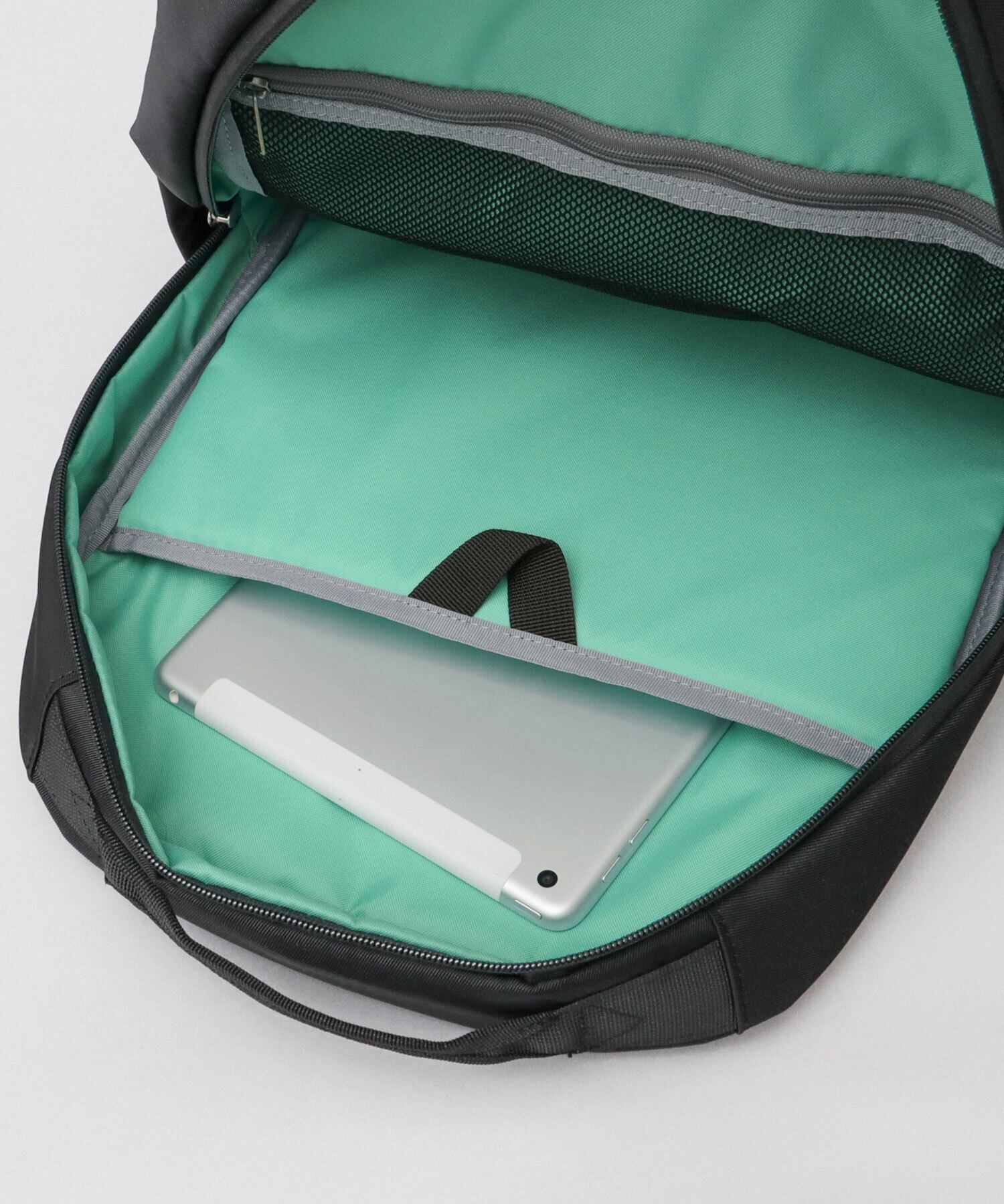 メイン収納スペースは、A4サイズが楽に収まる使い勝手の良いサイズ感。マチ幅をしっかりとった、広々スペース。内側には、ノートPCやタブレットの収納に最適なクッションポケットに加え、視認性の良いファスナー付きメッシュポケットを完備。