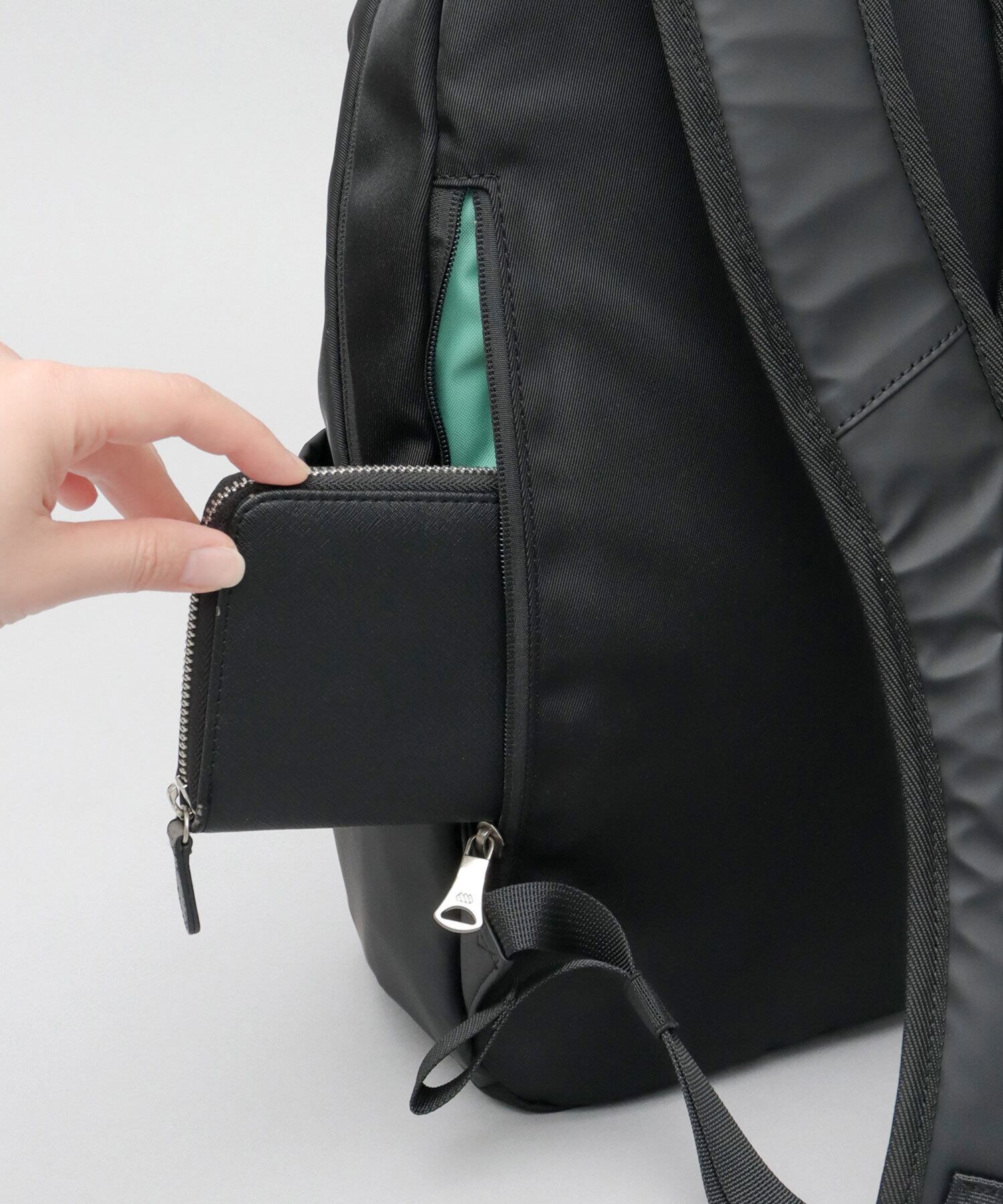背面には、ファスナーポケットを配置。お財布やスマートフォンなどの貴重品を入れる、セキュリティポケットとしての使用も◎