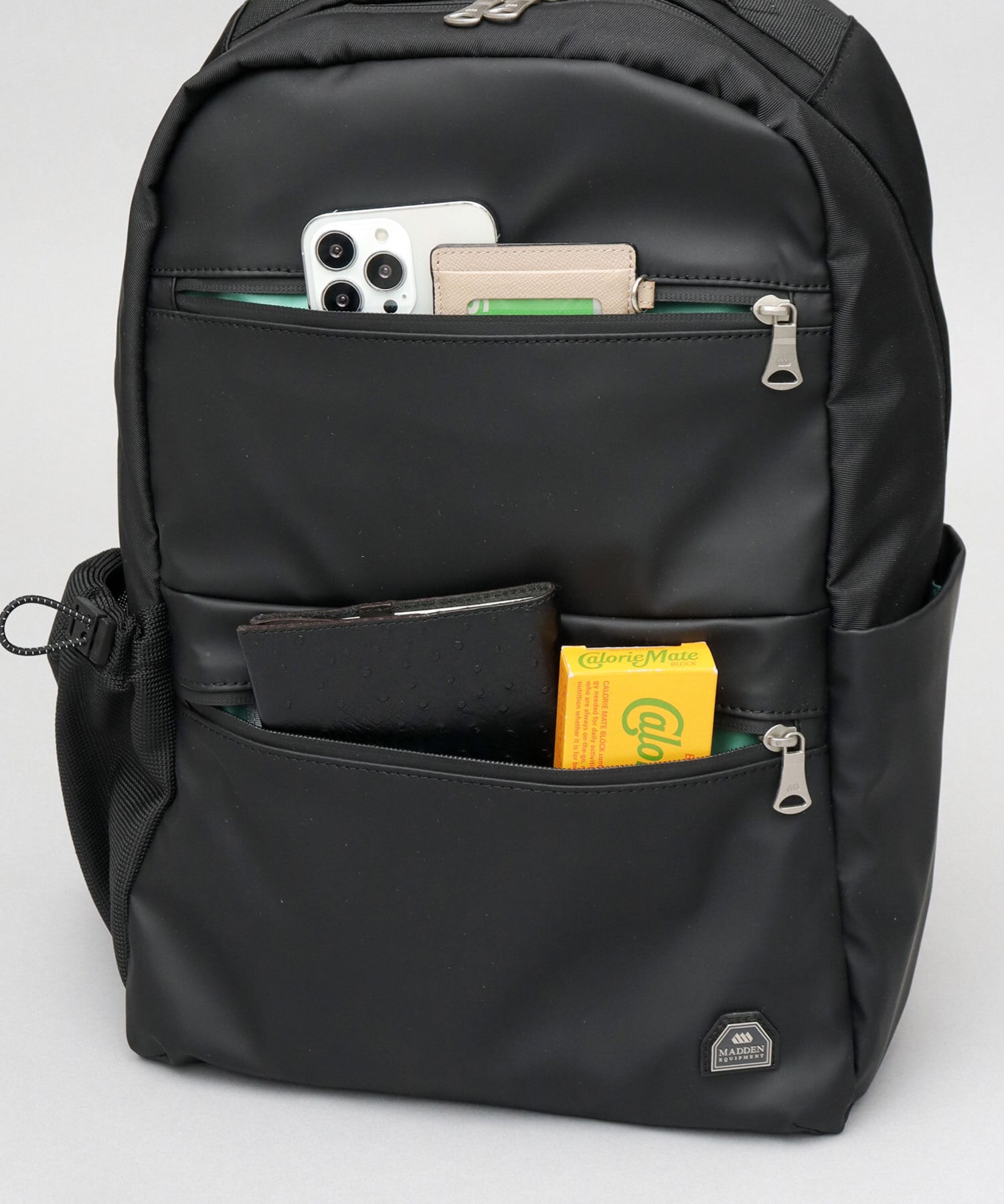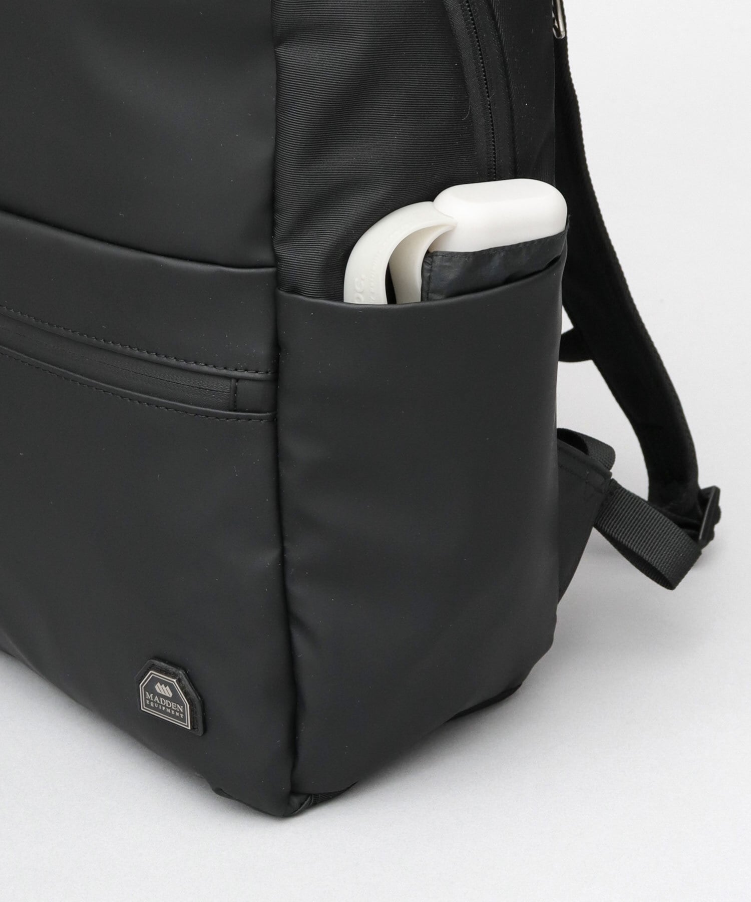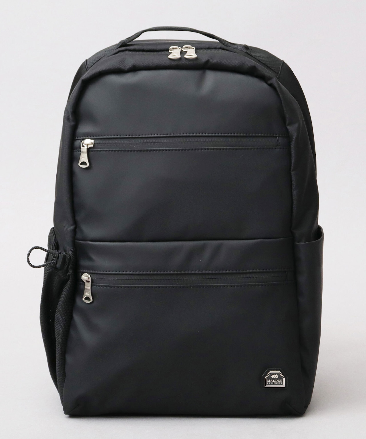 アウトドアフィールドで培ってきたモノづくりの哲学を現代に合わせて再生させたシティプロダクトレーベル、“MADDEN EQUIPMENT”のパックパック。すっきりシンプルな見た目ながら、A4サイズがゆったり収まるデイリーユースしやすいサイズ感。幅のある荷物もすっきり収納可能な、広マチのメイン収納スペース。ドロースリングでボトルの固定ができるメッシュボトルポケットやしっかり厚みのあるクッション材入りのPCスリーブやフロントの2つの止水ファスナーポケットなど、タウンユースしやすい機能を複数完備。普段使いや通勤・通学時にはもちろん、防水性・撥水性に優れた生地を使用しているので、旅行やアウトドアシーンなど、幅広いシーンで使える優秀リュック。