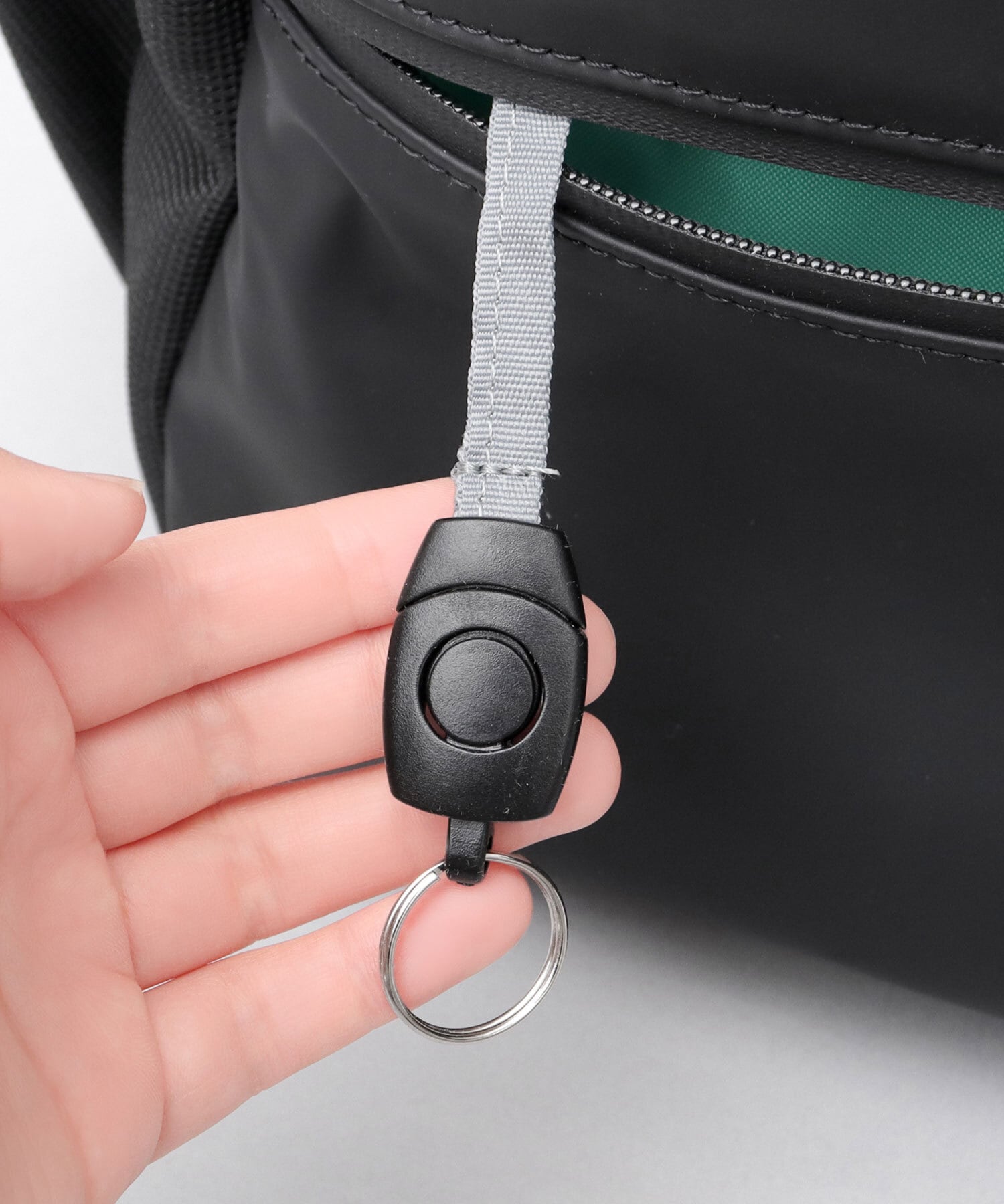 フロント部分、上下に2つの止水ファスナーポケットを配置。下部ポケット内側には、取り外しが可能なバックル付きキーホルダーを完備。