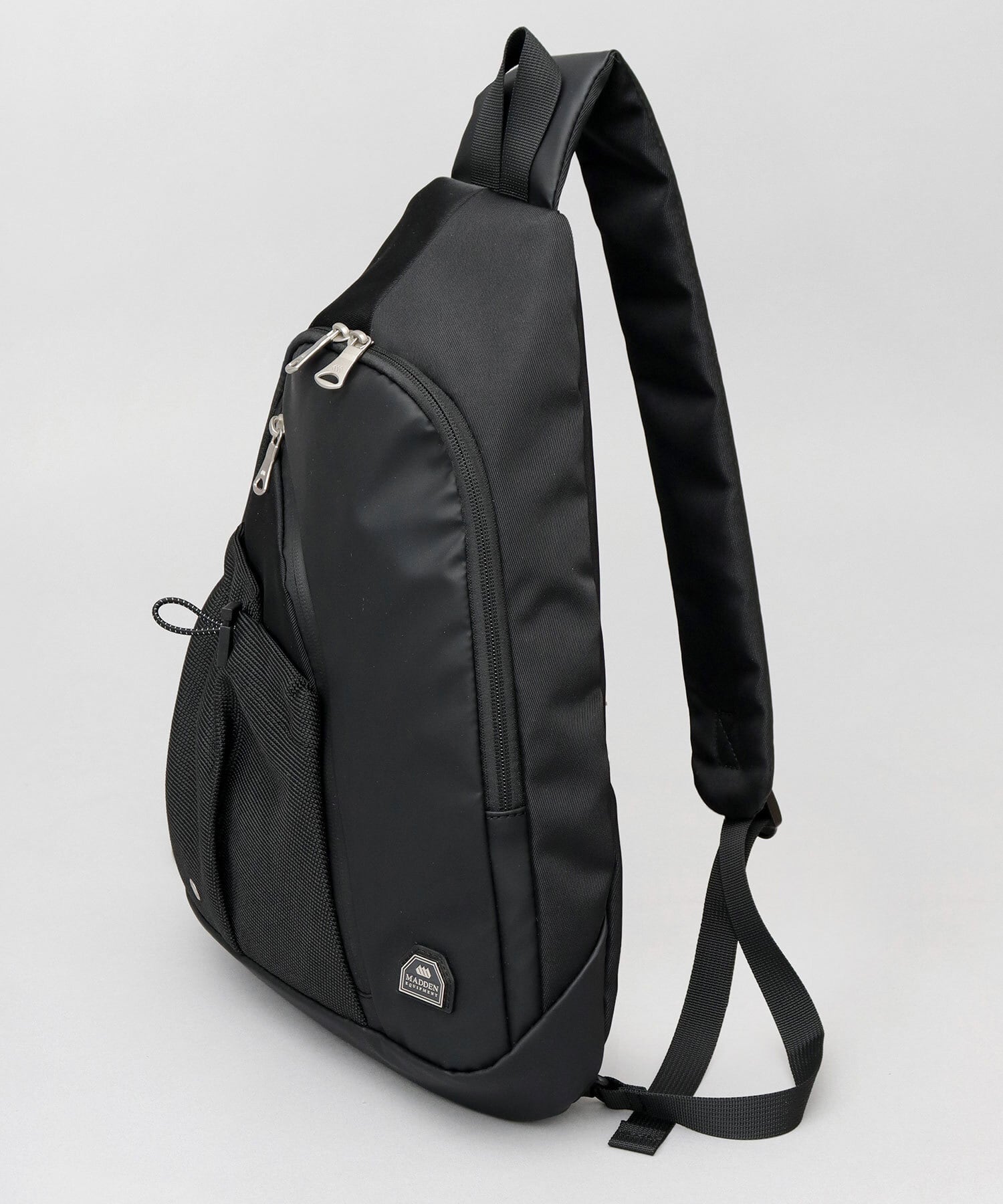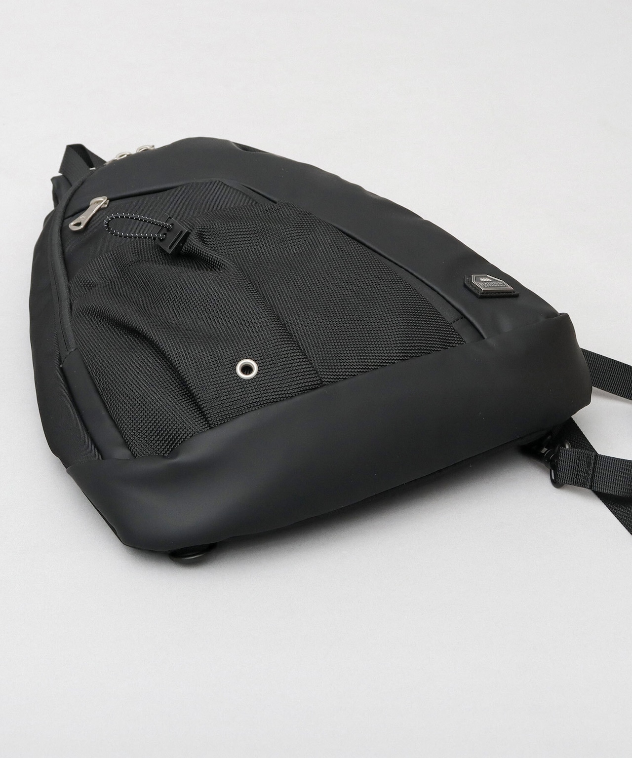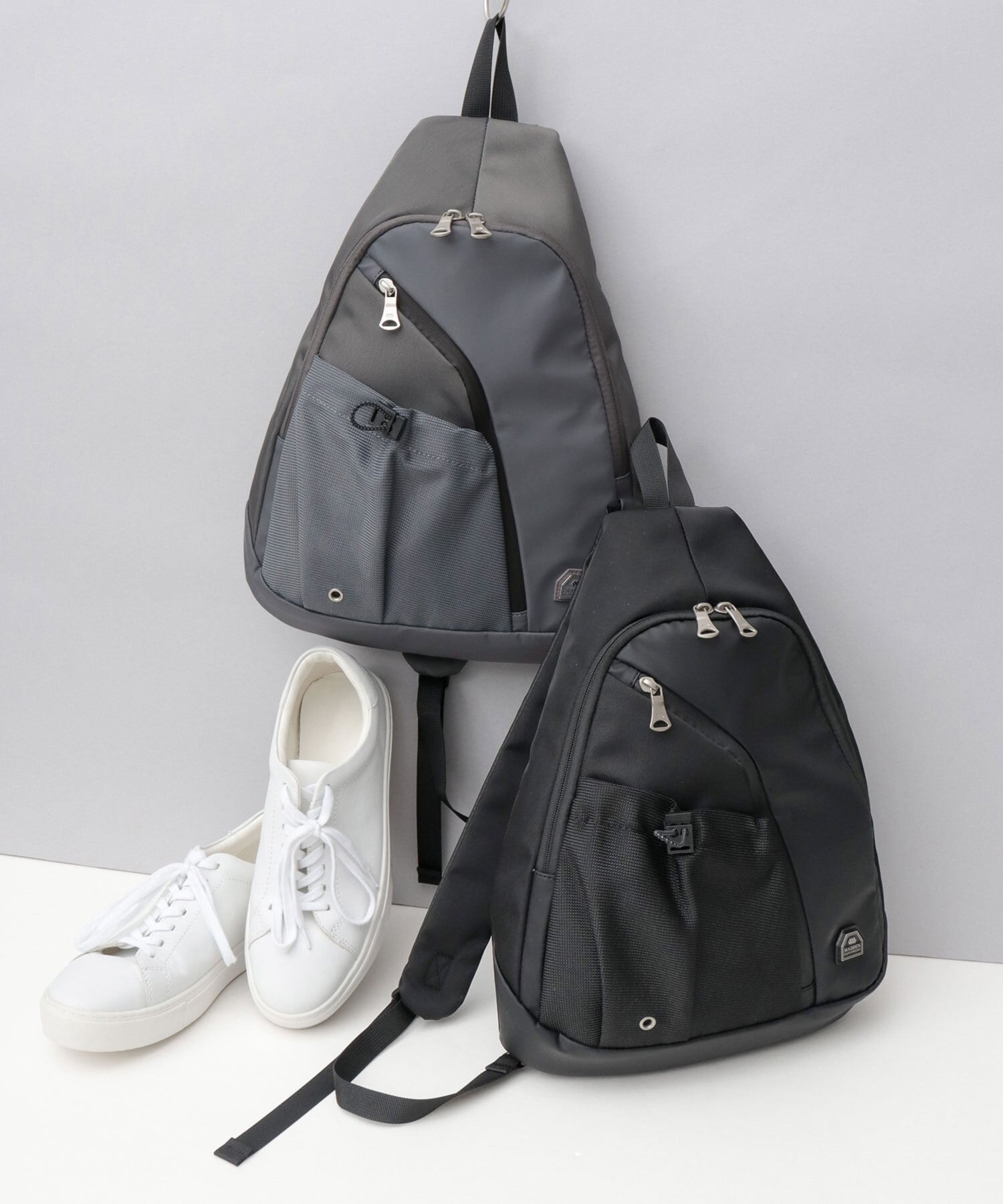 ミリタリーな雰囲気をもちつつ、ワントーンの表現が都会的な印象のEQPKシリーズのワンショルダーバッグ。ワントーンでまとめた素材切替えと、ドローストリング付きのメッシュポケットがデザインポイント。サイドのロゴワッペンがアクセントに。