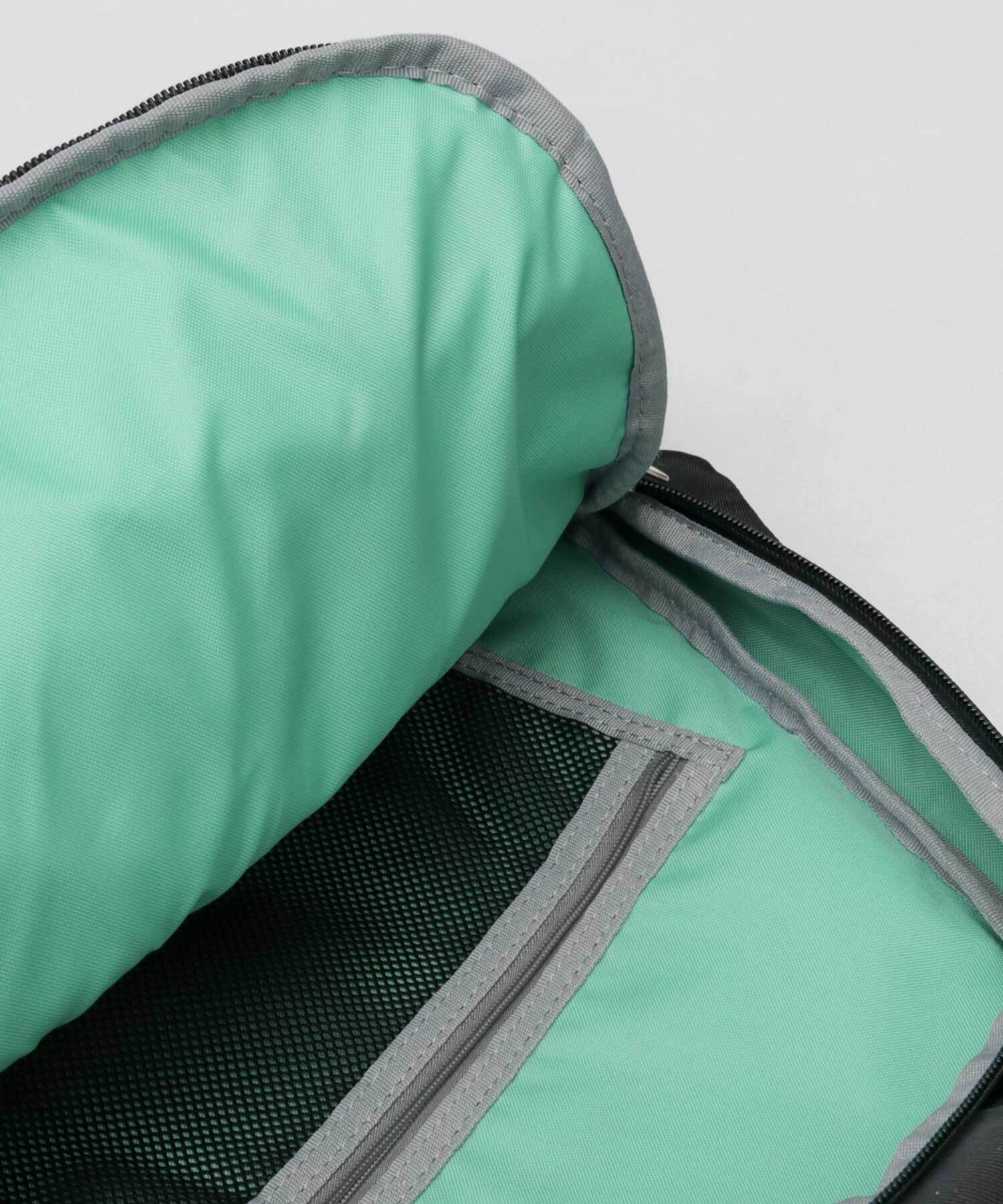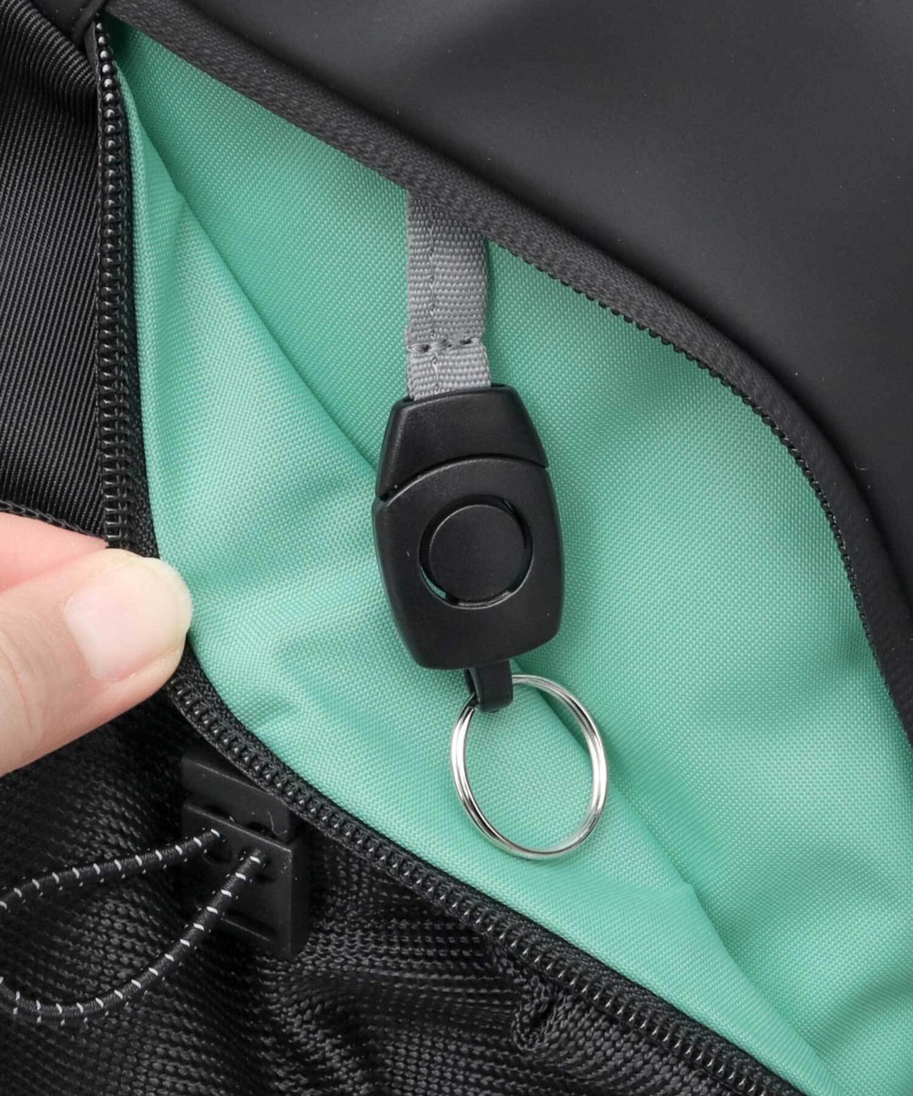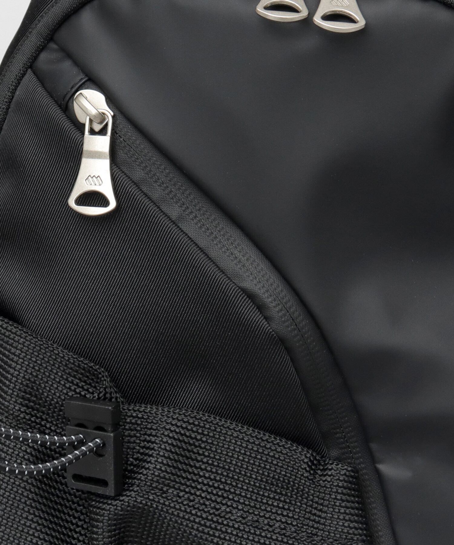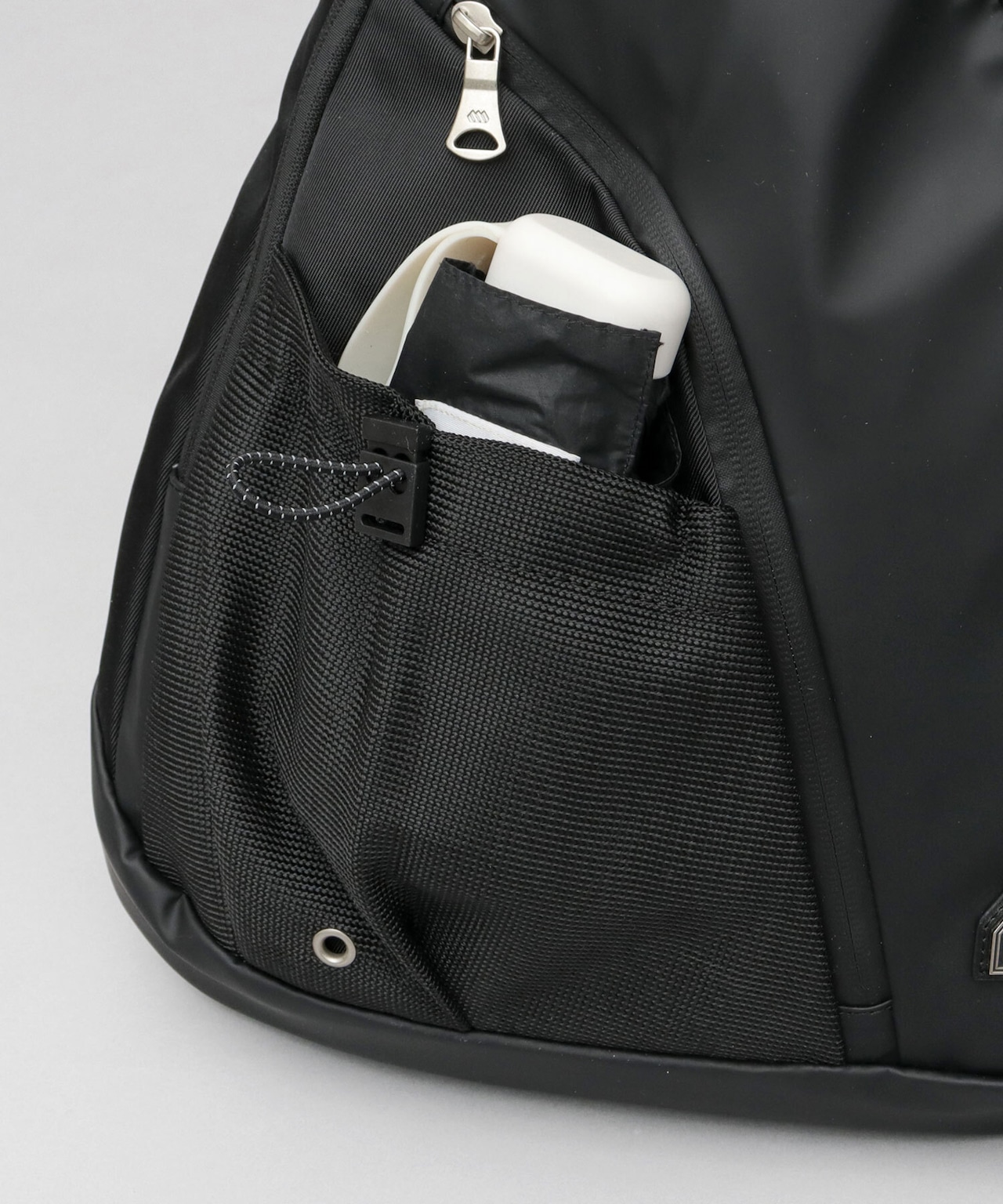 フロント部分には、止水ファスナーポケットを配置。内側には、取り外しが可能なバックル付きキーホルダーを完備。外側には、ペットボトルや折り畳み傘の収納に便利なドローストリング付きメッシュポケットを配置。