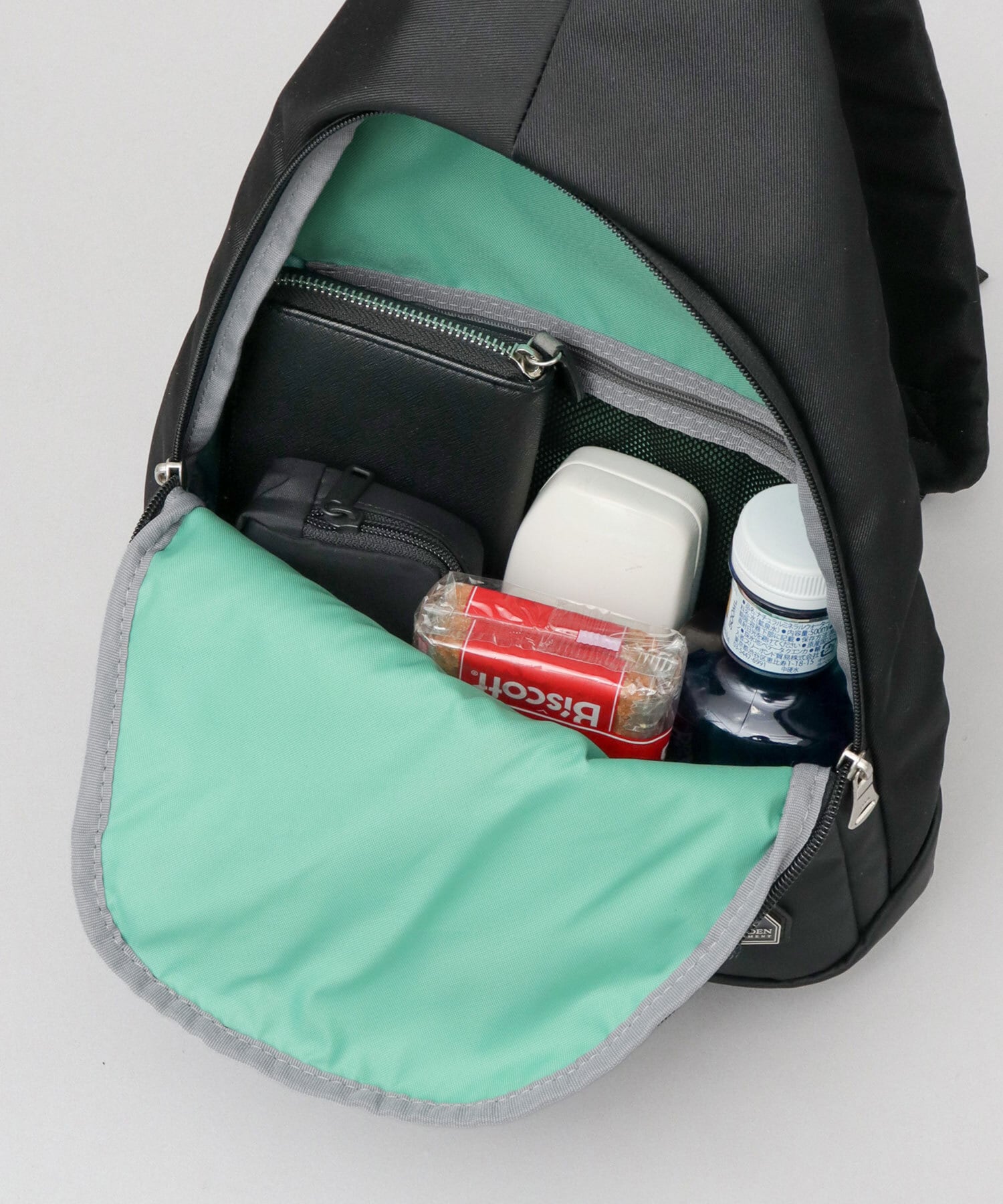 メイン収納スペースは、スマートフォンや長財布に加えて、ポーチなどもしっかり収納可能な使い勝手の良いサイズ感。内側には、視認性の良いファスナー付きメッシュポケットを完備。