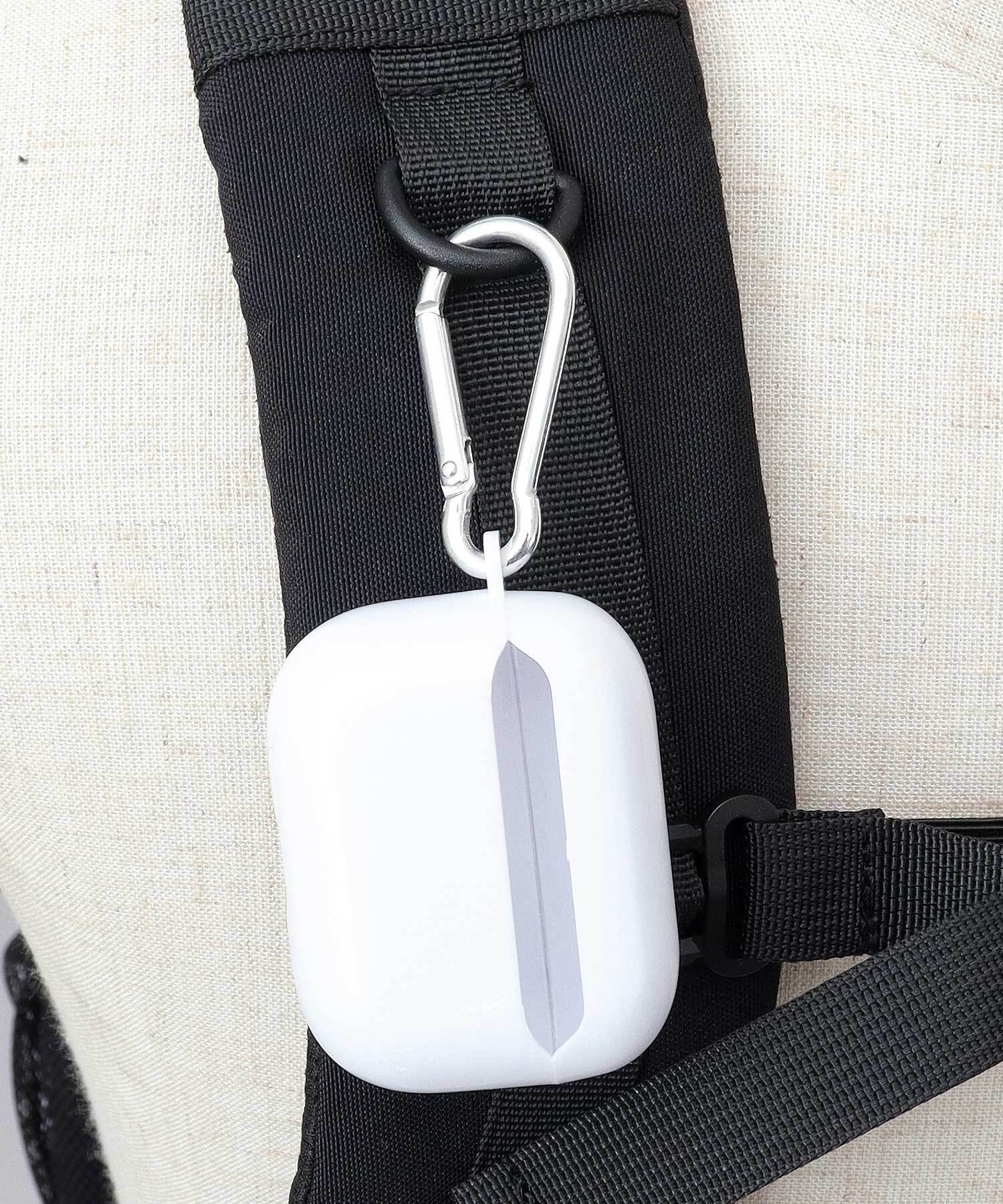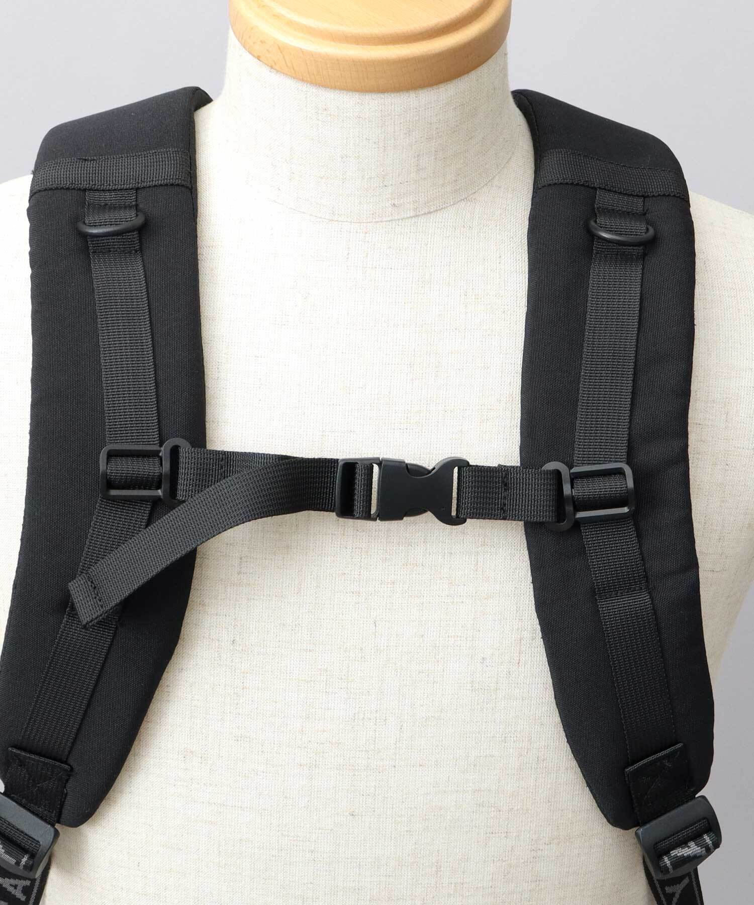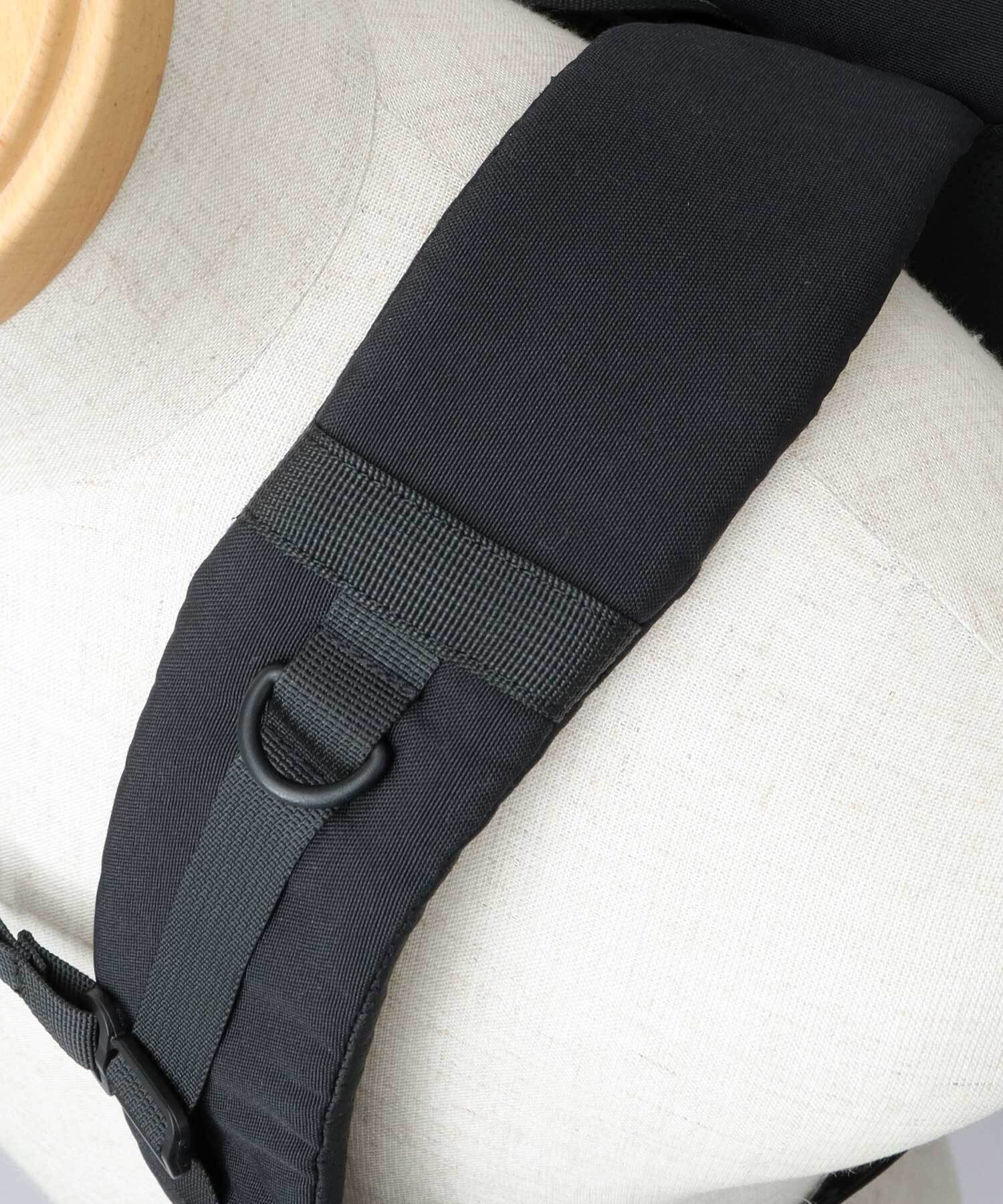 ショルダーベルトは幅広の設計で背負いやすく、肩への負担を軽減。上下に位置調節が可能なハーネス(チェストベルト)を完備しているので、しっかり固定できます。Dカンには、キーホルダーなどの取り付けが可能。