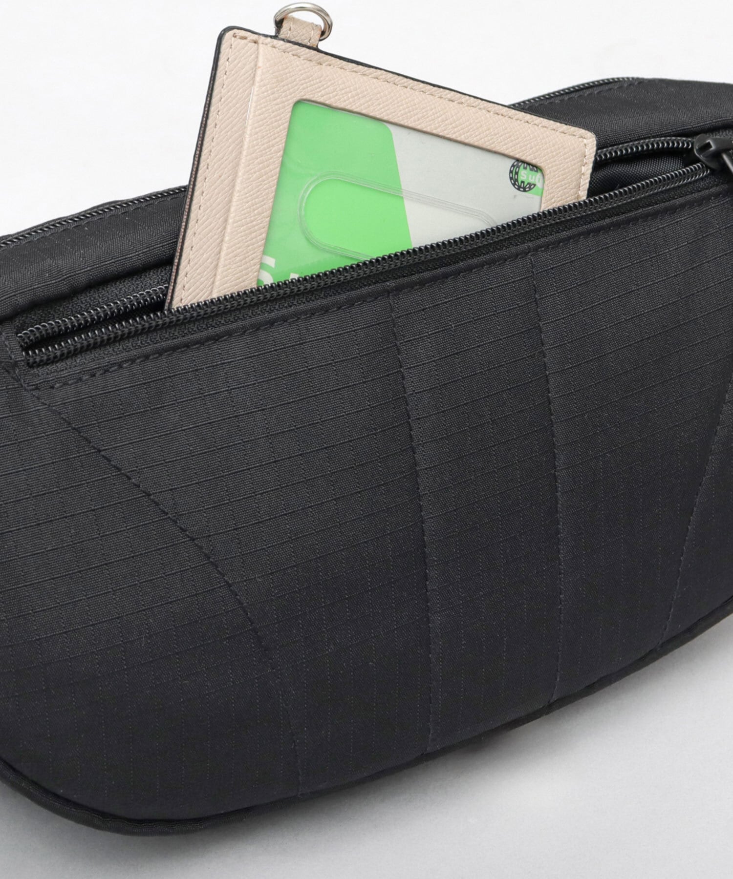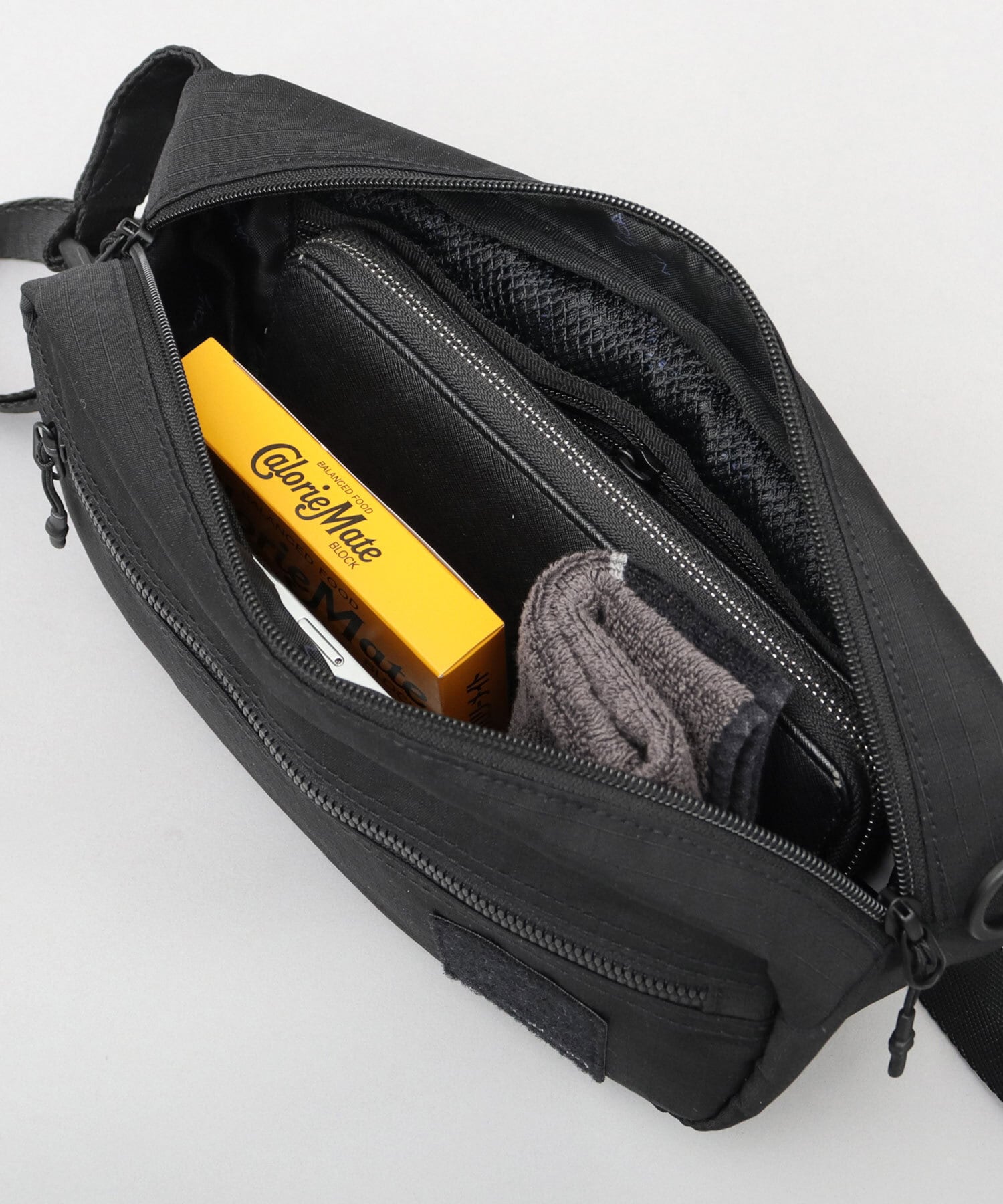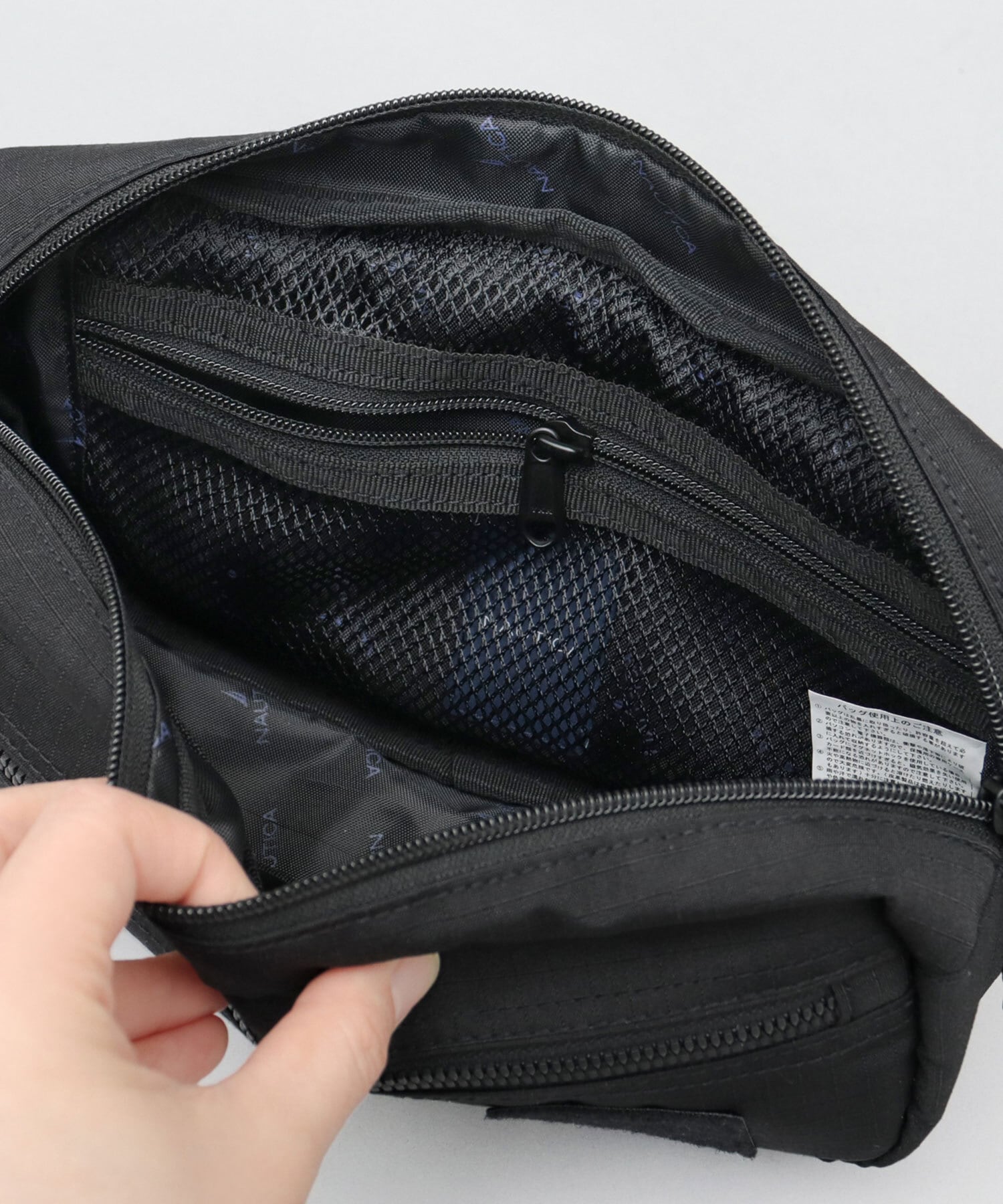 メイン収納スペースは、普段使いの小物をスマートに収納可能なスペースを確保。内側には、視認性の良いファスナー付きメッシュポケットに加え、仕分けに便利なオープンポケット×2を完備。鍵などの取り付けに便利なDカン付き。