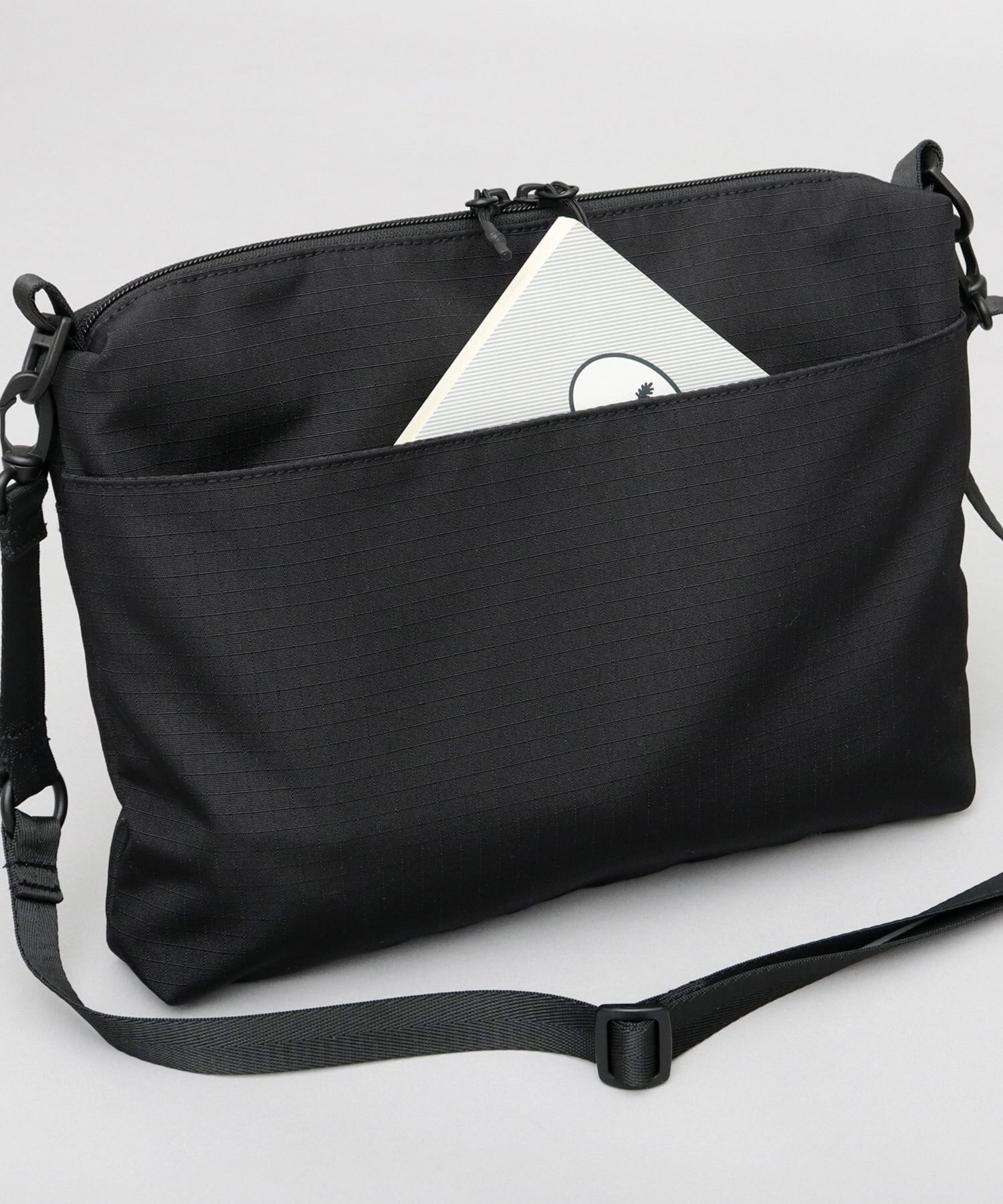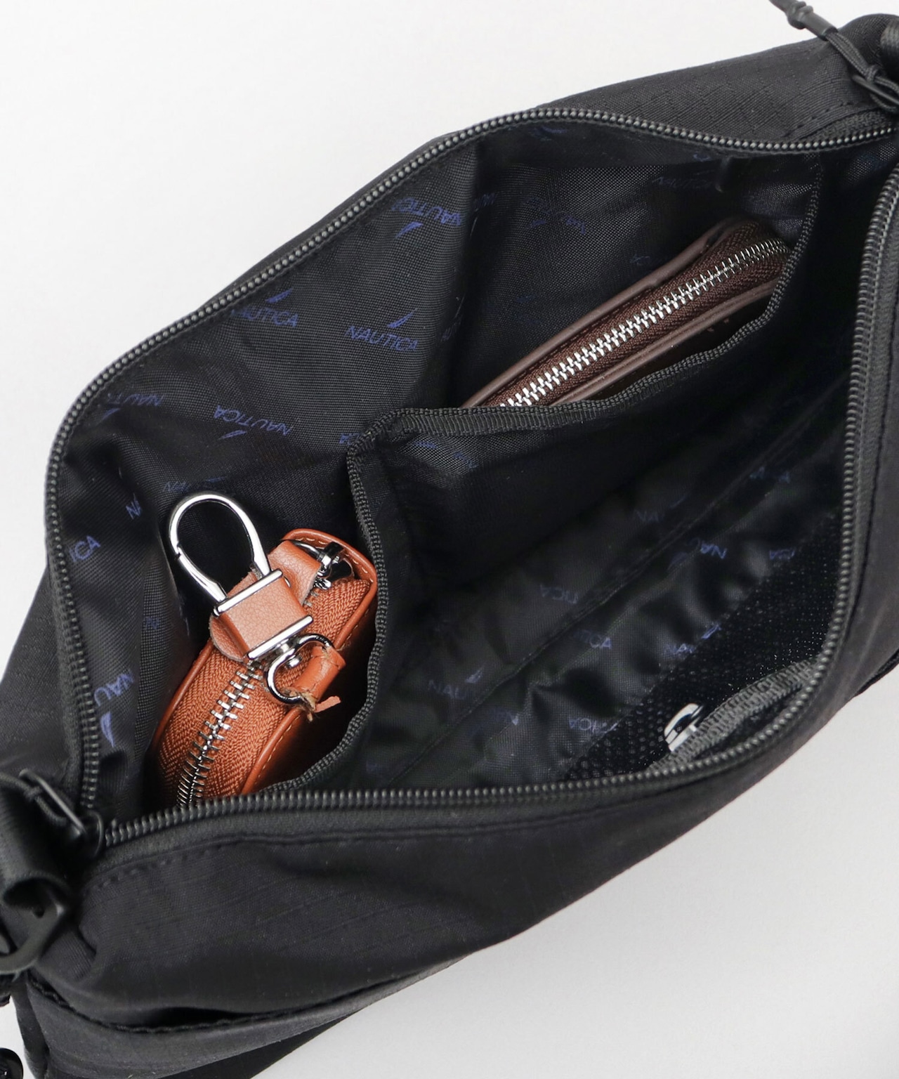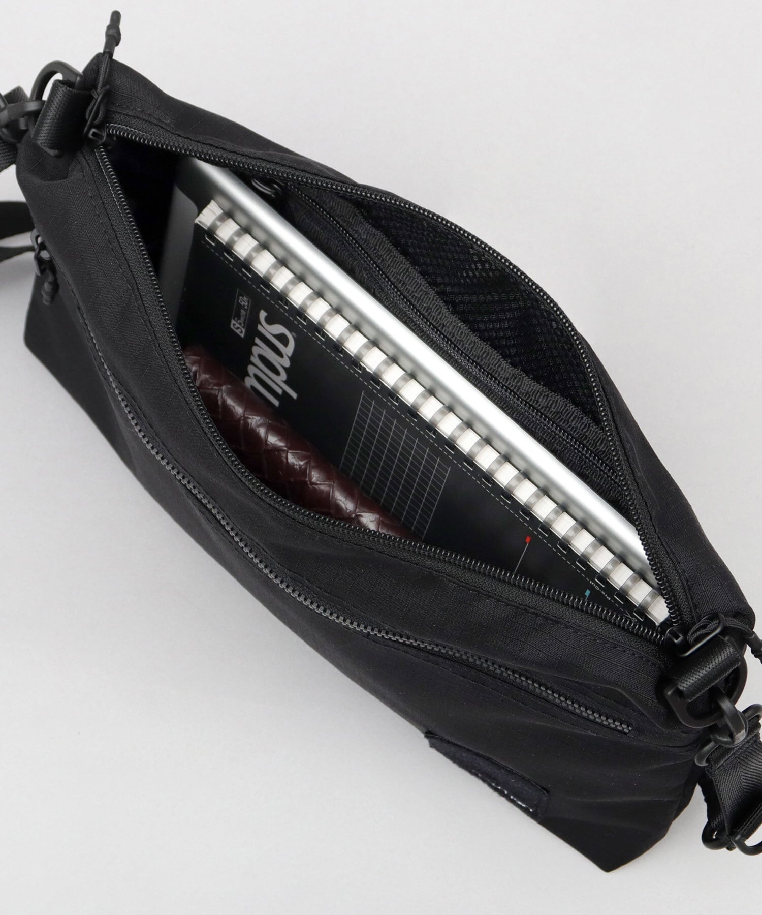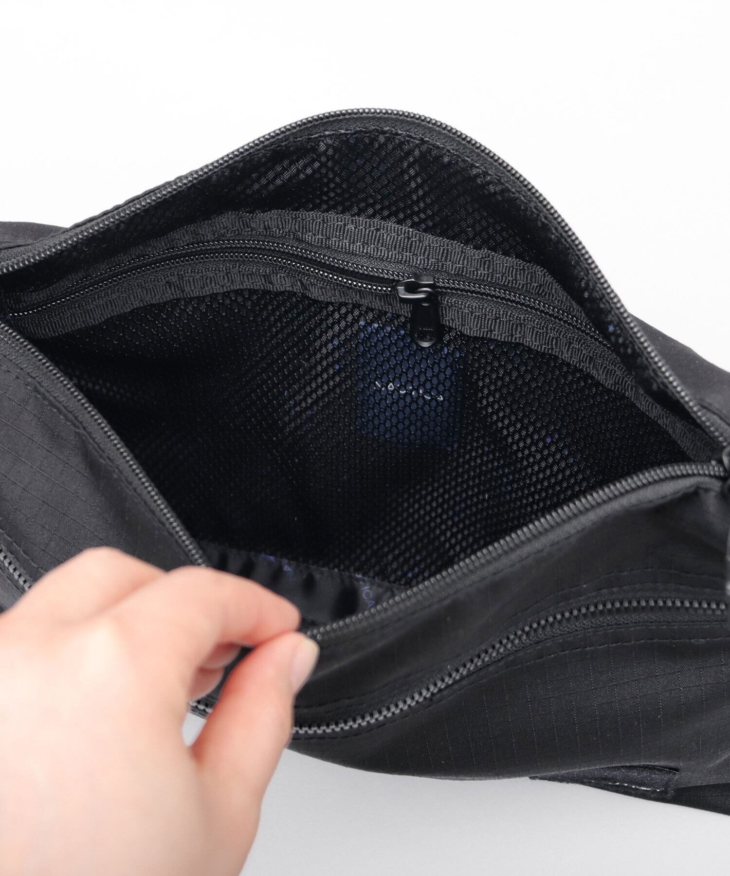 メイン収納スペースは、A5サイズが楽に収まるサイズ感。内側には、視認性の良いファスナー付きメッシュポケットに加え、仕分けに便利なオープンポケット×2を完備。鍵などの取り付けに便利なDカン付き。