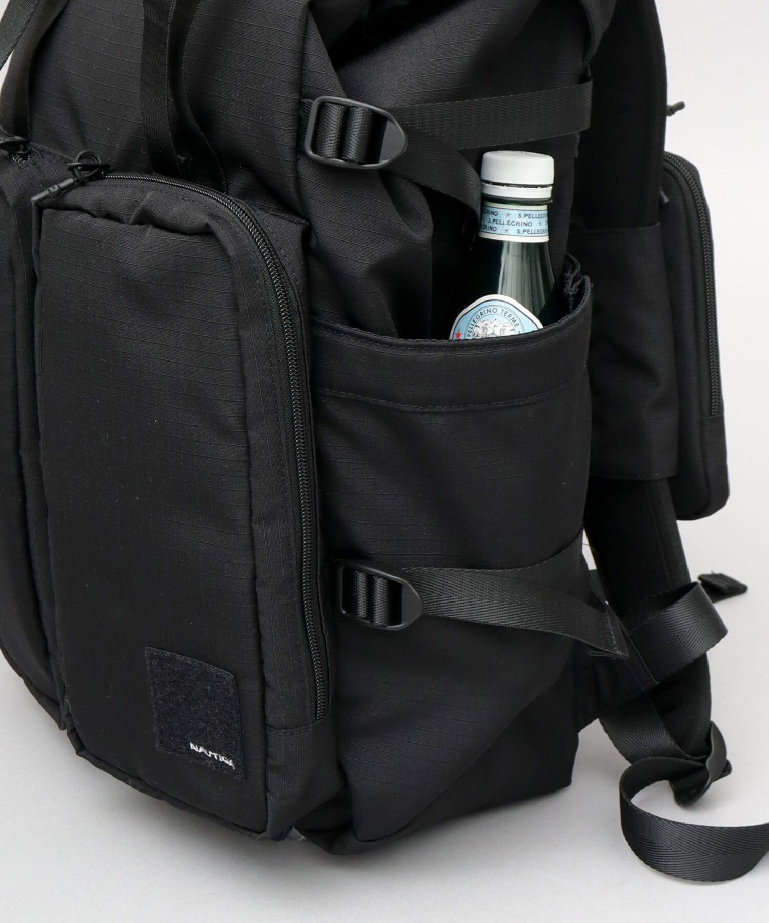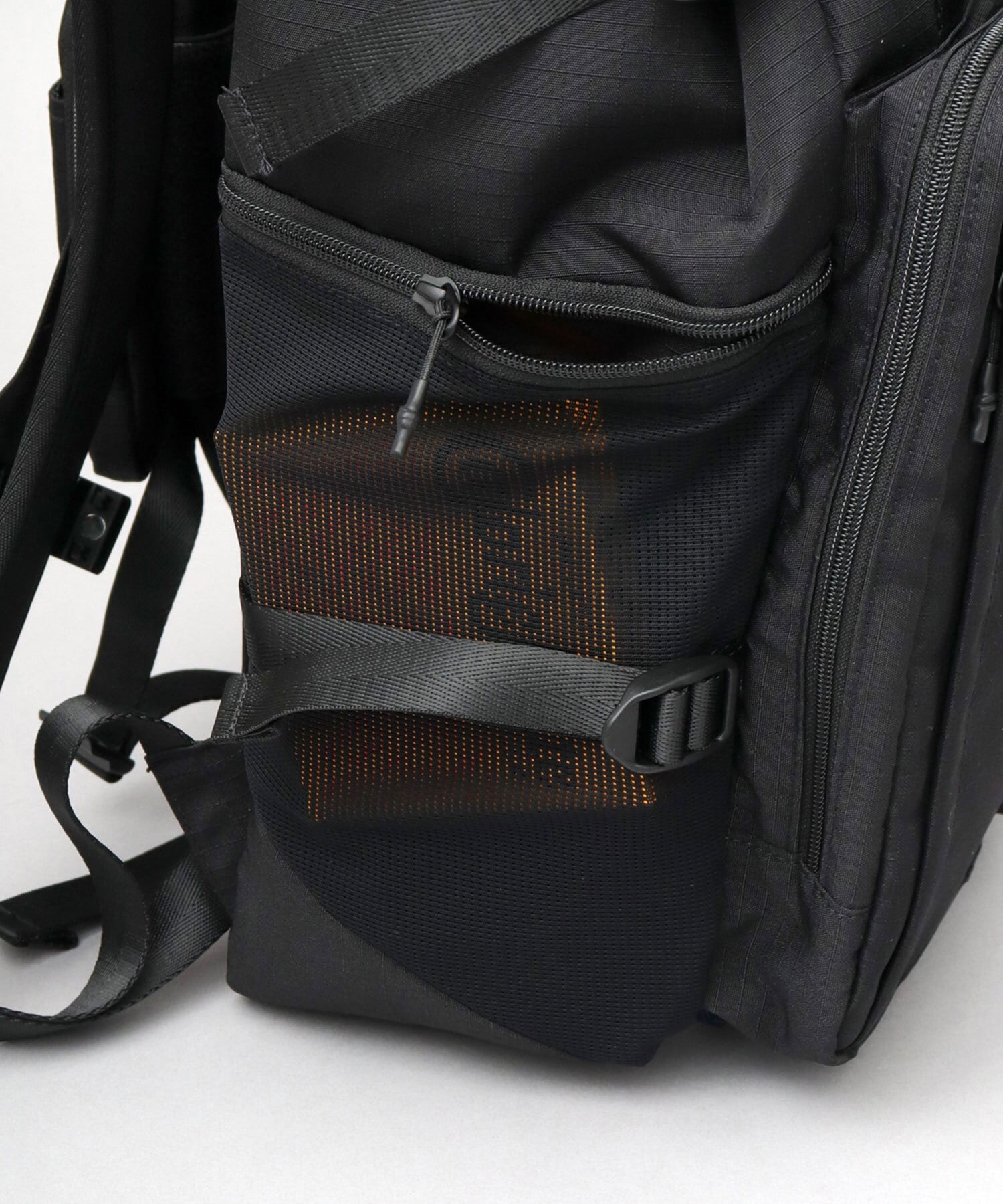 サイドには、ファスナー付きメッシュポケットとオープンポケットを配置。