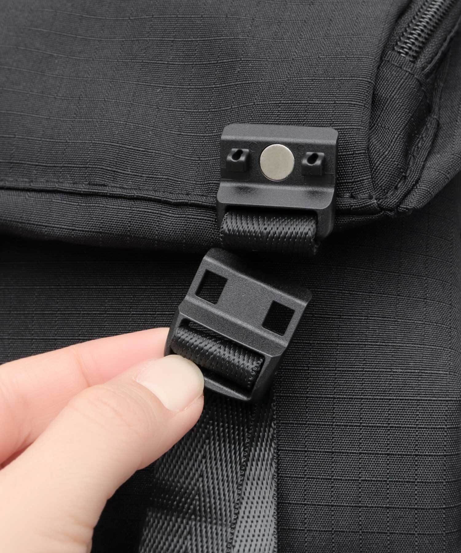 フラップトップの開閉は、ワンタッチで開閉が可能なマグネットバックル仕様。フラップ上部に前掛けした際も荷物の出し入れがしやすい、ファスナーポケットを配置。