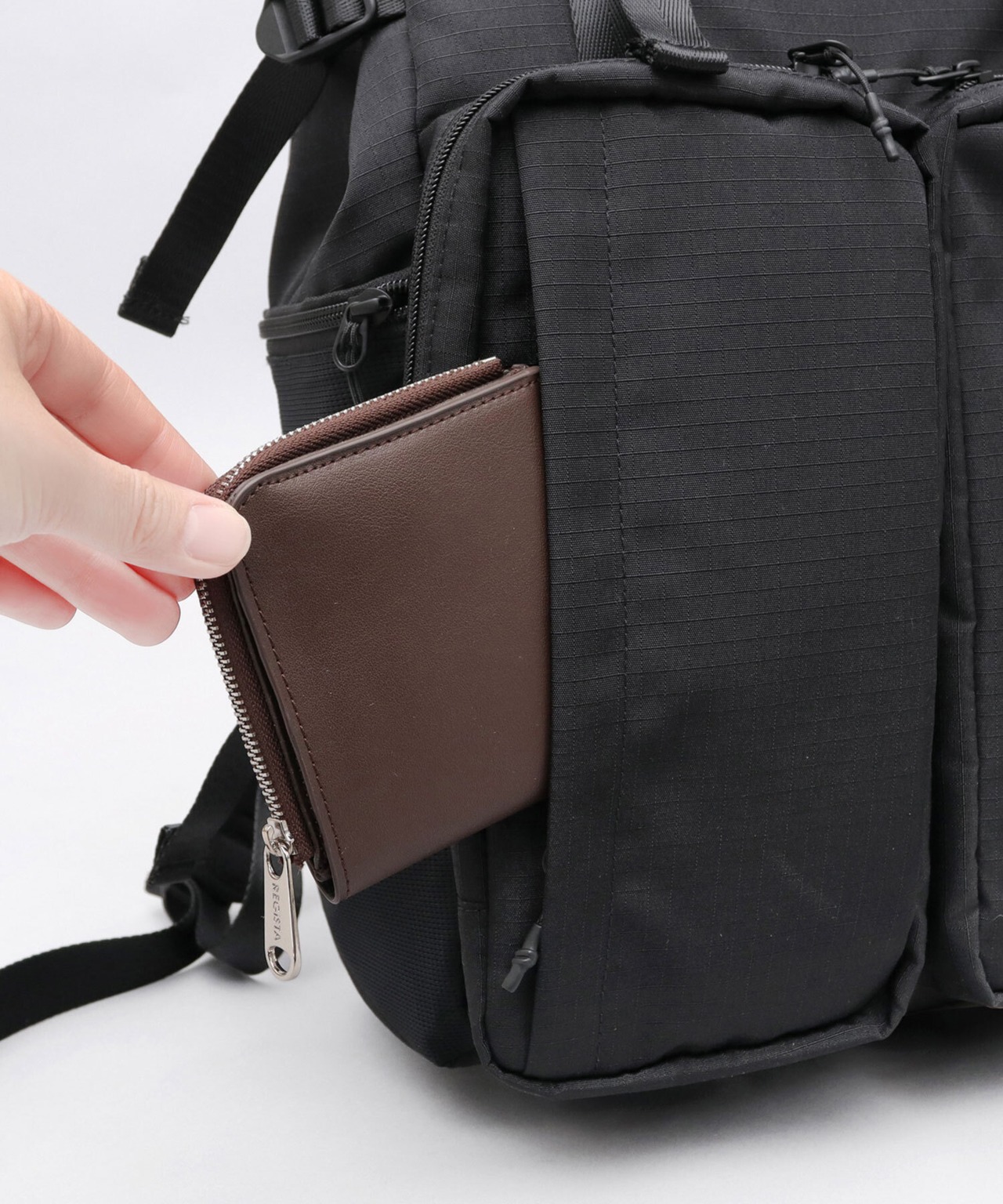 リップストップ風の生地を使用した、程よいミリタリー感がスタイリングのアクセントになります。内部と直結している背面ファスナーが付いているので、フラップ部分を開ける事なく、簡単に荷物の出し入れが出来ます。普段使いはもちろん、通勤・通学用、旅行バッグなどにもおすすめ。男女問わず使えるので、プレゼントにもおすすめです。