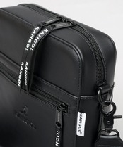 直線的なスクエアシルエットがスタイリッシュな雰囲気のボックス型ショルダーバッグ。型押しのブランドロゴと、サイドに配置したホワイトのピスネームがさりげないポイントに。