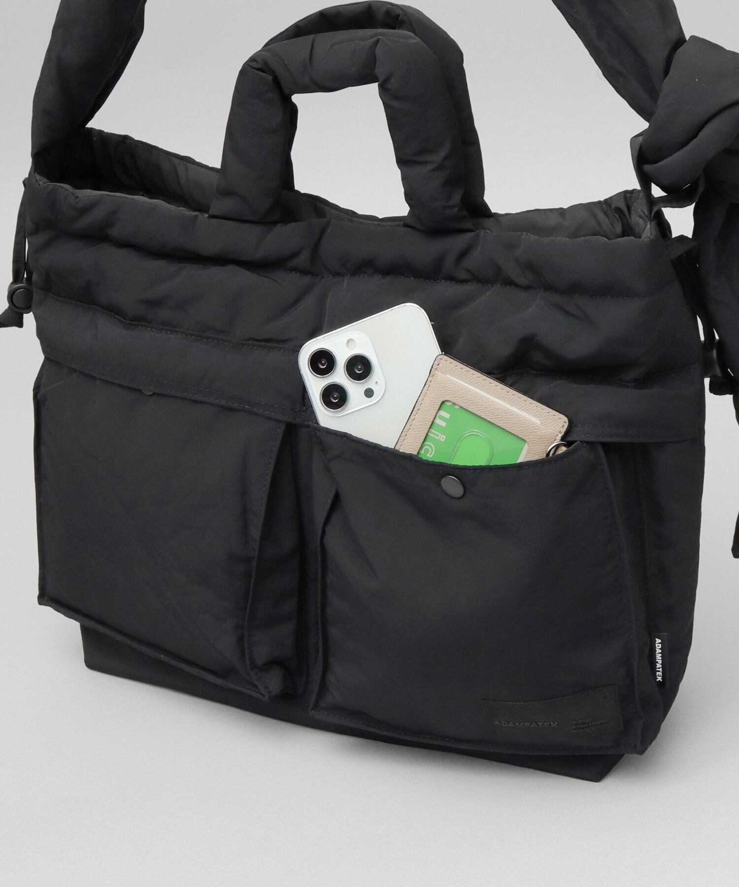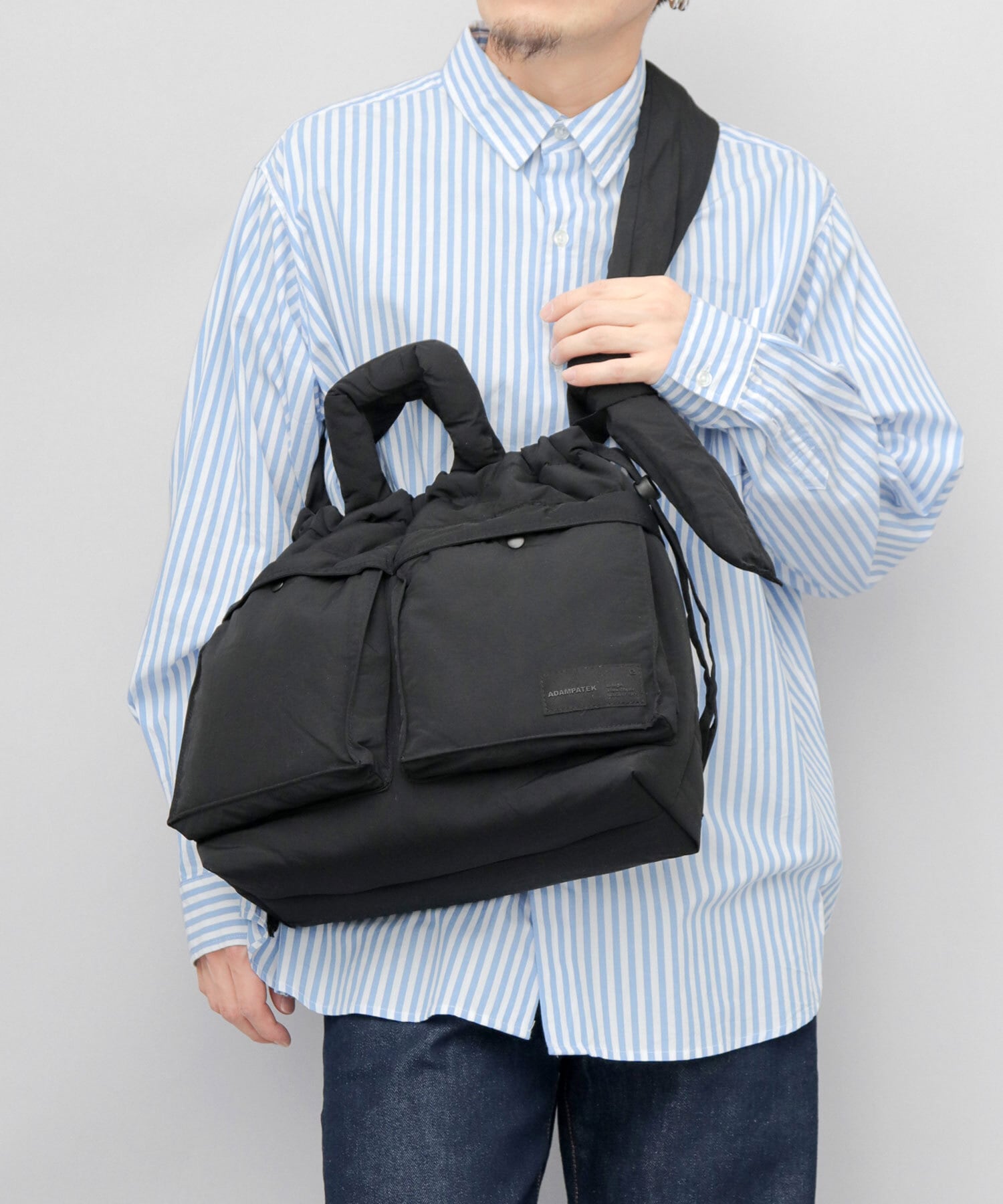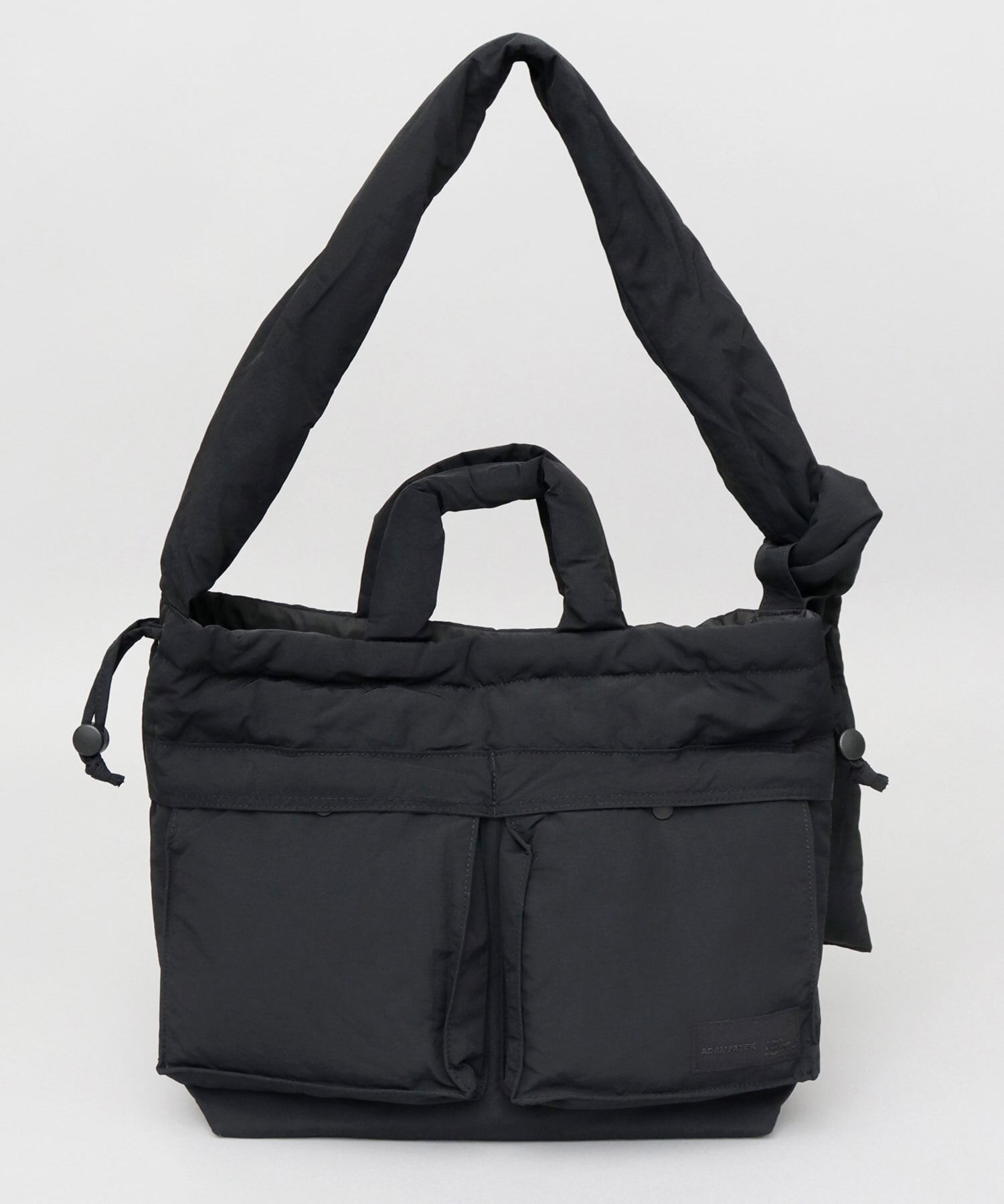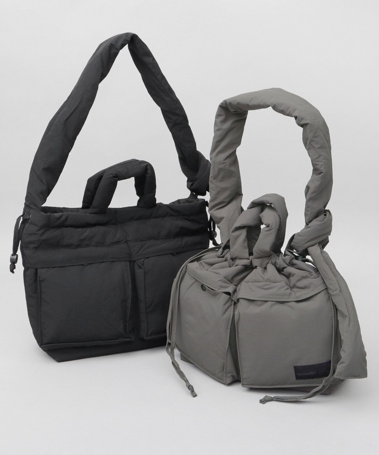 柔軟な発想による、ニューベーシックなデザインが特徴のブランド“ADAM PATEK(アダム パテック)”のパデッド巾着ヘルメットバッグ。シャリ感のあるナイロンを使用したパデッド生地は、通年使える表情と、圧倒的な軽量性がポイント。ヘルメットバッグと巾着バッグのデザインを兼ね備えたユニークなデザイン性が特徴。収納スペースは、A4サイズがぴったり収まるサイズ感。しっかり底マチもあるので、幅のある荷物も収納可能で普段使いにぴったり。デザインポイントでもある2つのフロントポケットや、複数の内ポケット、撥水可能された素材使いなど、デザイン性と実用性を兼ね備えた仕上がりです。絞ってシルエットが変えられる間口の仕様や、結び目位置で長さを調節できるショルダーベルト、などコーデや気分に合わせて使い分けが楽しめます。