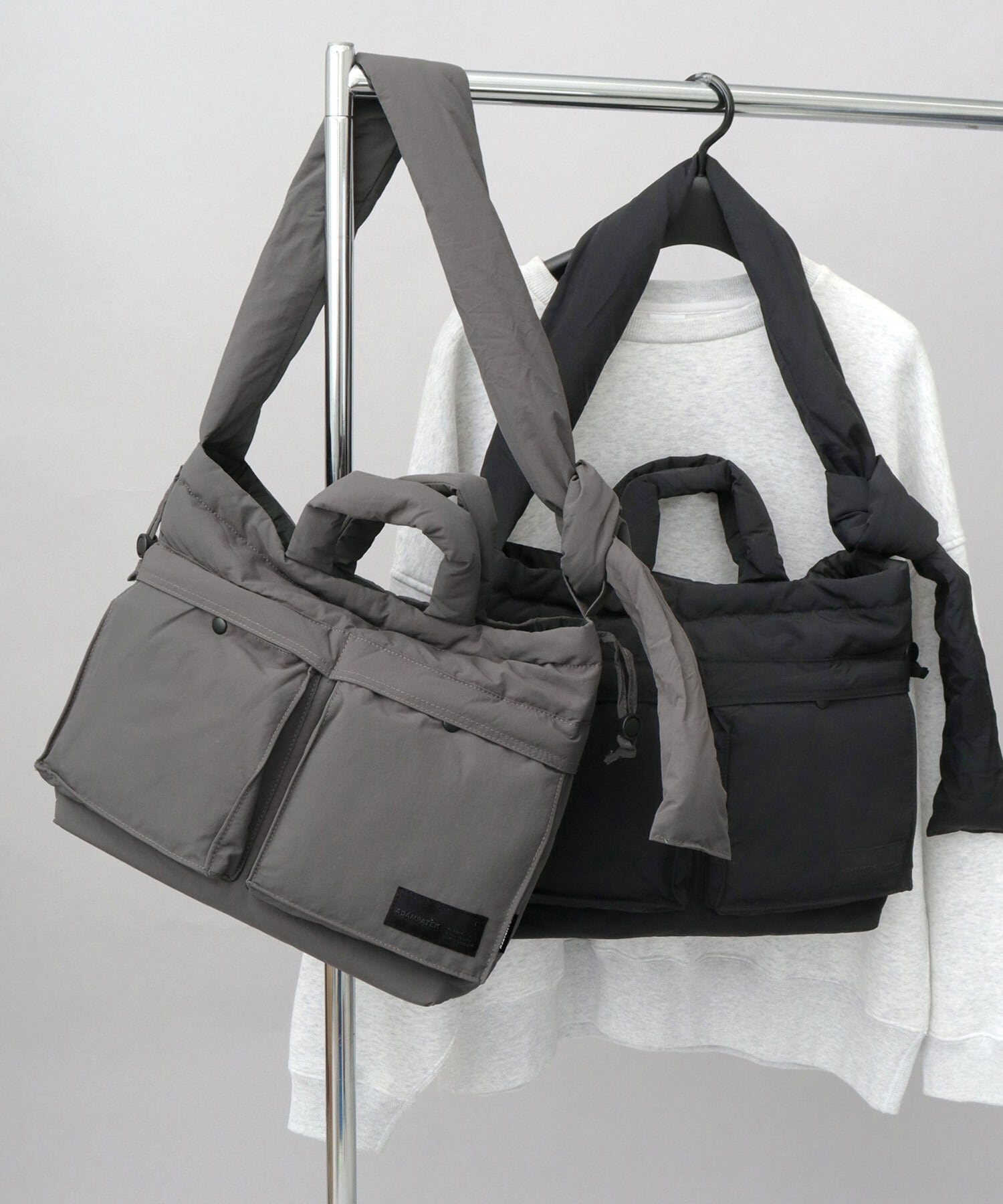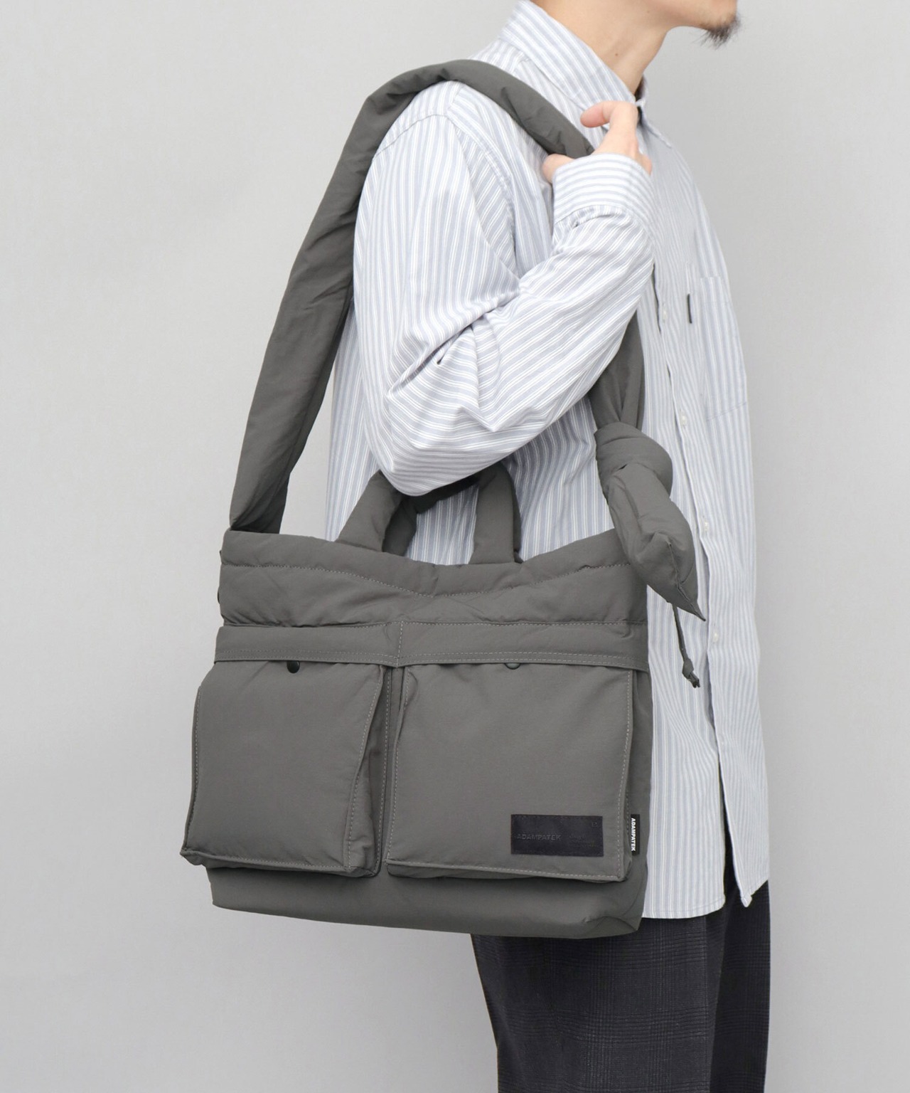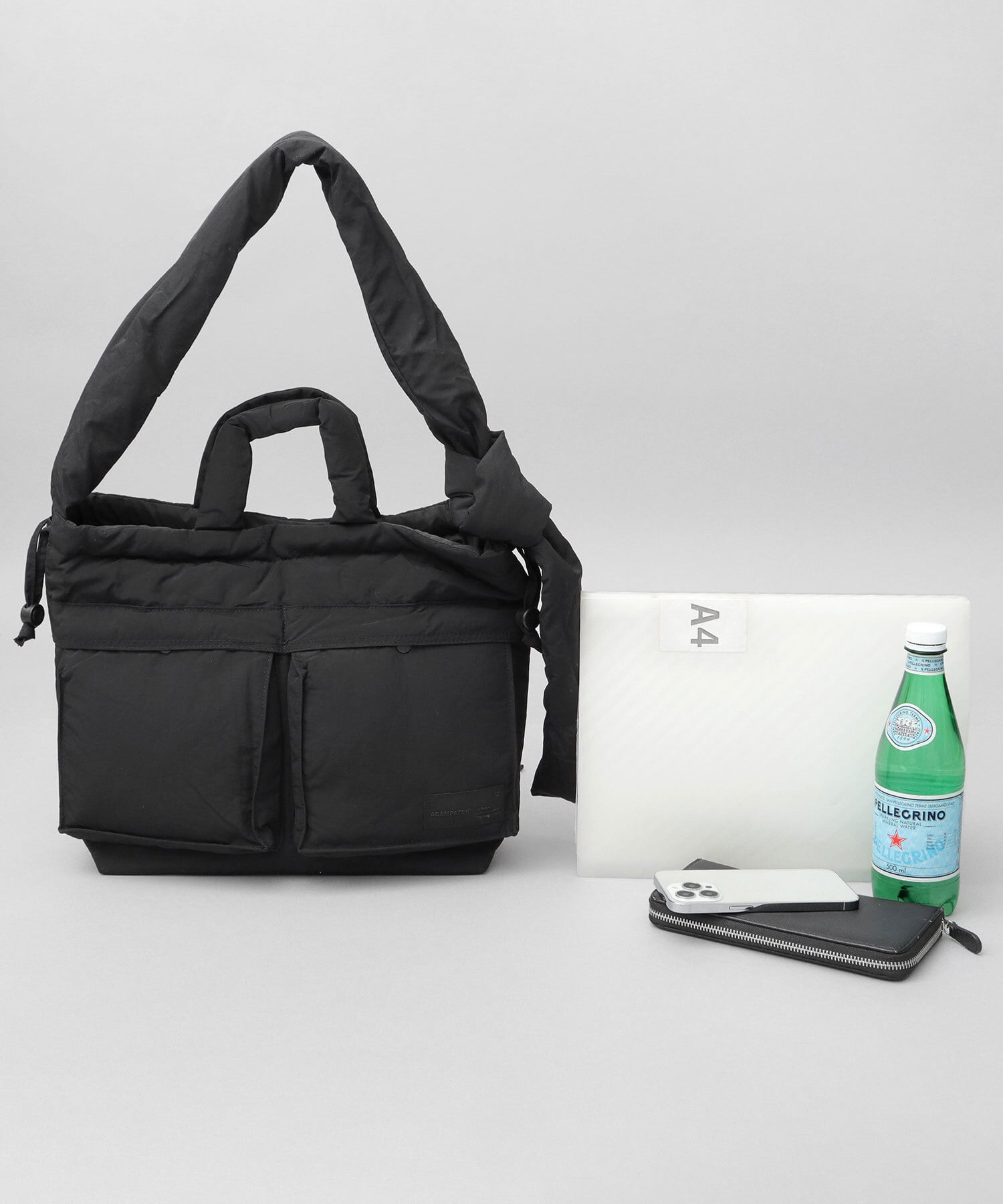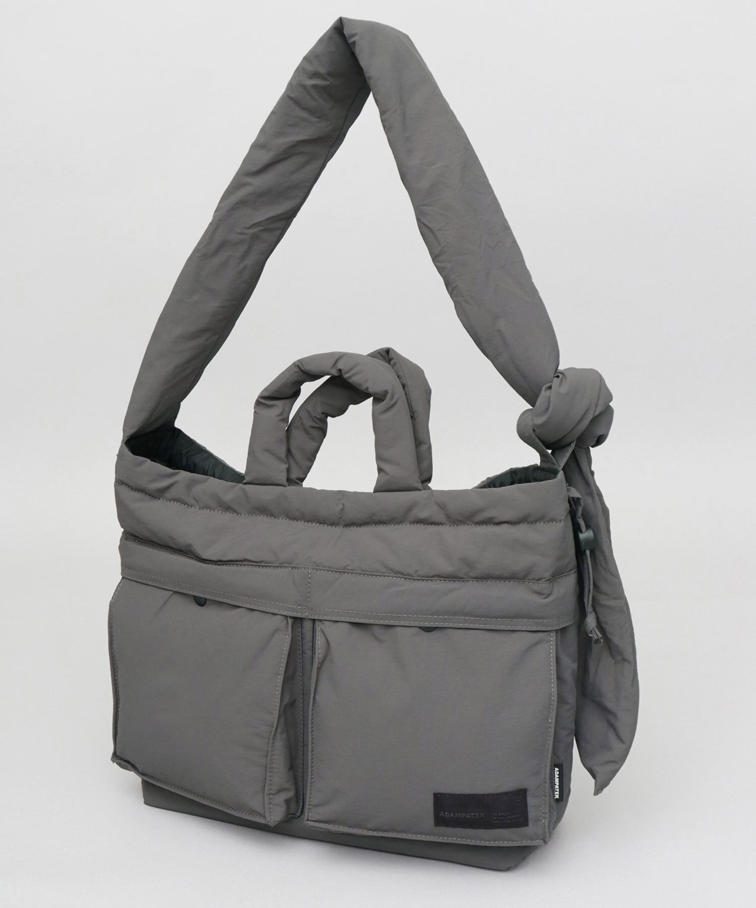 柔軟な発想による、ニューベーシックなデザインが特徴のブランド“ADAM PATEK(アダム パテック)”のパデッド巾着ヘルメットバッグ。シャリ感のあるナイロンを使用したパデッド生地は、通年使える表情と、圧倒的な軽量性がポイント。ヘルメットバッグと巾着バッグのデザインを兼ね備えたユニークなデザイン性が特徴。収納スペースは、A4サイズがぴったり収まるサイズ感。しっかり底マチもあるので、幅のある荷物も収納可能で普段使いにぴったり。デザインポイントでもある2つのフロントポケットや、複数の内ポケット、撥水可能された素材使いなど、デザイン性と実用性を兼ね備えた仕上がりです。絞ってシルエットが変えられる間口の仕様や、結び目位置で長さを調節できるショルダーベルト、などコーデや気分に合わせて使い分けが楽しめます。