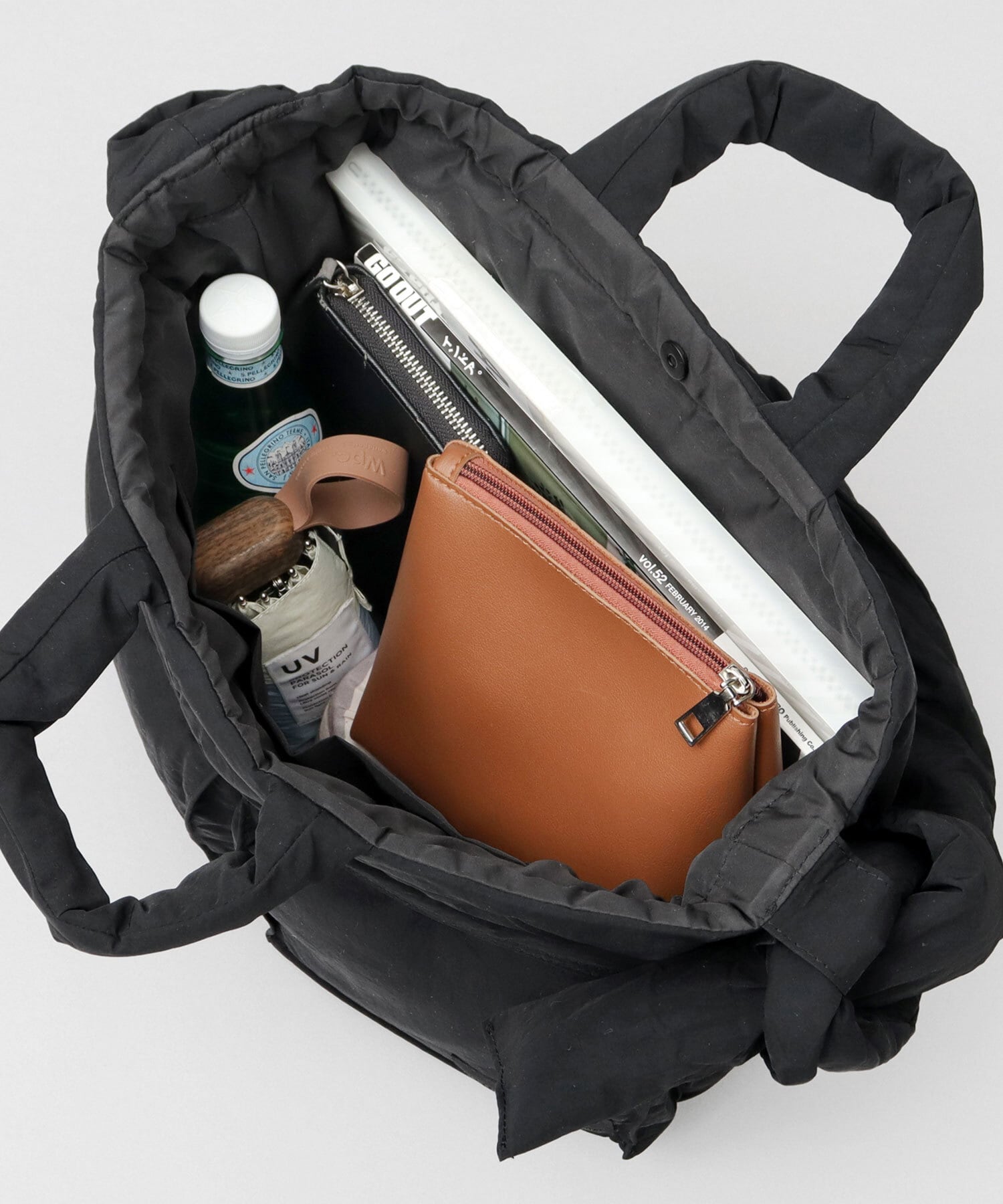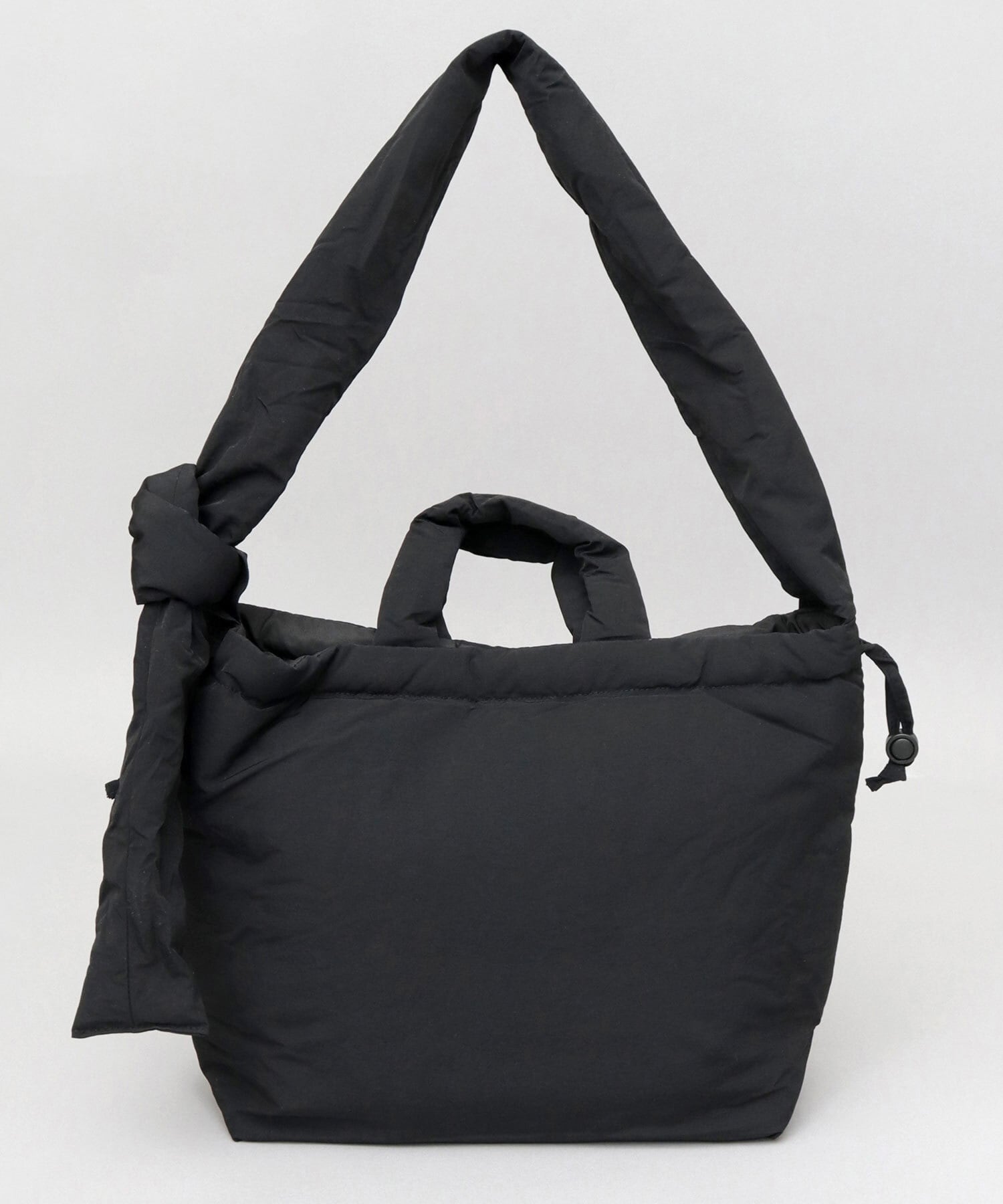ふっくらパデッド生地のボリューム感がスタイリングにヌケ感とトレンド感をプラスしてくれるアイテムです。間口の絞りの有無で、巾着バッグ、ヘルメットバッグの2つのデザインを楽しめます。ショルダーベルトも結び目で長さの調節が可能なので、使い方も自由自在です。A4サイズが収まるサイズで、しっかりマチ幅もあるので、普段少し荷物が多めの方でも安心の容量です。バッグ自体が軽量なのも嬉しいポイント。