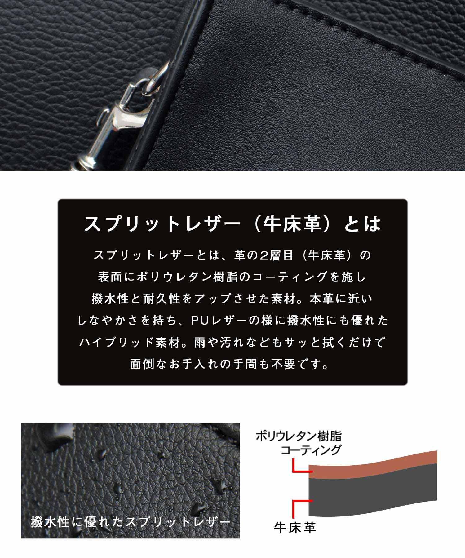 スプリットレザーとは、革の2層目(牛床革)の表面にポリウレタン樹脂のコーティングを施し、撥水性と耐久性をアップさせた素材。本革に近いしなやかさを持ち、PUレザーのように撥水性にも優れたハイブリッド素材。雨や汚れなどもサッと拭くだけで、面倒なお手入れの手間も不要です。