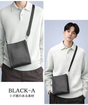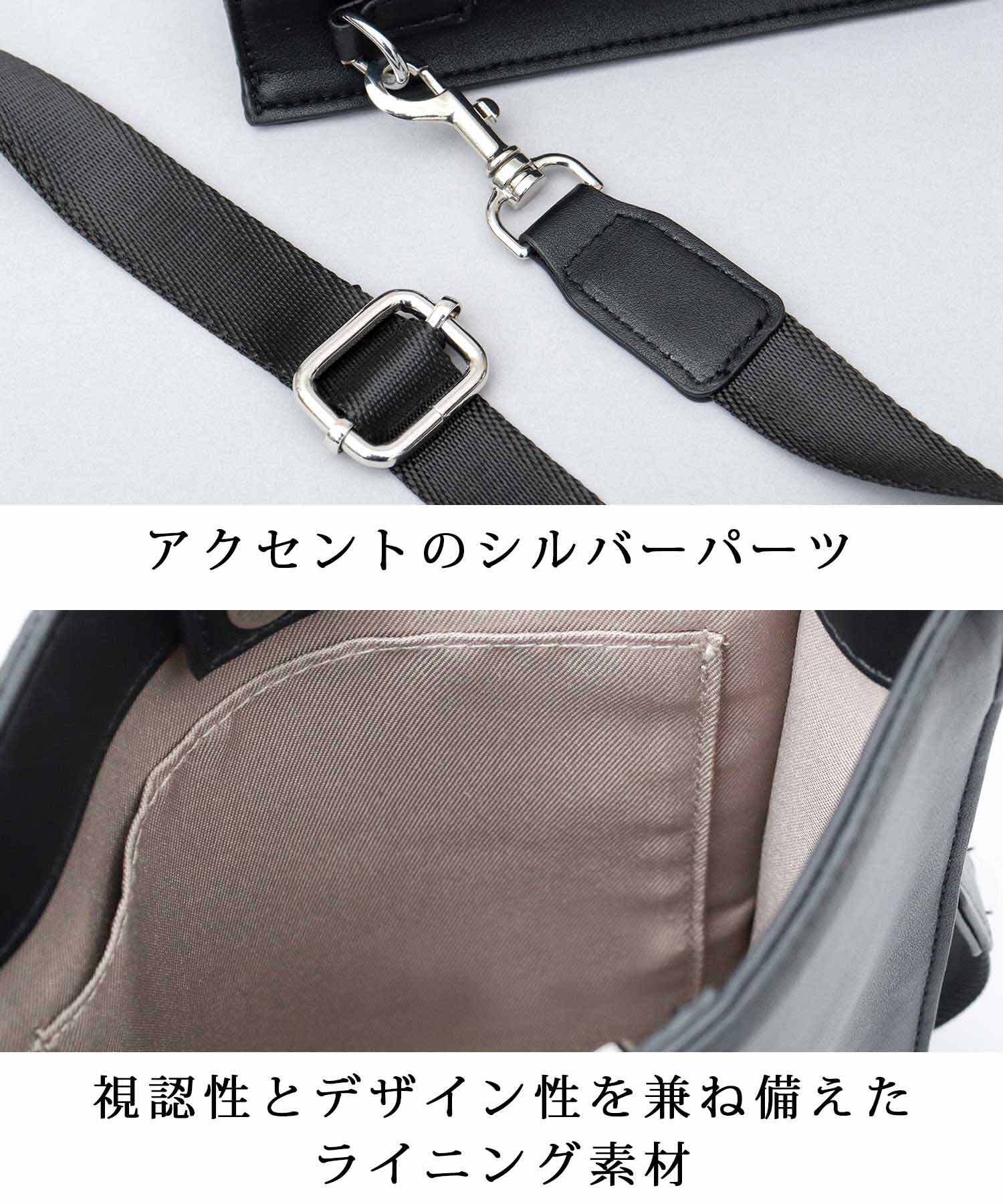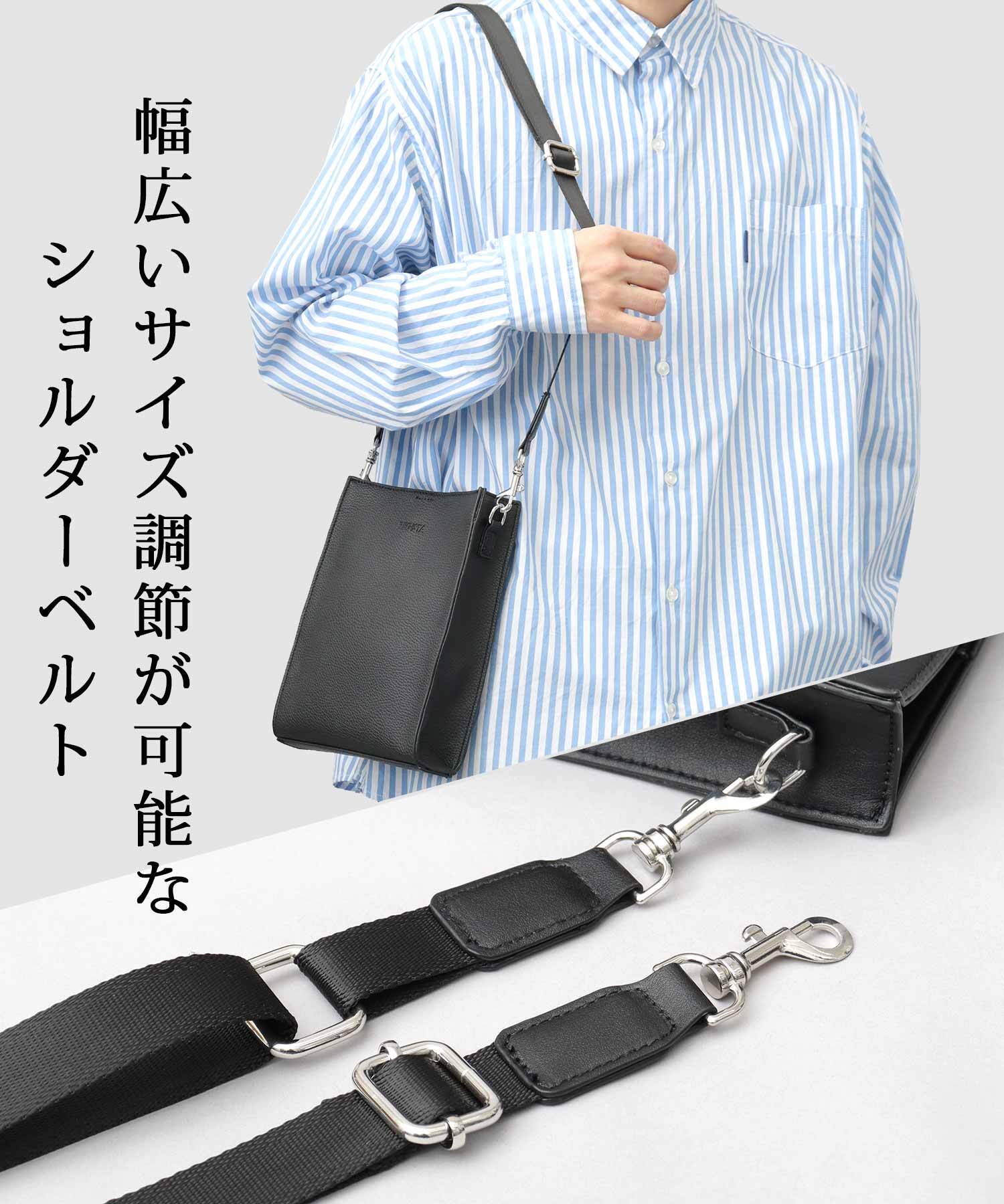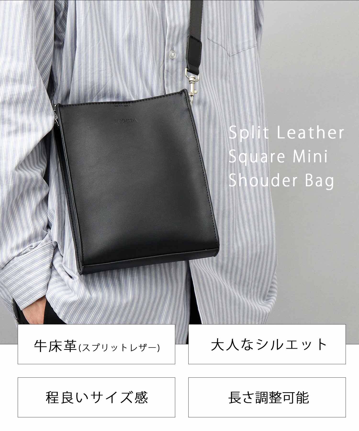 かっちりとしたスクエアシルエットが特徴のミニマルでコンパクトなショルダーバッグ。素材には、肉厚で生地張りのある、2種類のスプリットレザー(牛床革)を使用。本革のしなやかさと、合成皮革の手軽さを併せ持つハイブリッド素材は、普段使いにぴったり。やや光沢のあるテープにシルバーのメタルパーツを効かせたショルダーベルトがアクセント。コンパクトな見た目でありながらも、マチ幅を確保しているので、スマホやお財布、ポーチなど普段使いする小物が収まる程よい収納力で、使い勝手も抜群。