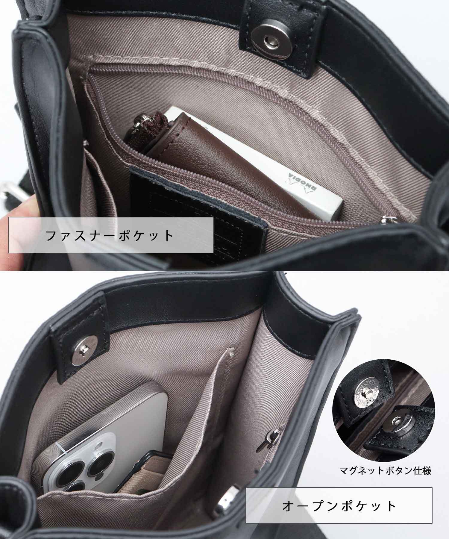 いつものお出かけアイテムがすっきり収まるサイズ感の内部には、ファスナーポケットとオープンポケットを完備。間口は、ワンタッチで開閉ができるマグネットボタン仕様。