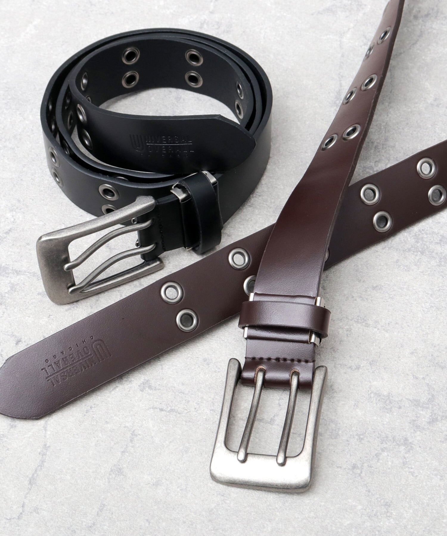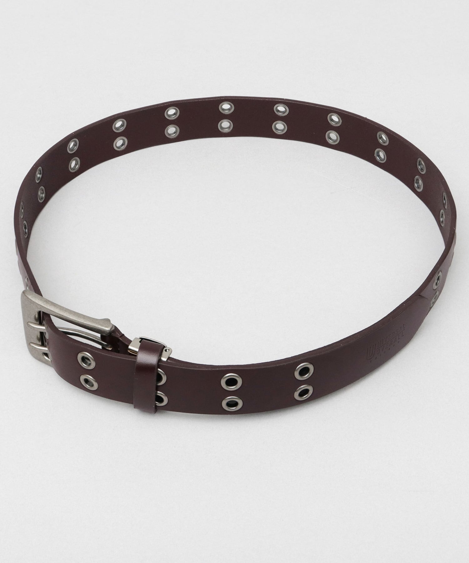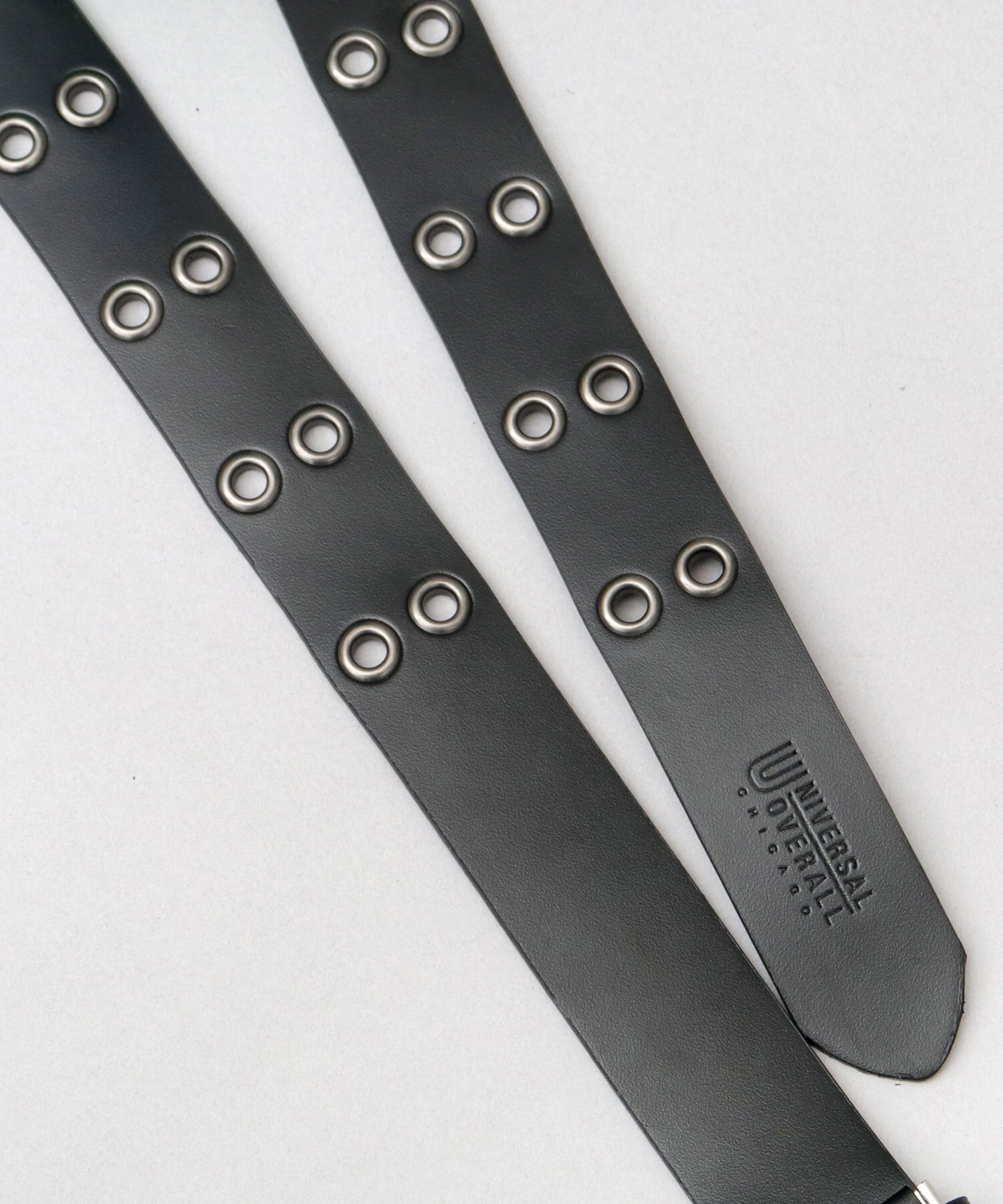 老舗ワークウェアブランド「UNIVERSAL OVERALL(ユニバーサルオーバーオール)」のレザーダブルハトメベルト。肉厚でありながら、使い始めから柔らかくしなやかな牛革を使用しており、普段使いにおすすめです。大ぶりなスクエアシルエットのダブルピンバックルと、ベルト帯のダブルハトメデザインがインパクト抜群。金具は全てアンティークシルバーで統一してカジュアルな雰囲気に。約3.5cmの程よい太さのベルト幅は、デニム、チノ、スラックスと幅広い合わせが可能。ハトメが帯全体に配置されているので、サイズ調節は自由自在。ベルトを主役にしたスタイリングにおすすめ。