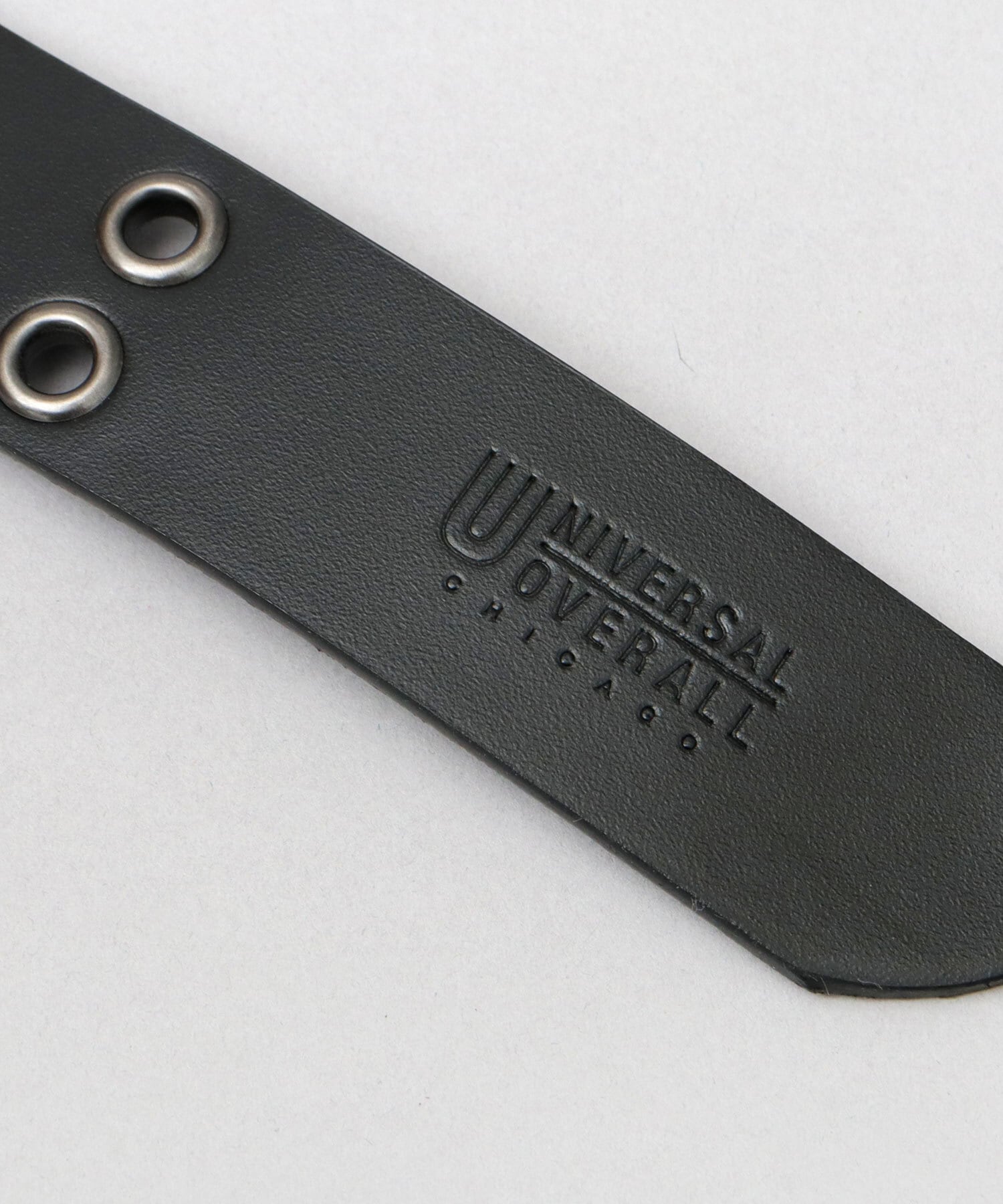 約3.5cmの程よい太さのベルト帯は、カジュアルスタイルを中心に幅広く活躍。剣先に施された「UNIVERSAL OVERALL」の刻印もさりげないポイント。
