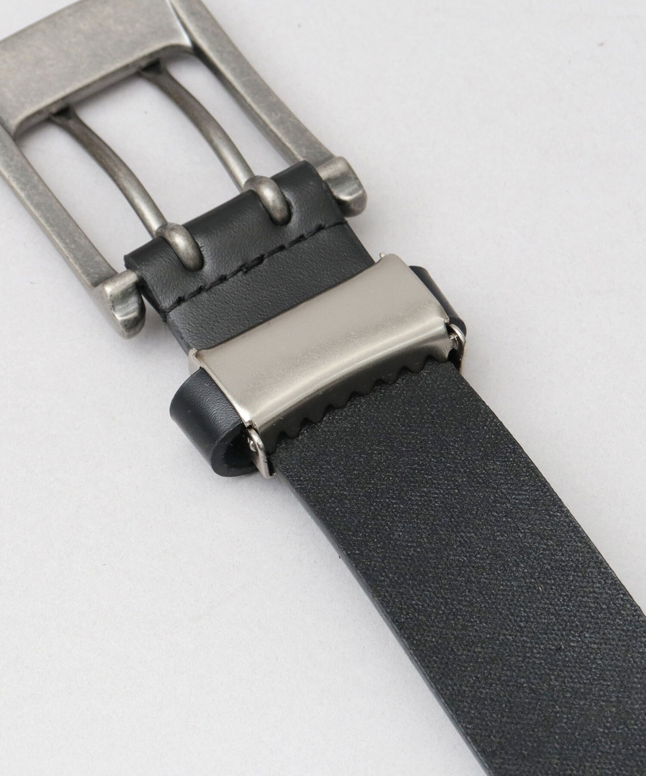 バックルとハトメにはヴィンテージシルバーを採用。バックルは加工による、使い古したようなこなれた雰囲気もポイント。