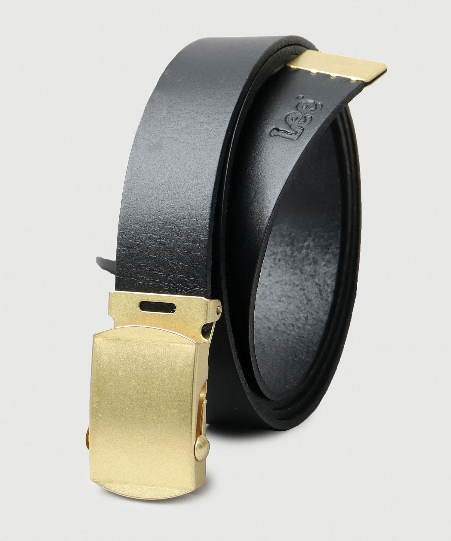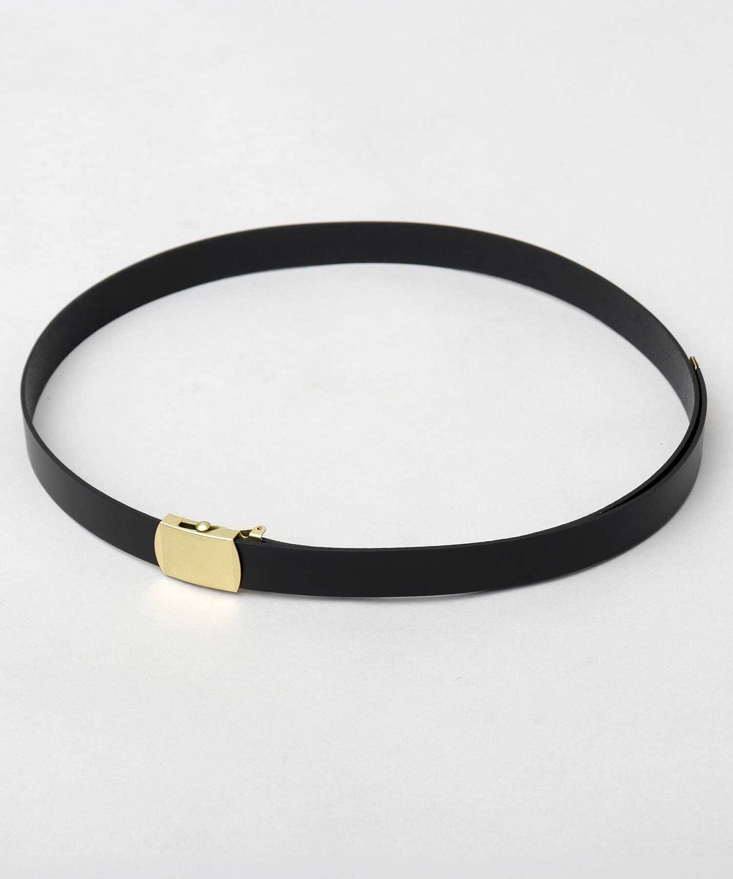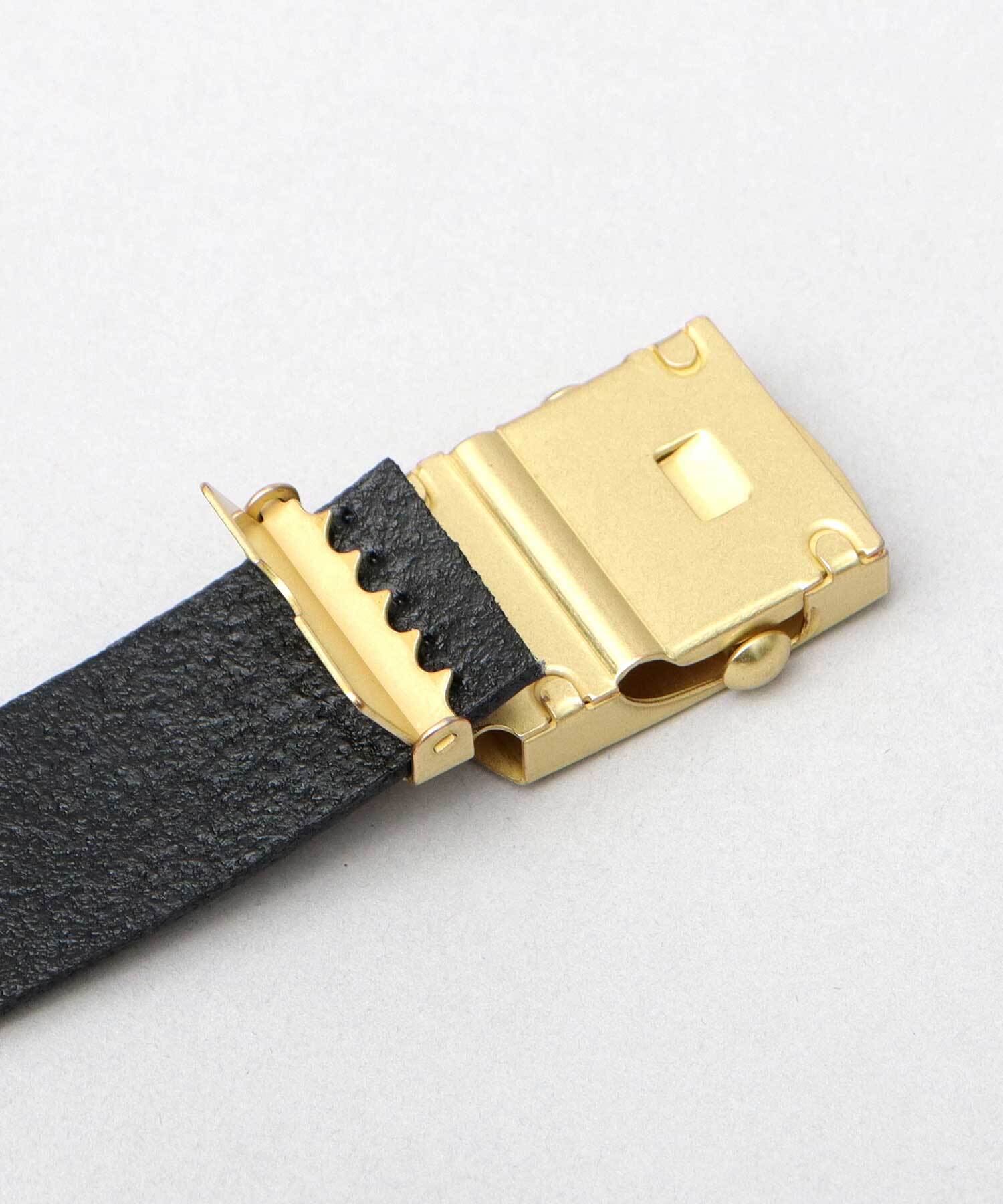 カジュアルでチープなイメージのGIベルトを素材使いで大人仕様にアレンジ。肉厚な牛革の帯に、アンティークゴールドを効かせた、ヴィンテージライクな雰囲気。