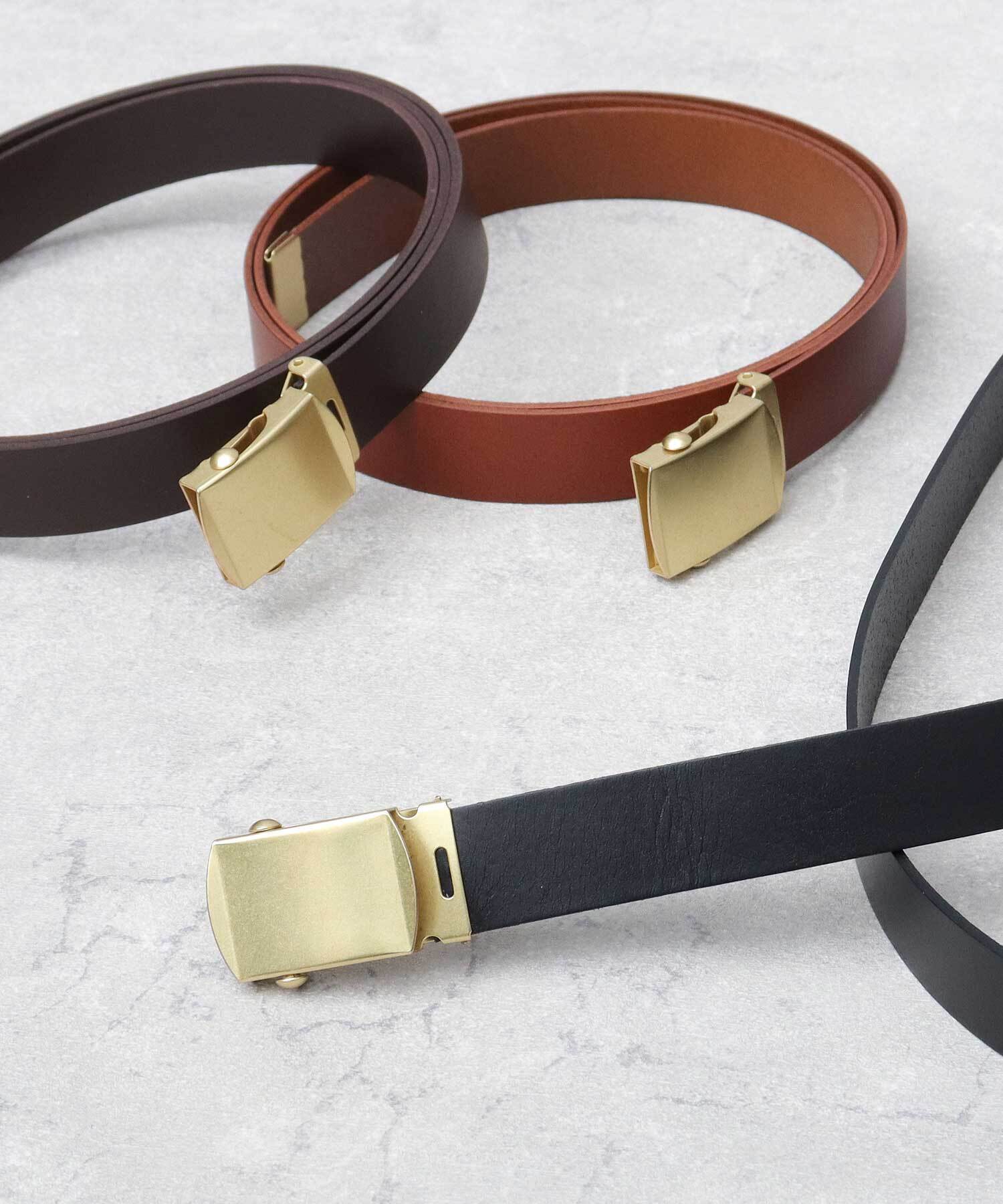 カジュアルに使いやすいガチャベルトの良さを残しつつも、本革を使用したシックな風合いで、大人でも取り入れやすいデザインです。ベルト帯のレザーは使い込むことでエイジングを楽しめるのも愛着が沸いて良いです。使い始めは硬いですが、使っているうちにどんどん柔らかく馴染んできます。剣先を垂らしたスタイリングは、レザー素材のお陰で子供っぽくならず、程よいヌケ感を演出できるのでおすすめです。カットして長さの調節ができるので、ユニセックスで使えます。レザー小物はプレゼントにもオススメです。