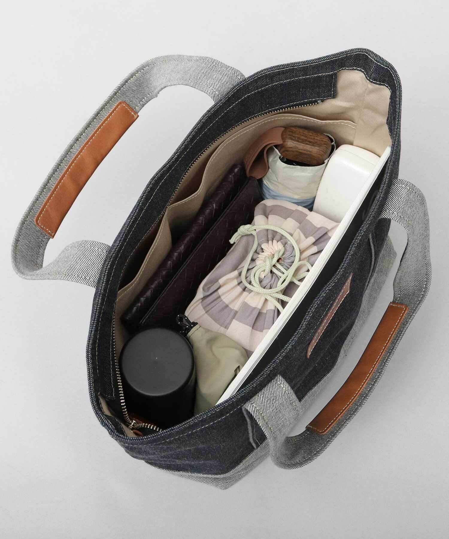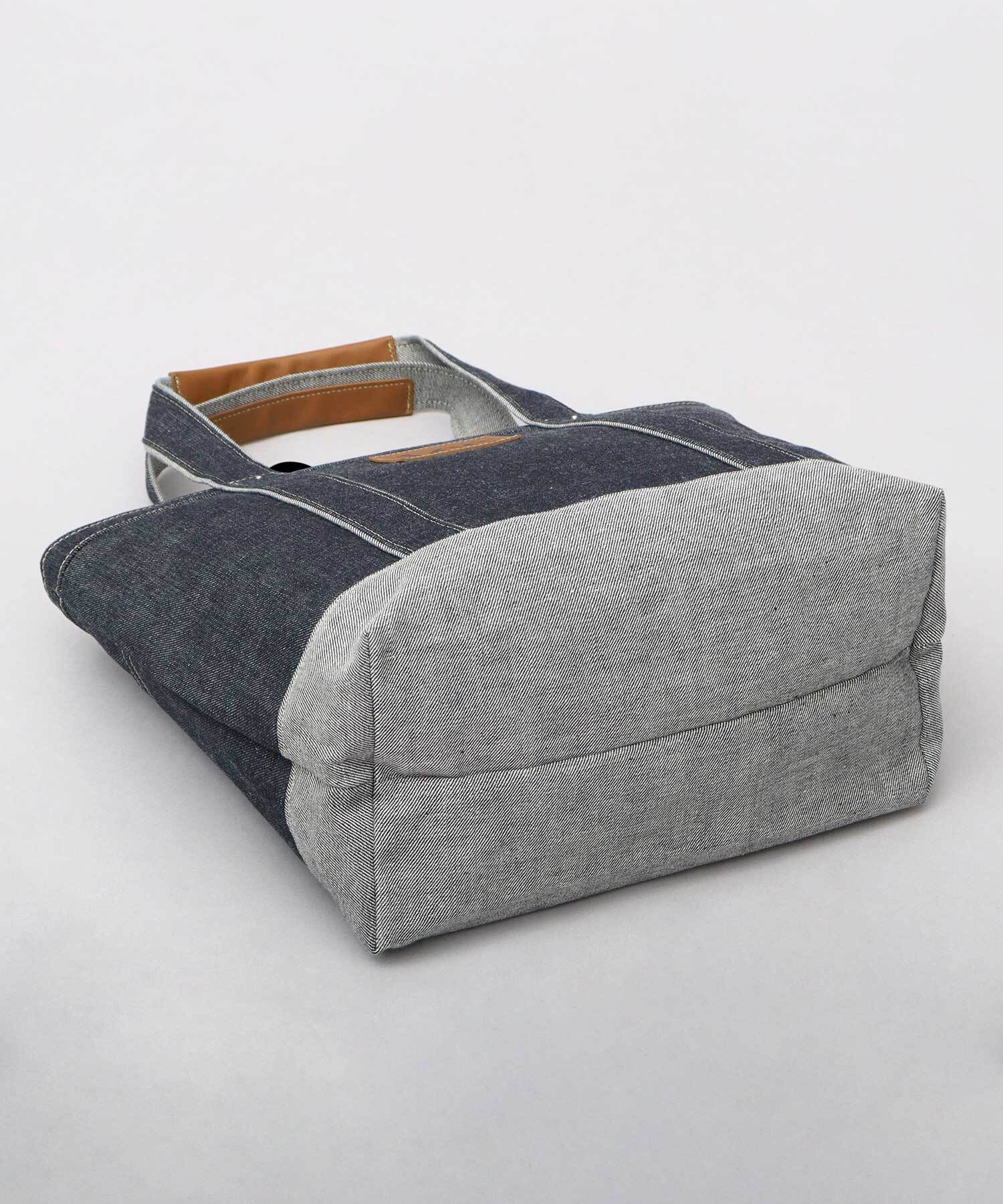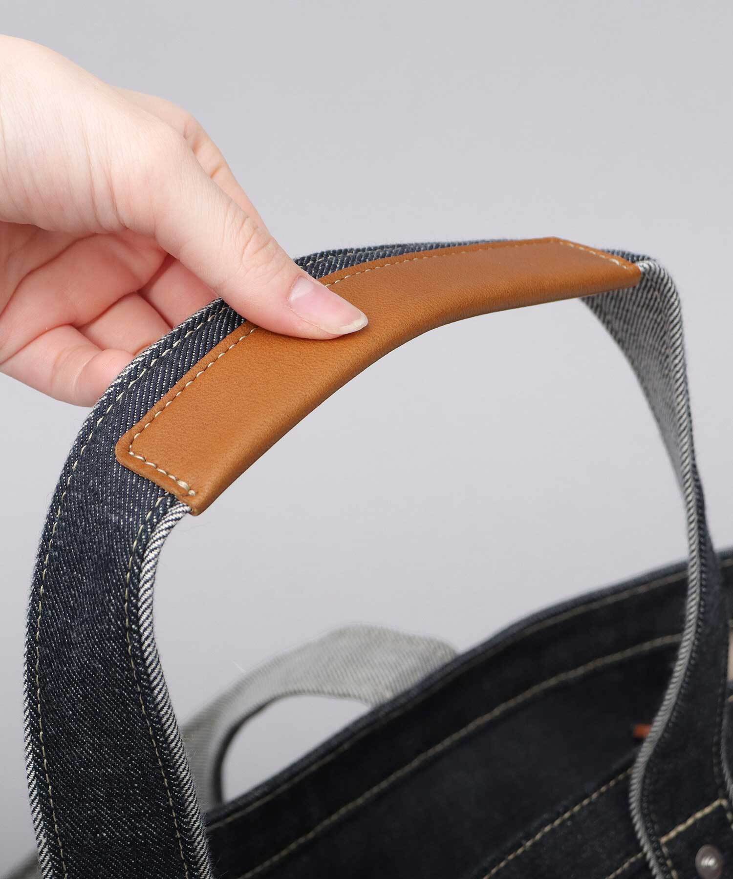 “倉敷デニム×姫路レザー”を使用した、トートバッグ。フロントのレザーパッチがワンポイントに。