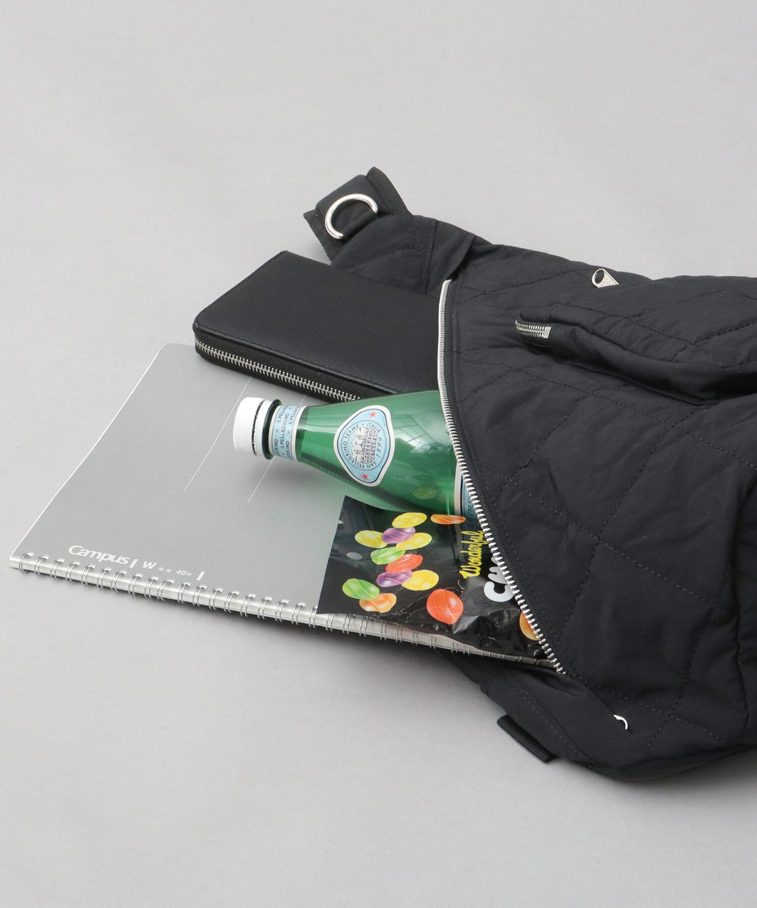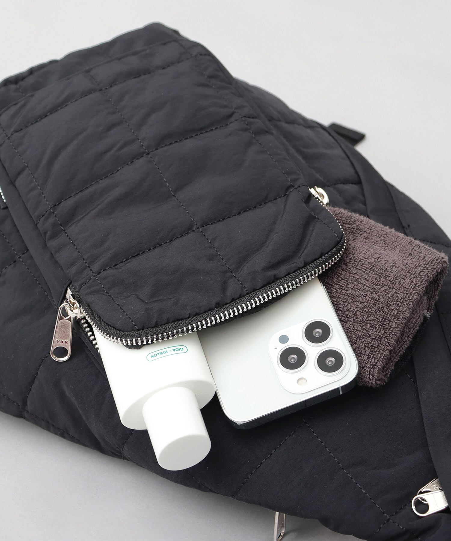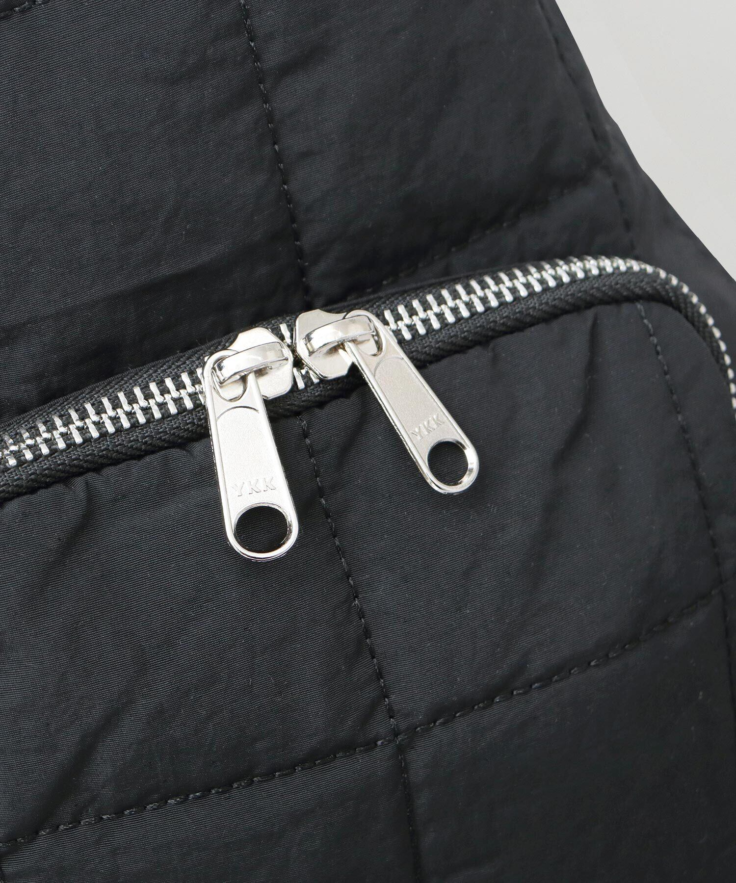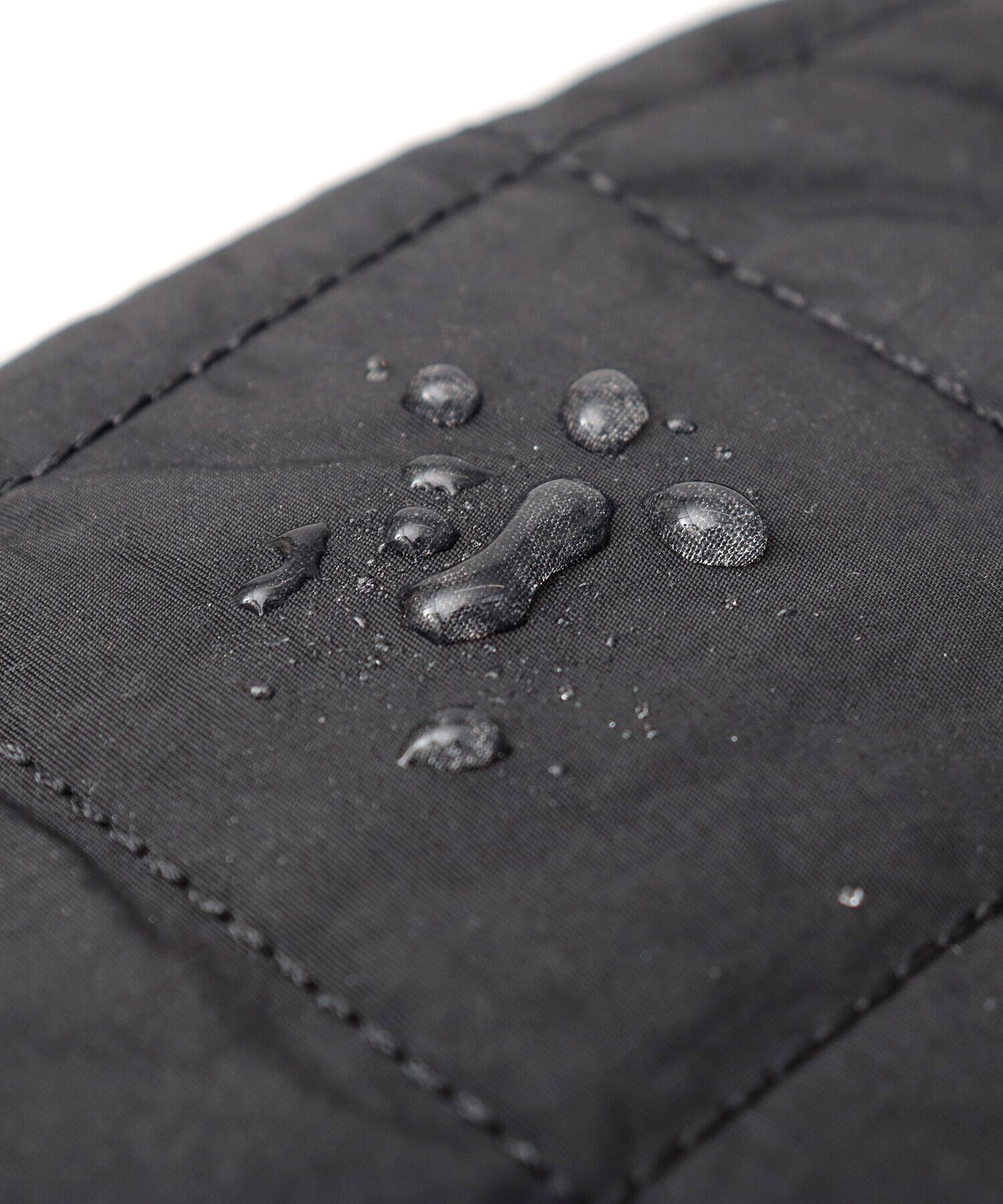 素材は、スクエアキルティングの大きさから拘った、ブランド定番のナイロンキルト生地を使用。シャリ感のあるナイロンを使用することで、キルト生地でありながらも通年使える表情に。撥水加工を施しているので、急な雨、水濡れにも安心です。圧倒的な軽量性もポイント。