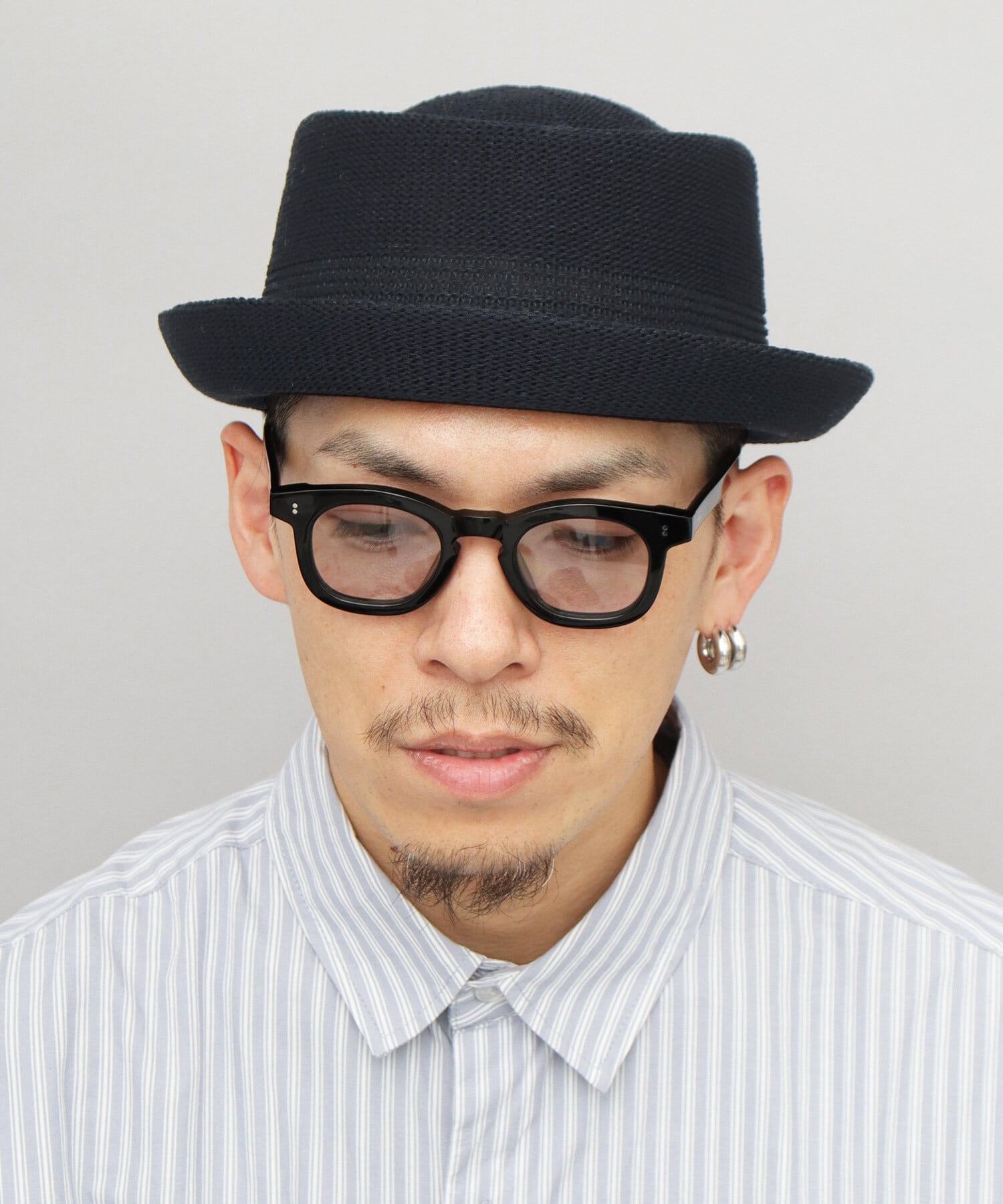 クラウン下部(腰部分)の編み柄を切り替えた、すっきりとしたデザイン。視覚的に引き締まった印象を与え、シンプルながらも表情のある仕上がりに。