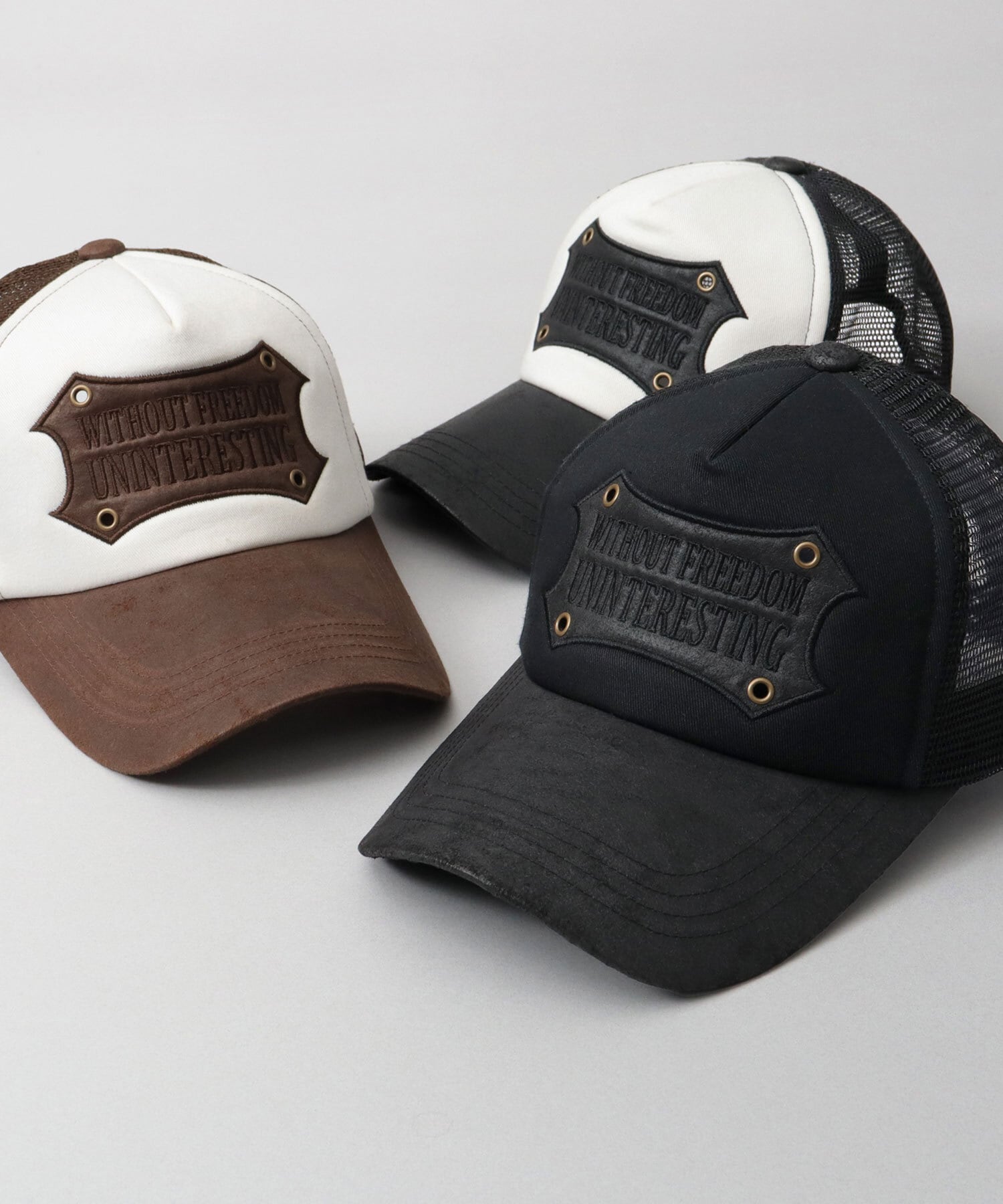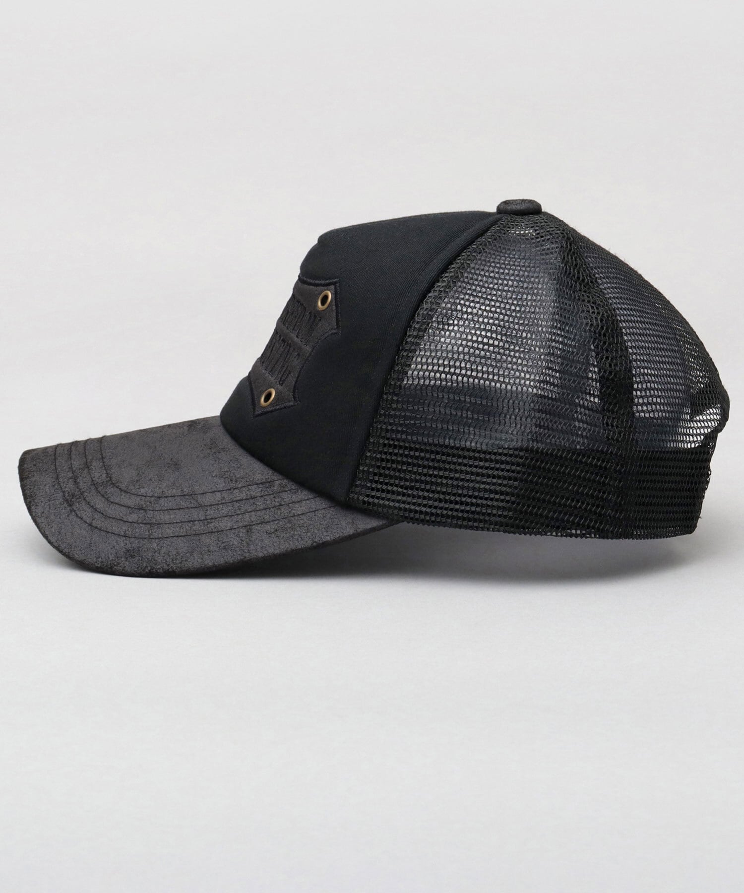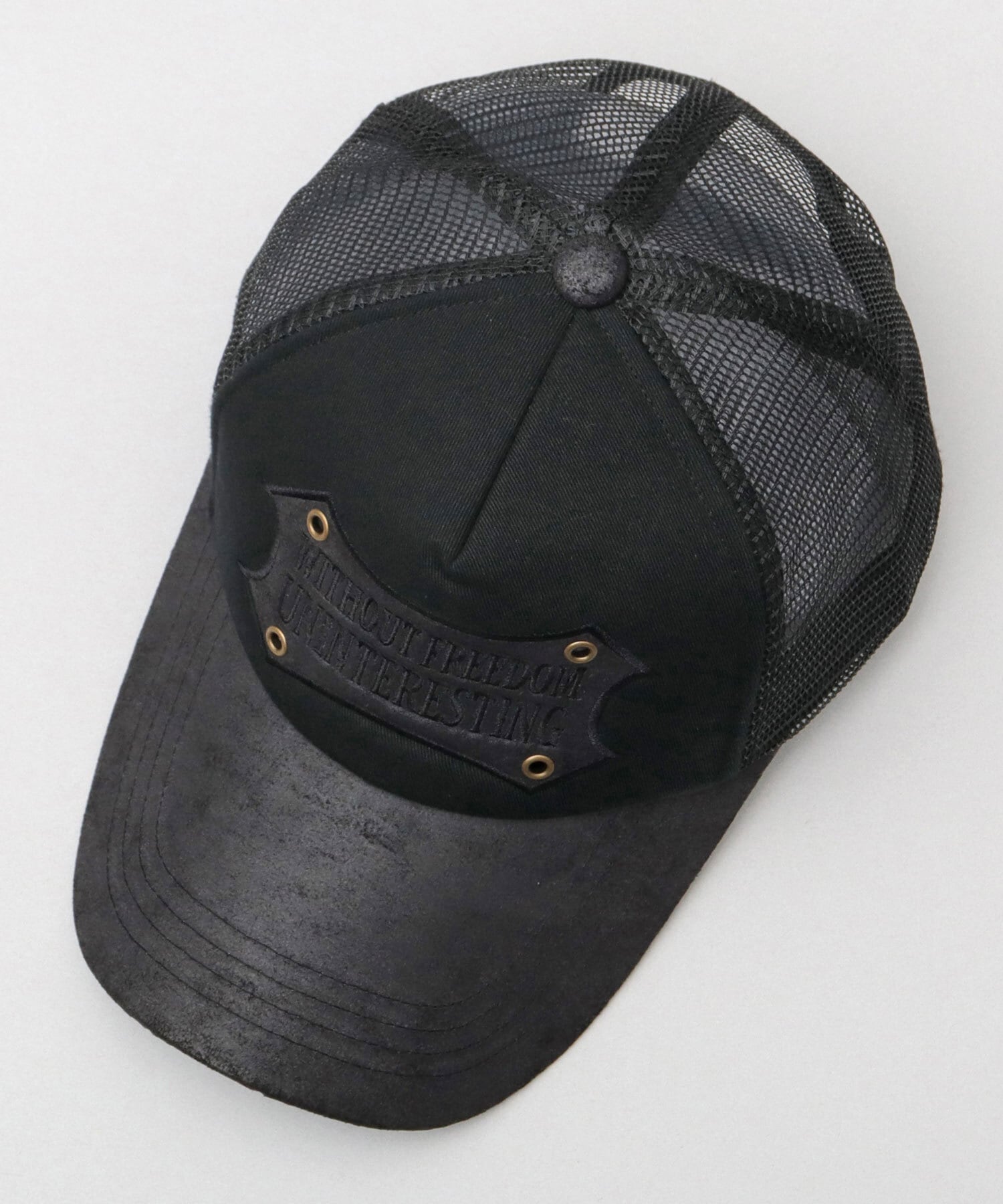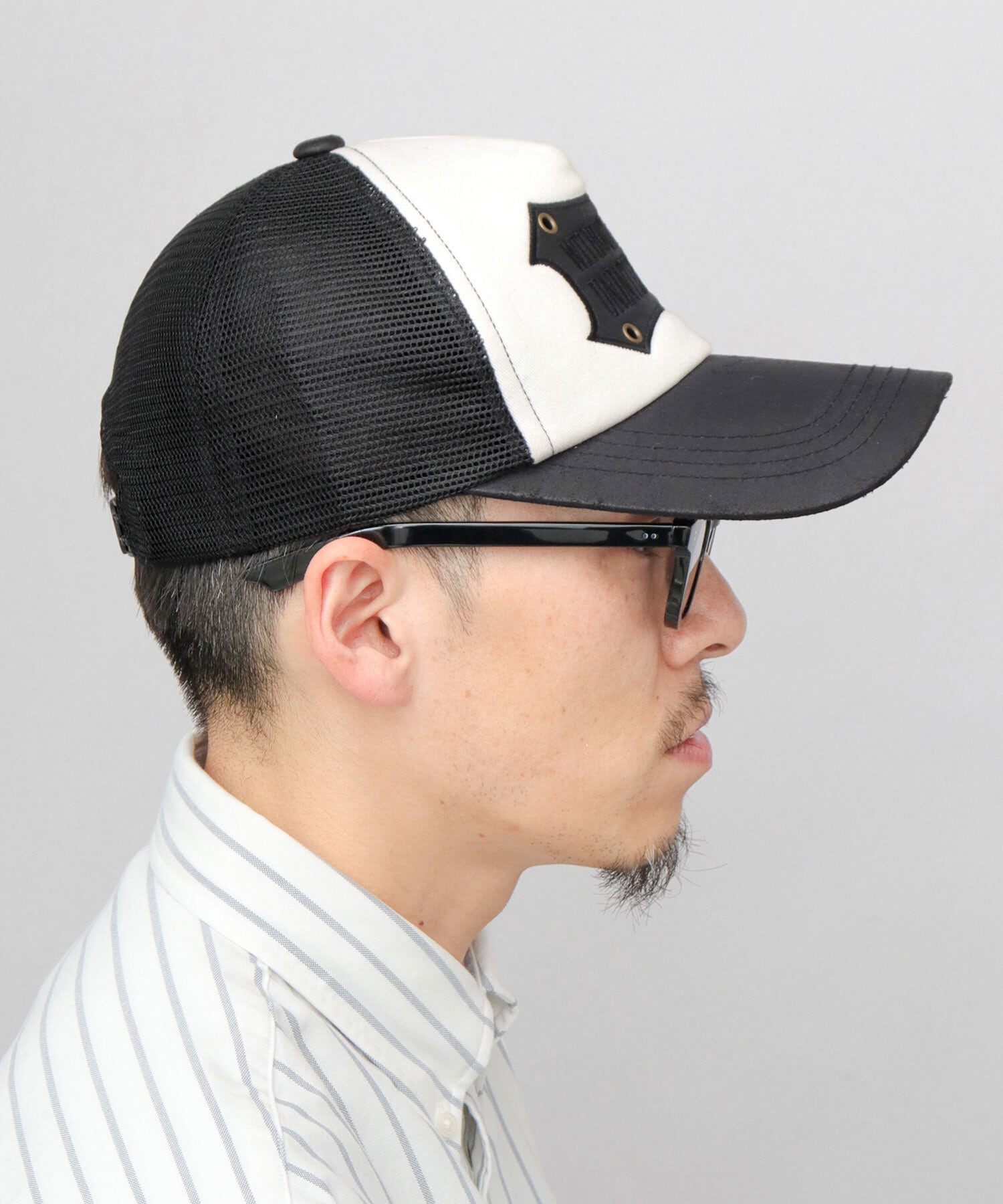 クラッキングレザー調素材をツバとフロントパネルのワッペンに使用してヴィンテージ感を演出したメッシュキャップ。