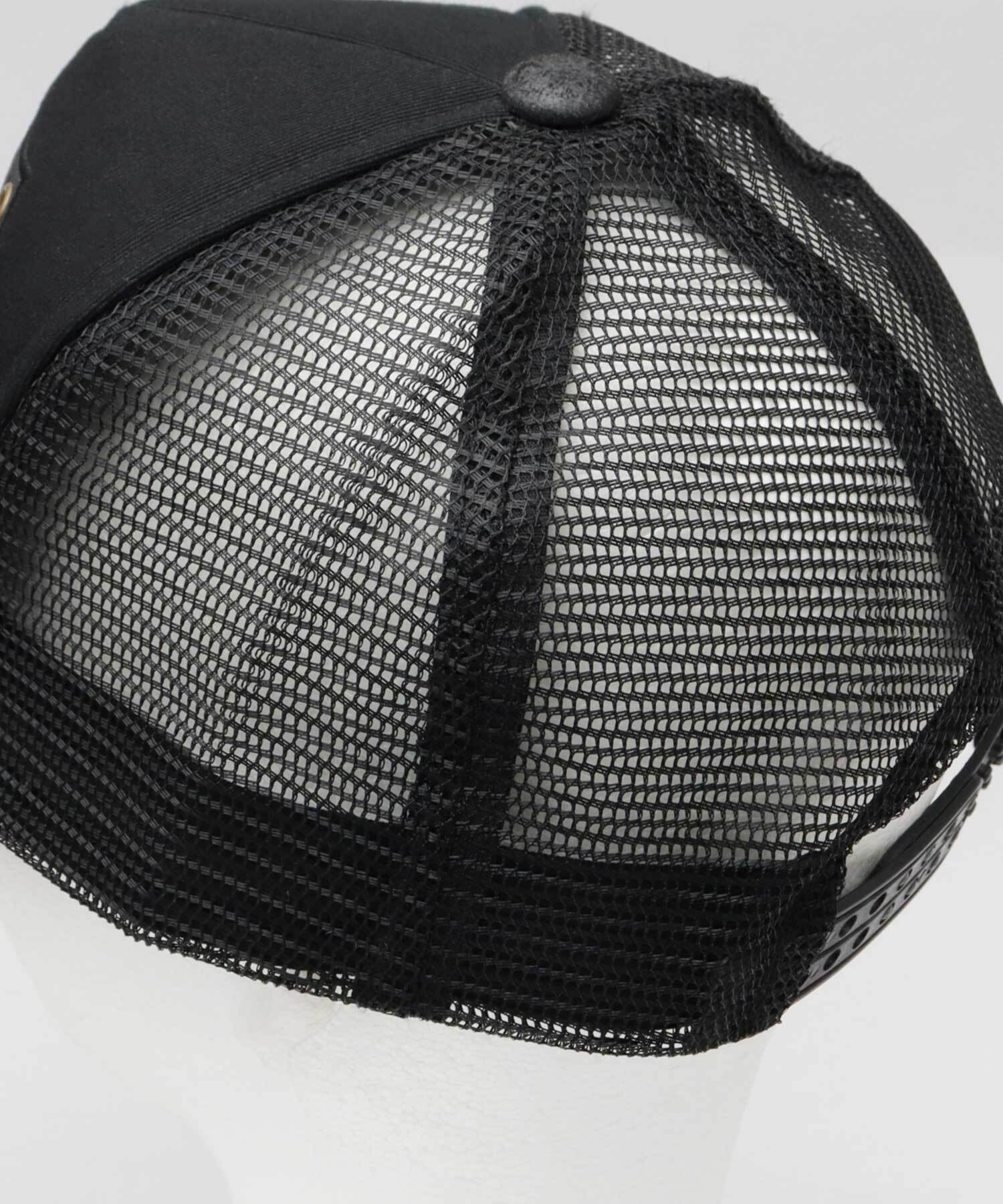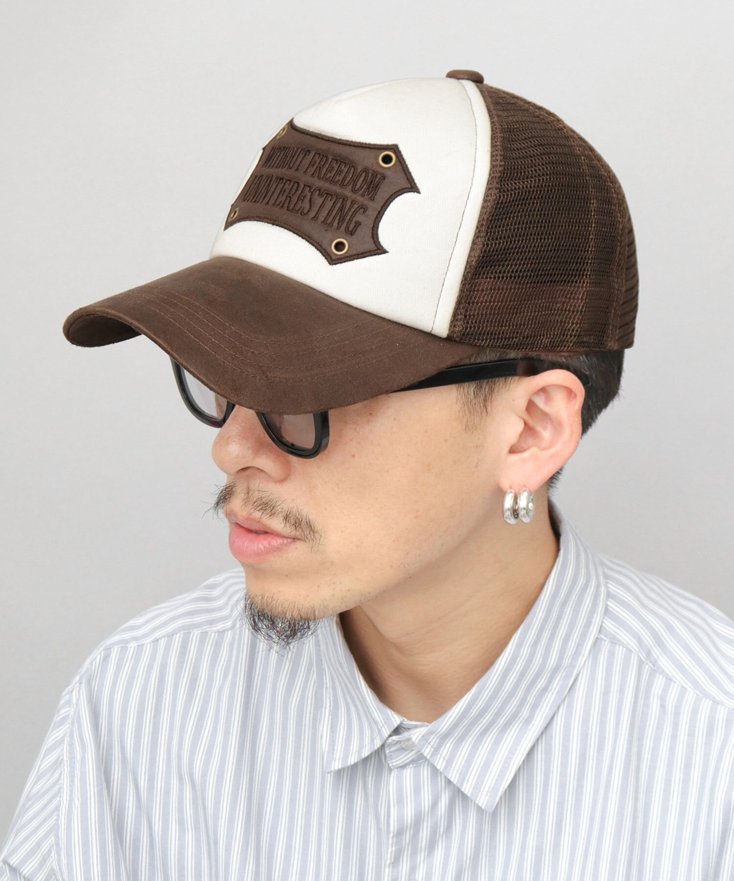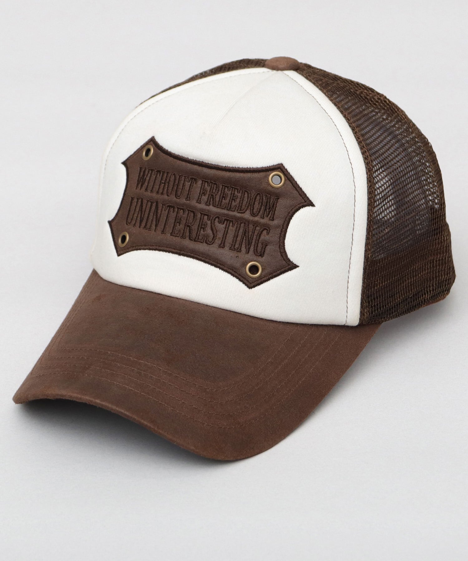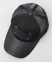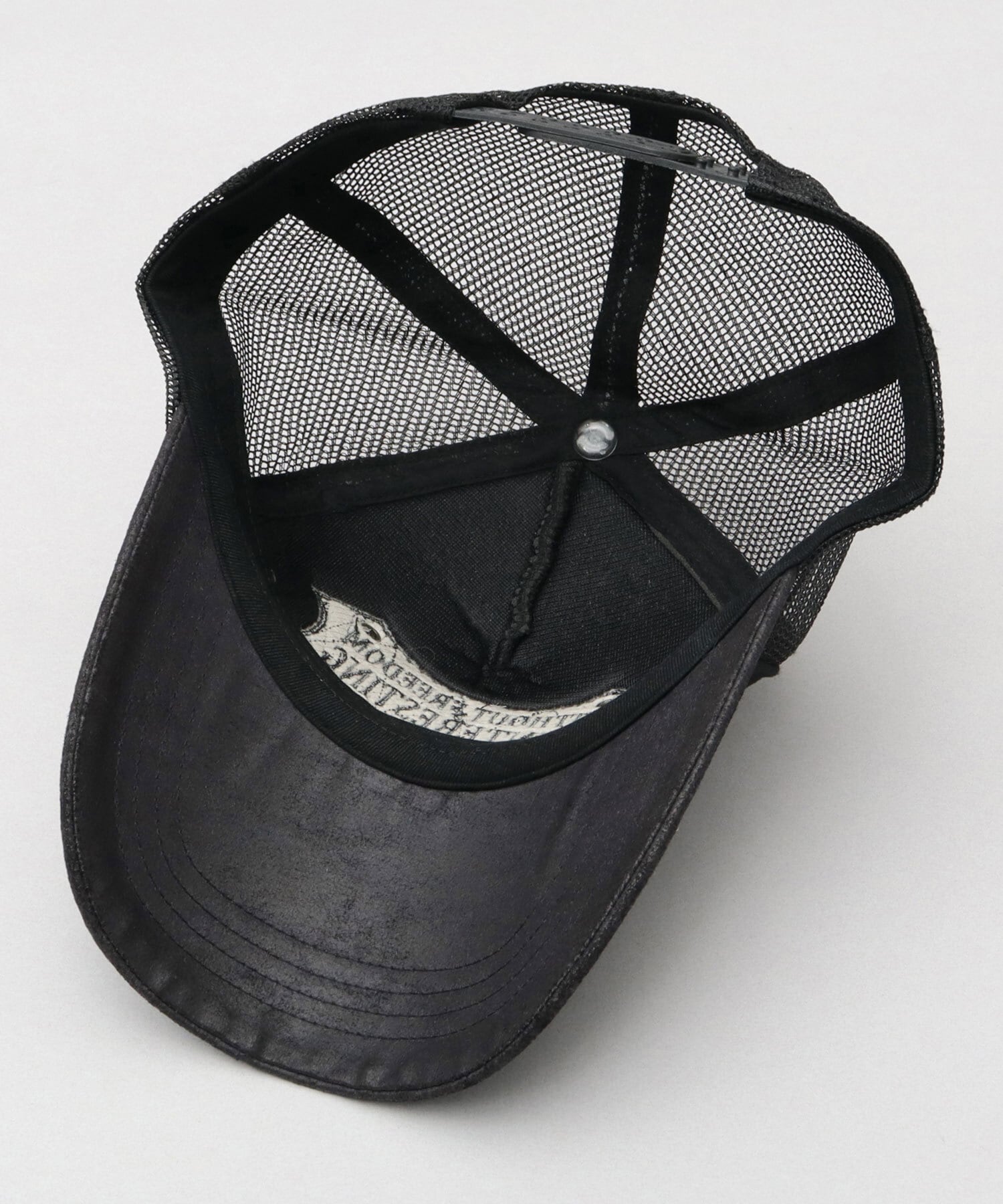 クラッキングレザー調素材をツバとフロントパネルのワッペンに使用してヴィンテージ感を演出したメッシュキャップ。