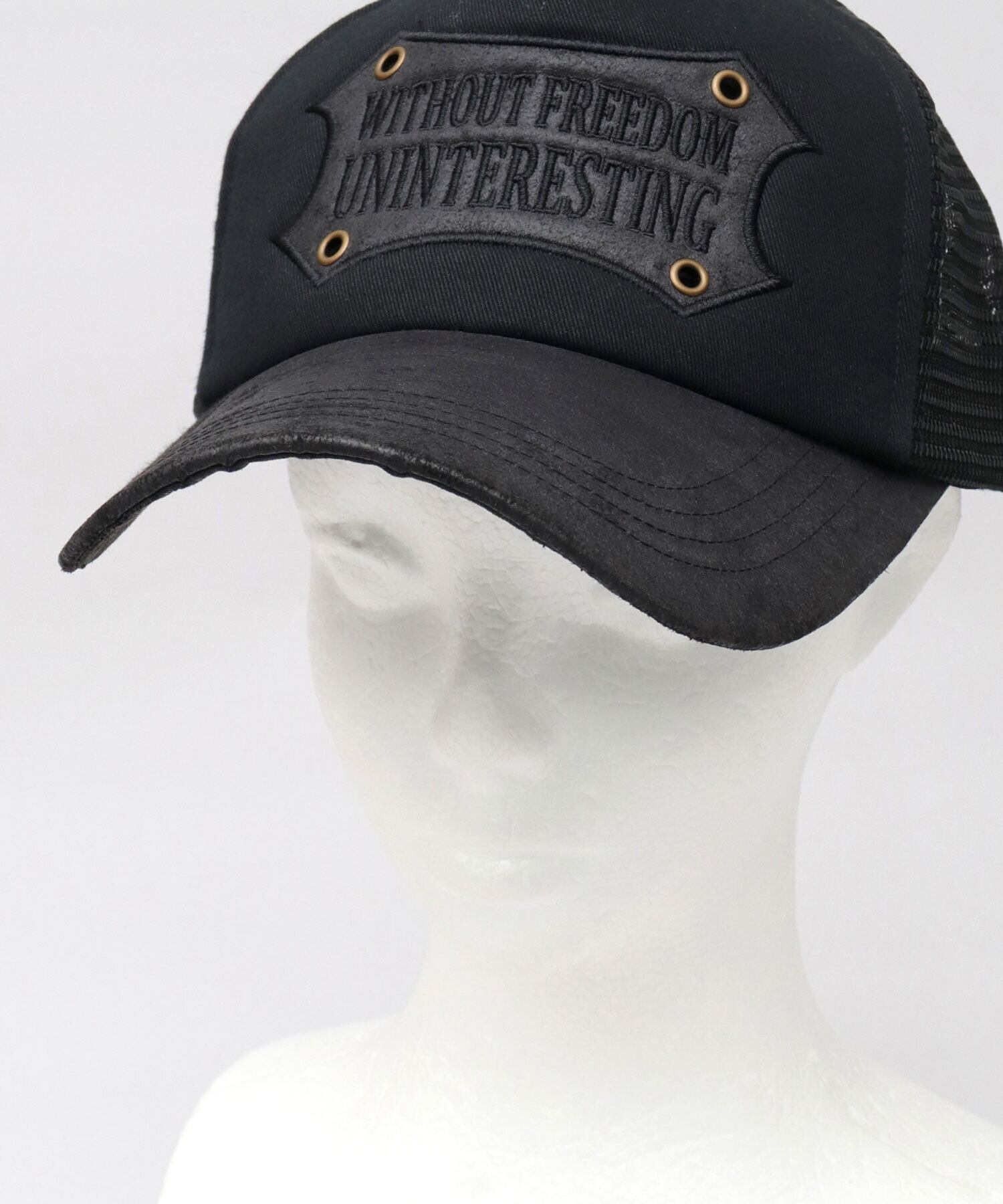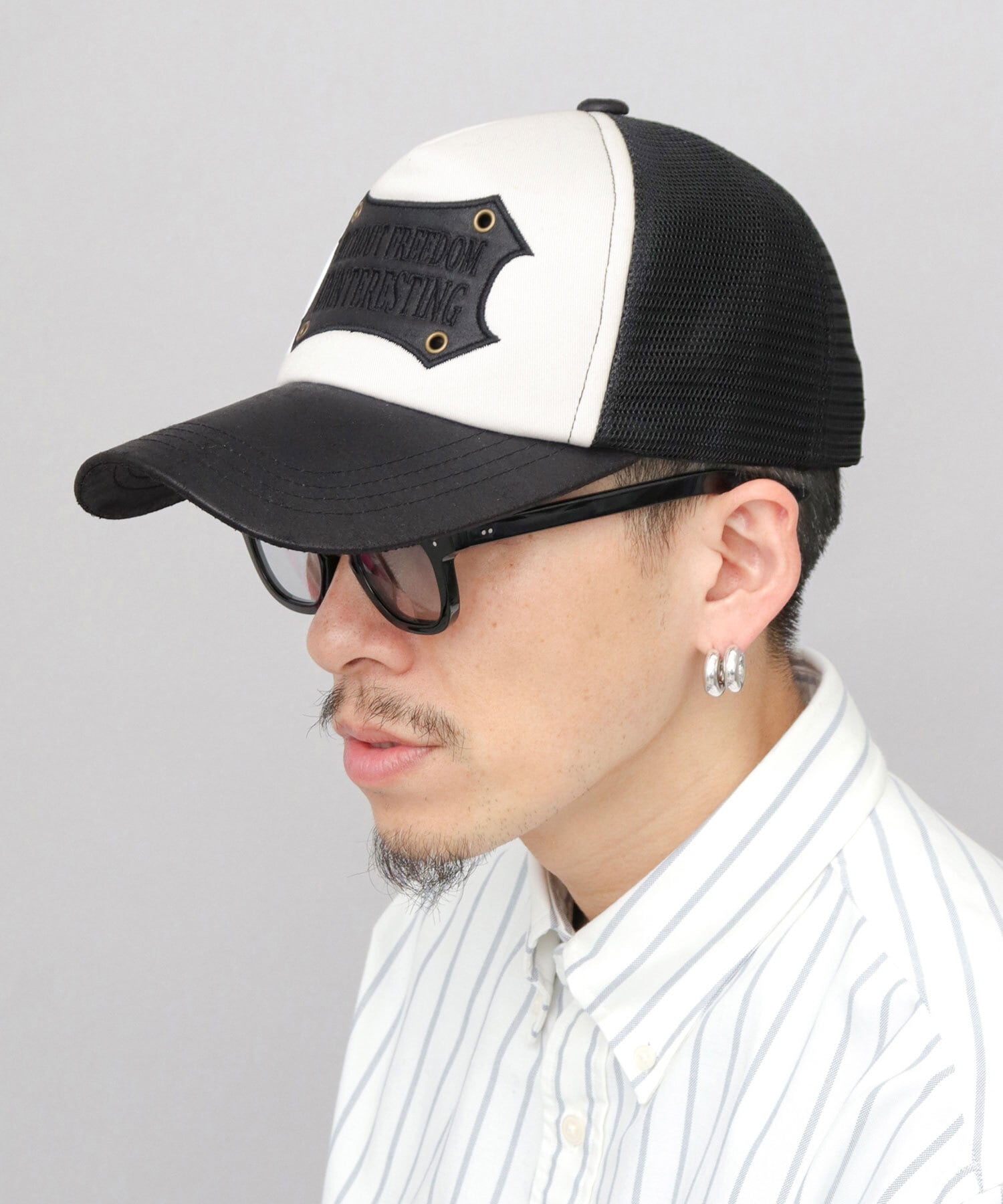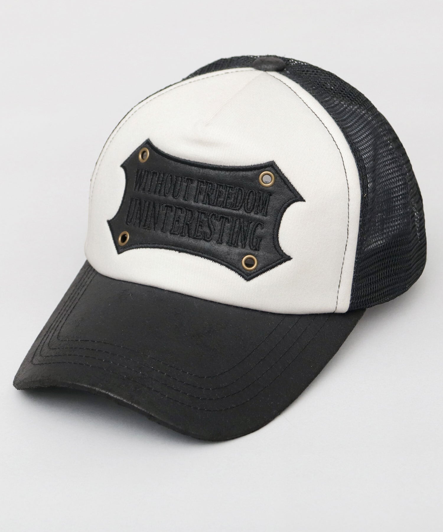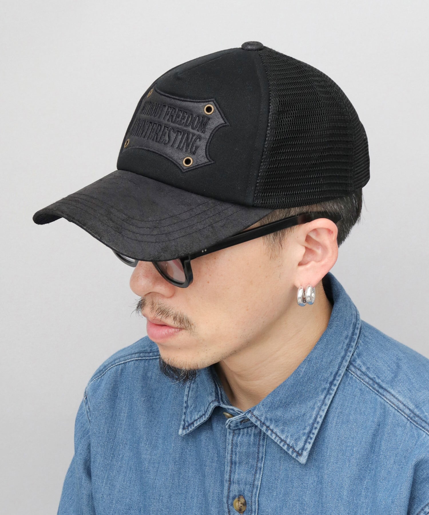 クラッキングレザー調素材をツバとフロントパネルのワッペンに使用してヴィンテージ感を演出したメッシュキャップ。