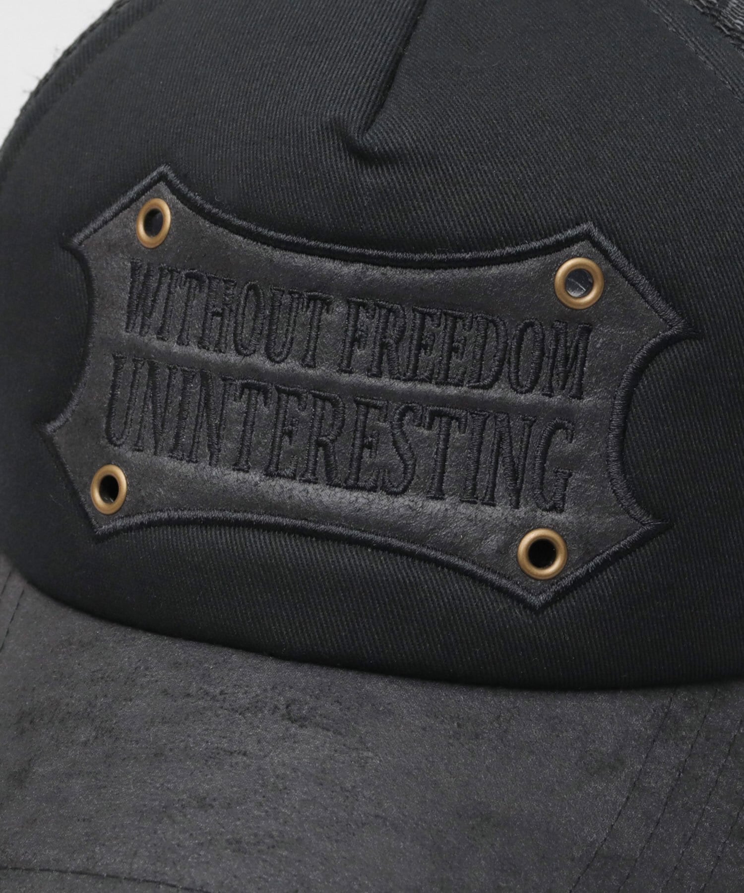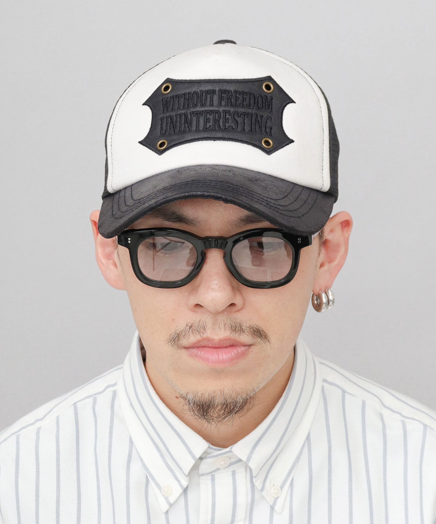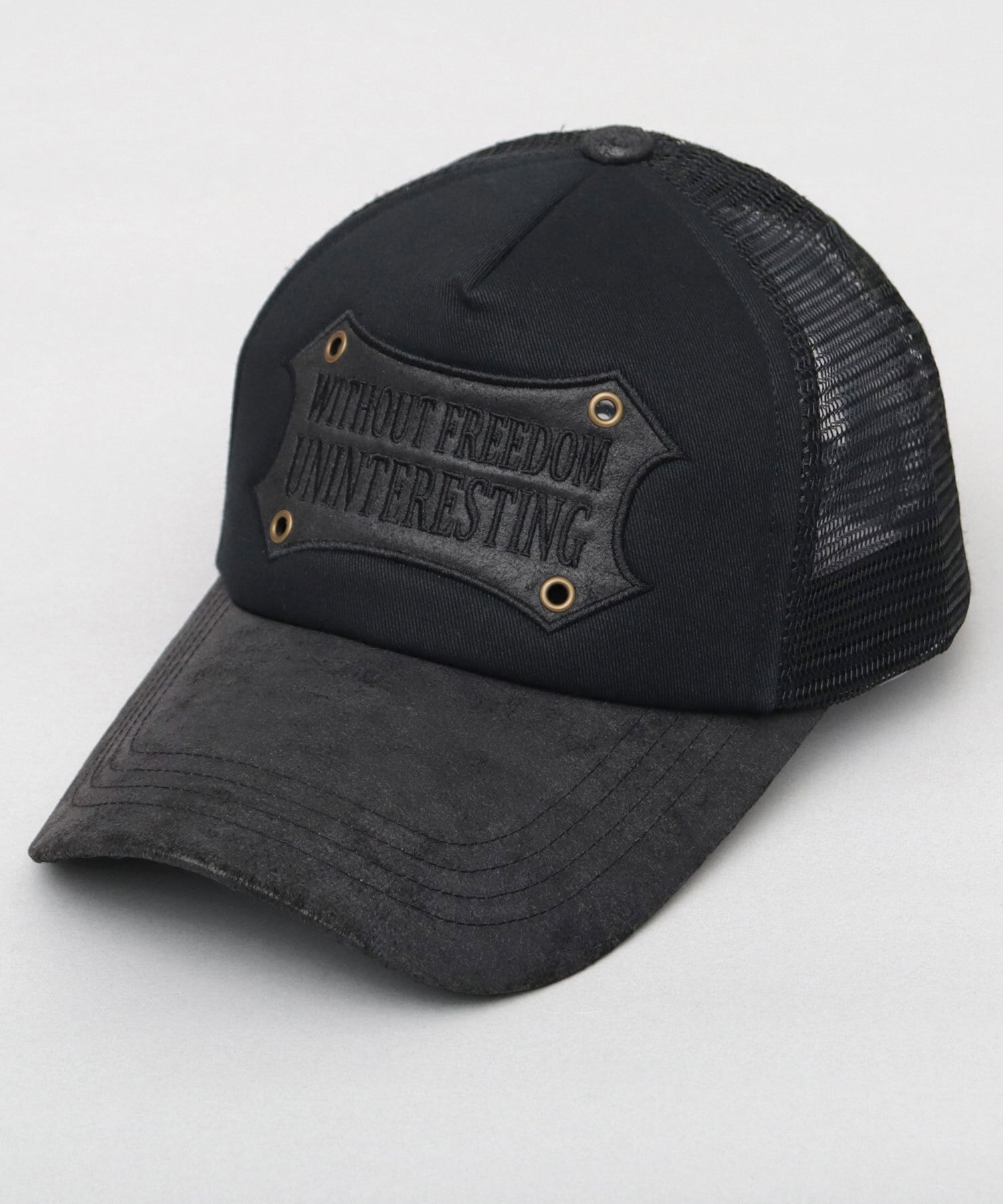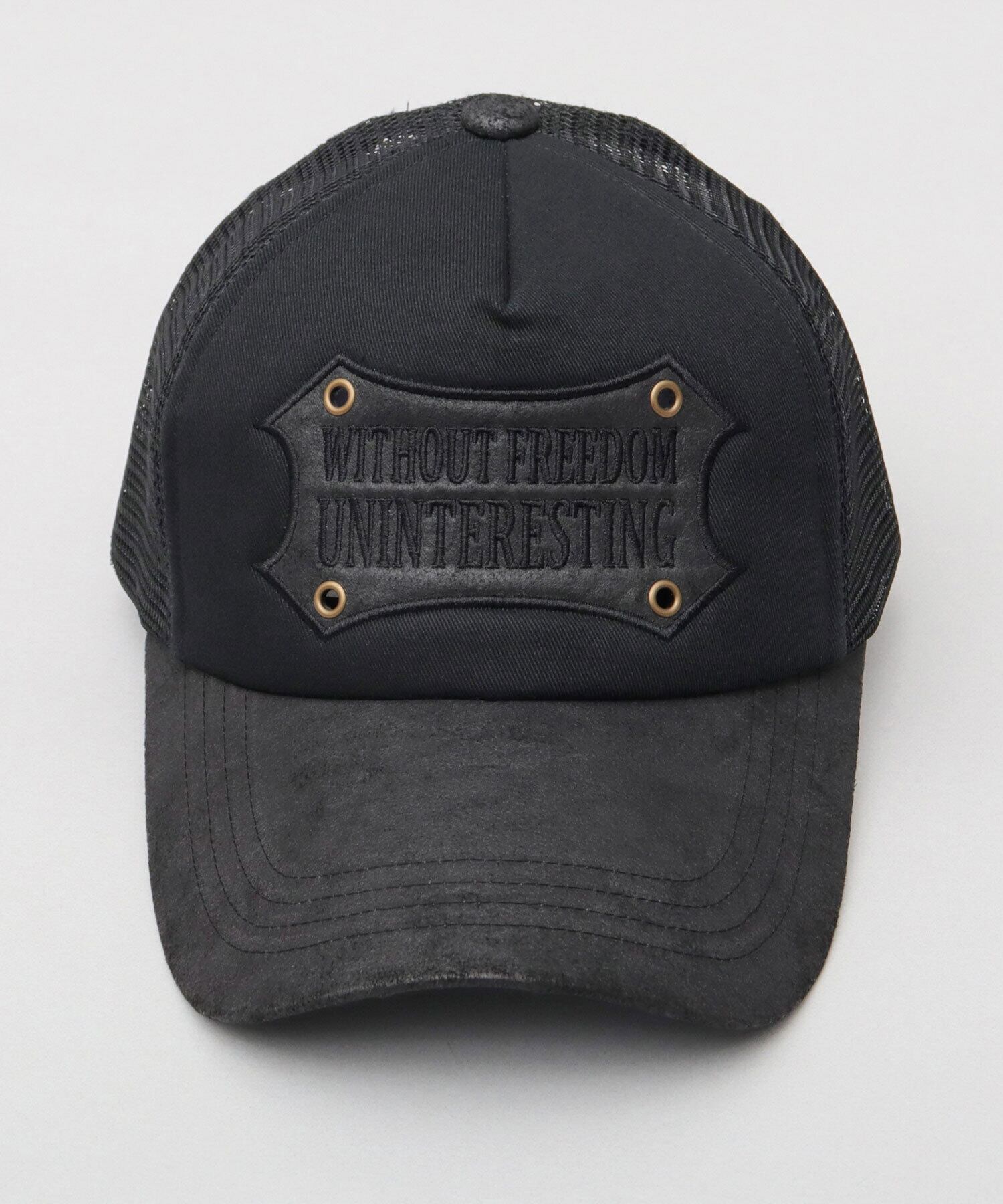 クラッキングレザー調素材をツバとフロントパネルのワッペンに使用してヴィンテージ感を演出したメッシュキャップ。