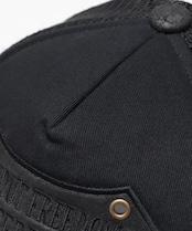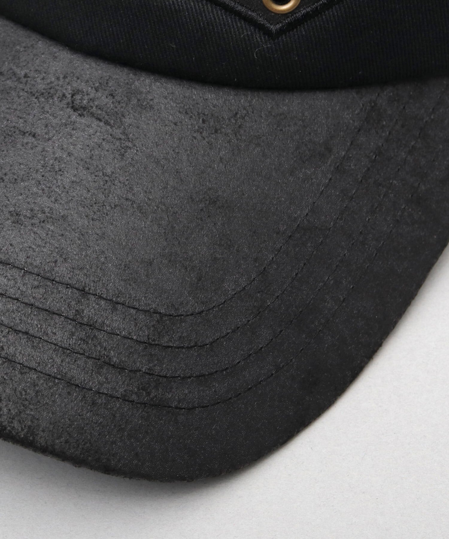 フロントパネルはツイル素材を使用。ツバ・ワッペン・天ボタンにはクラッキングレザー調素材を配置し、素材感のコントラストが効いた表情豊かな仕上がり。