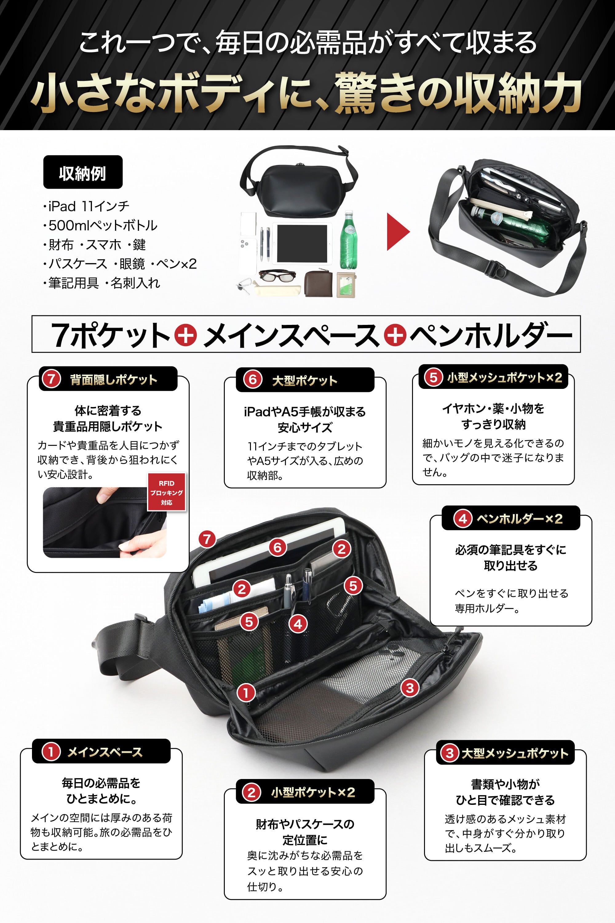 【7ポケット構造で整理しやすい収納】
