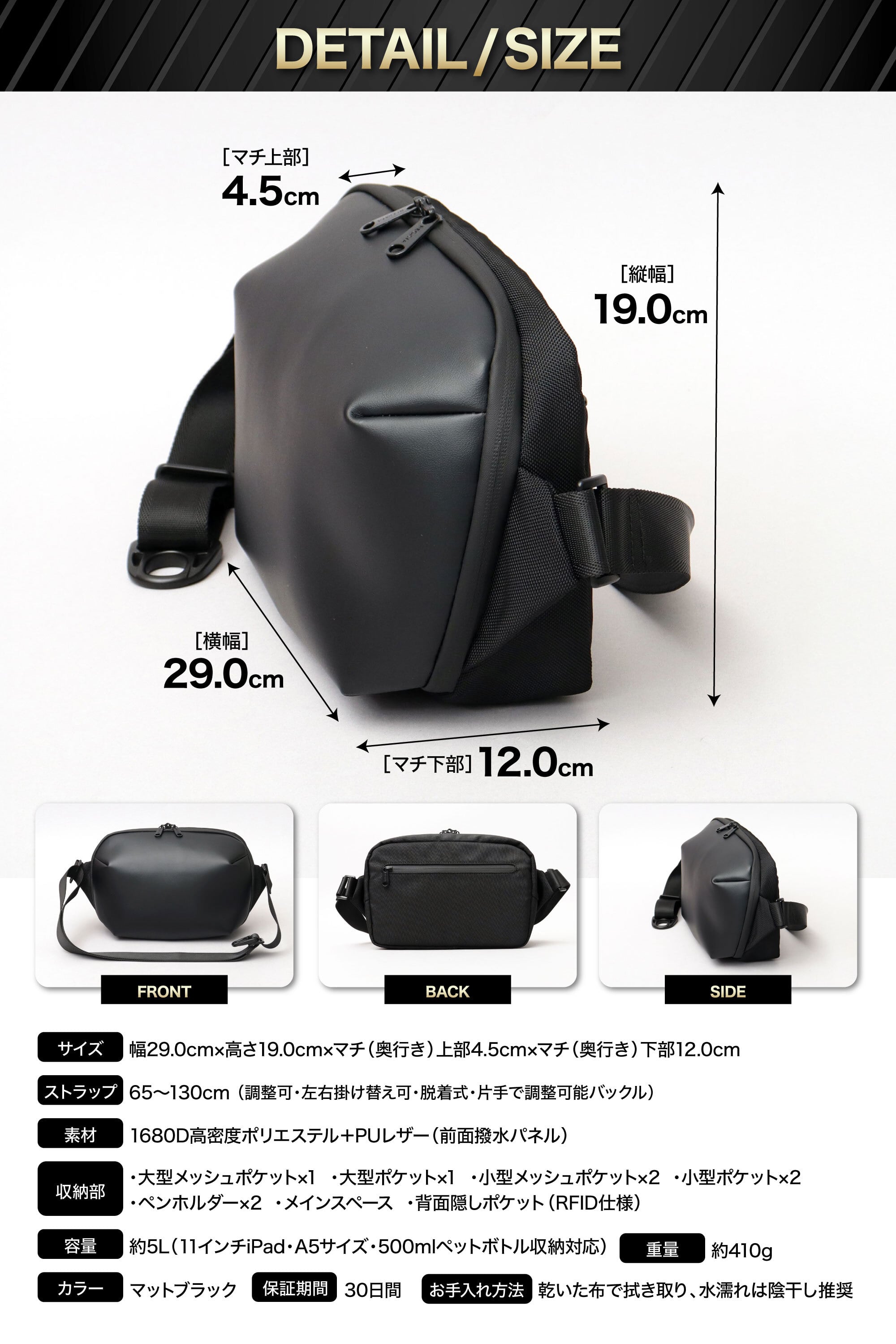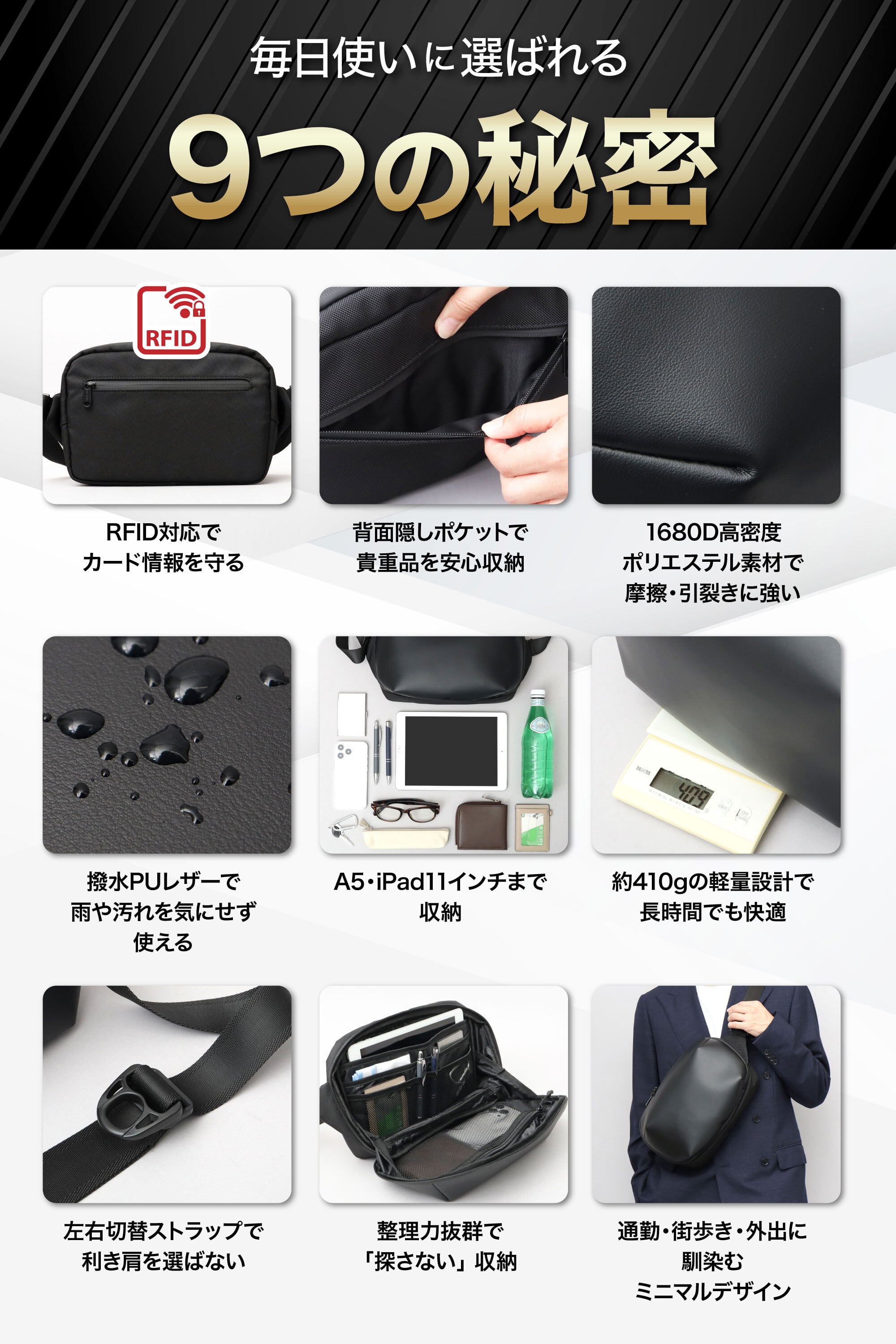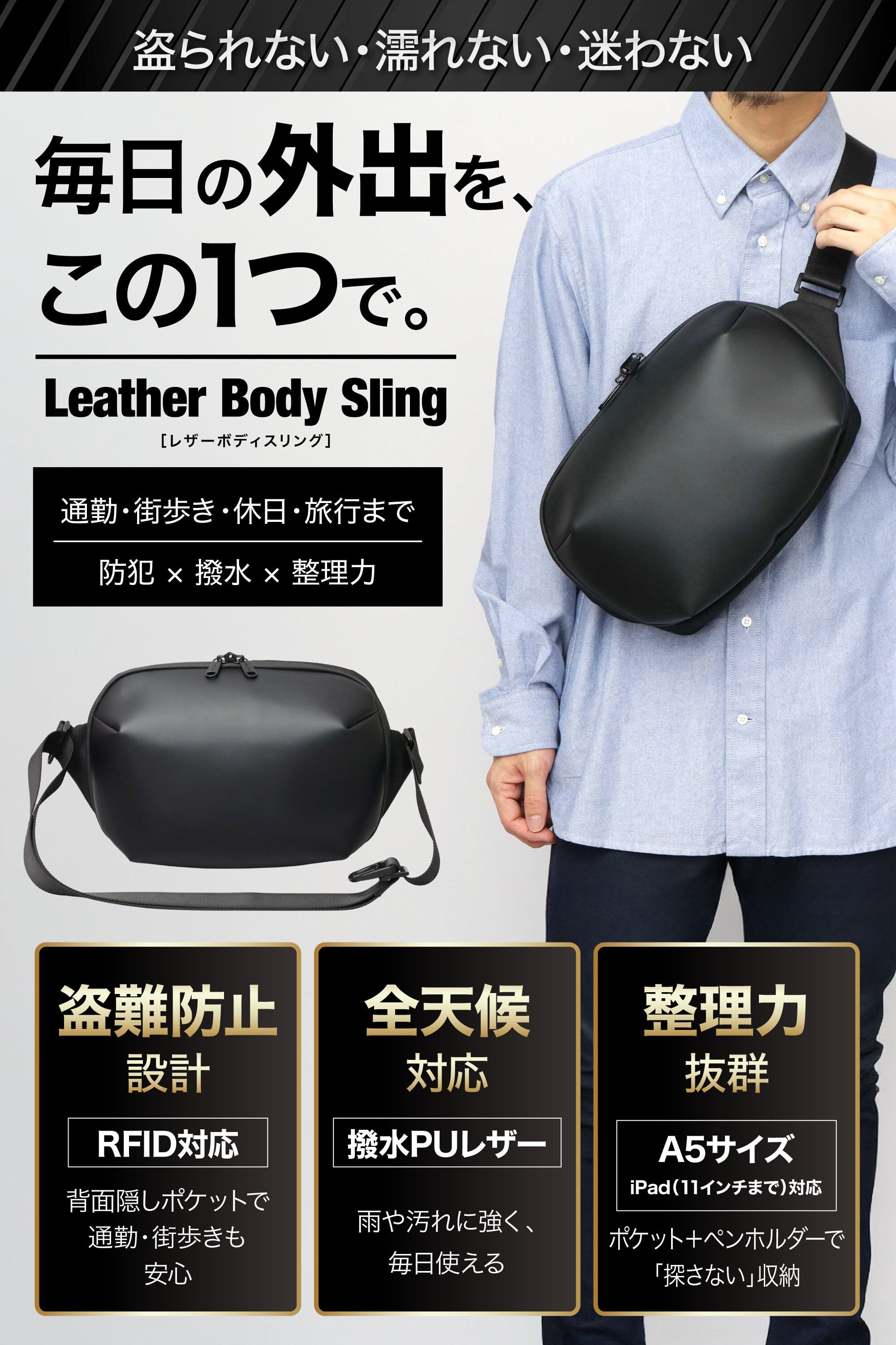 通勤や街歩き、休日のお出かけから旅行まで幅広いシーンに対応。 RFID対応の背面隠しポケットや撥水PUレザーを採用し、防犯性や使いやすさに配慮した設計です。 整理しやすいポケット構造で、A5サイズや11インチiPadなど日常の必需品をすっきり収納できます。