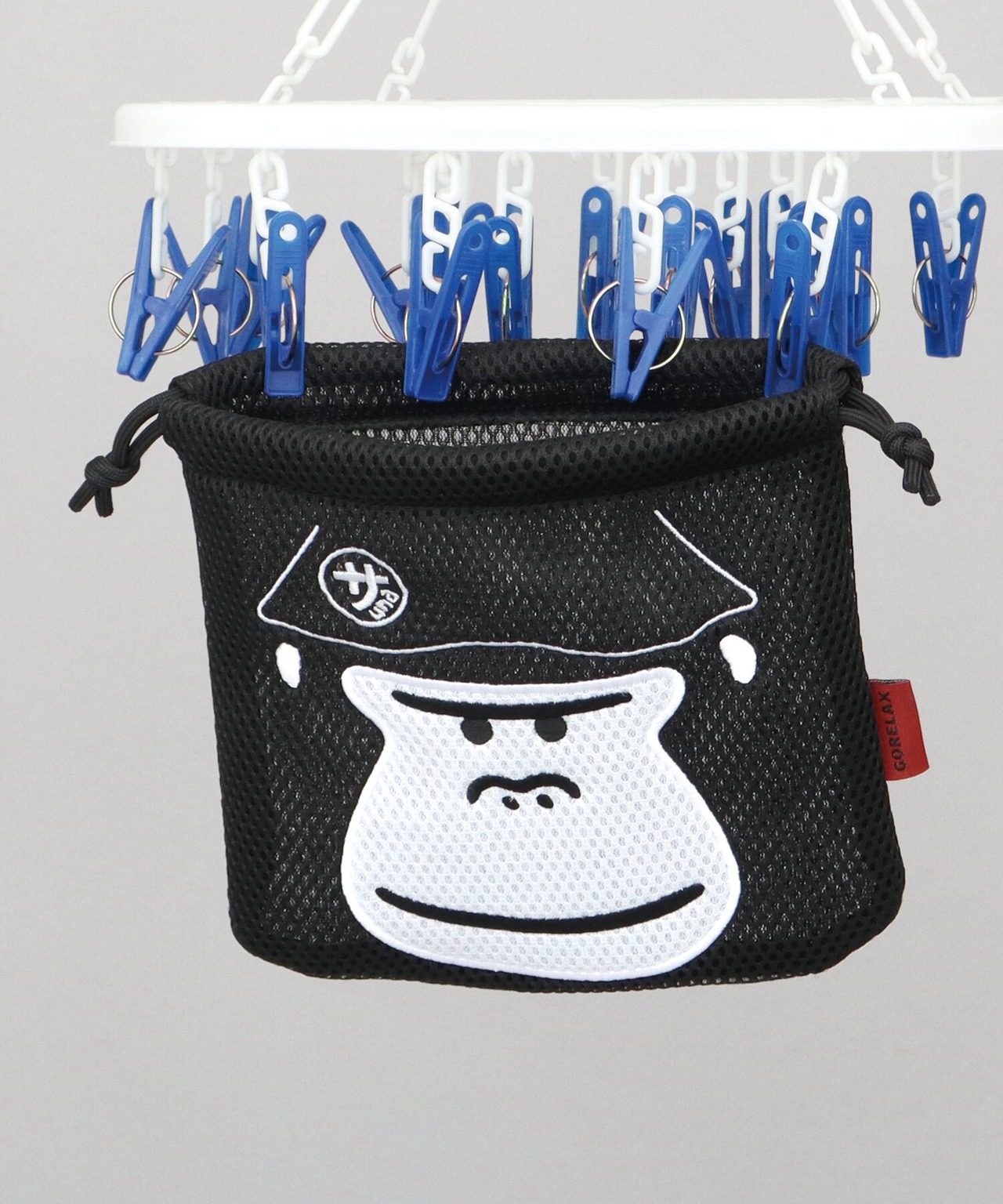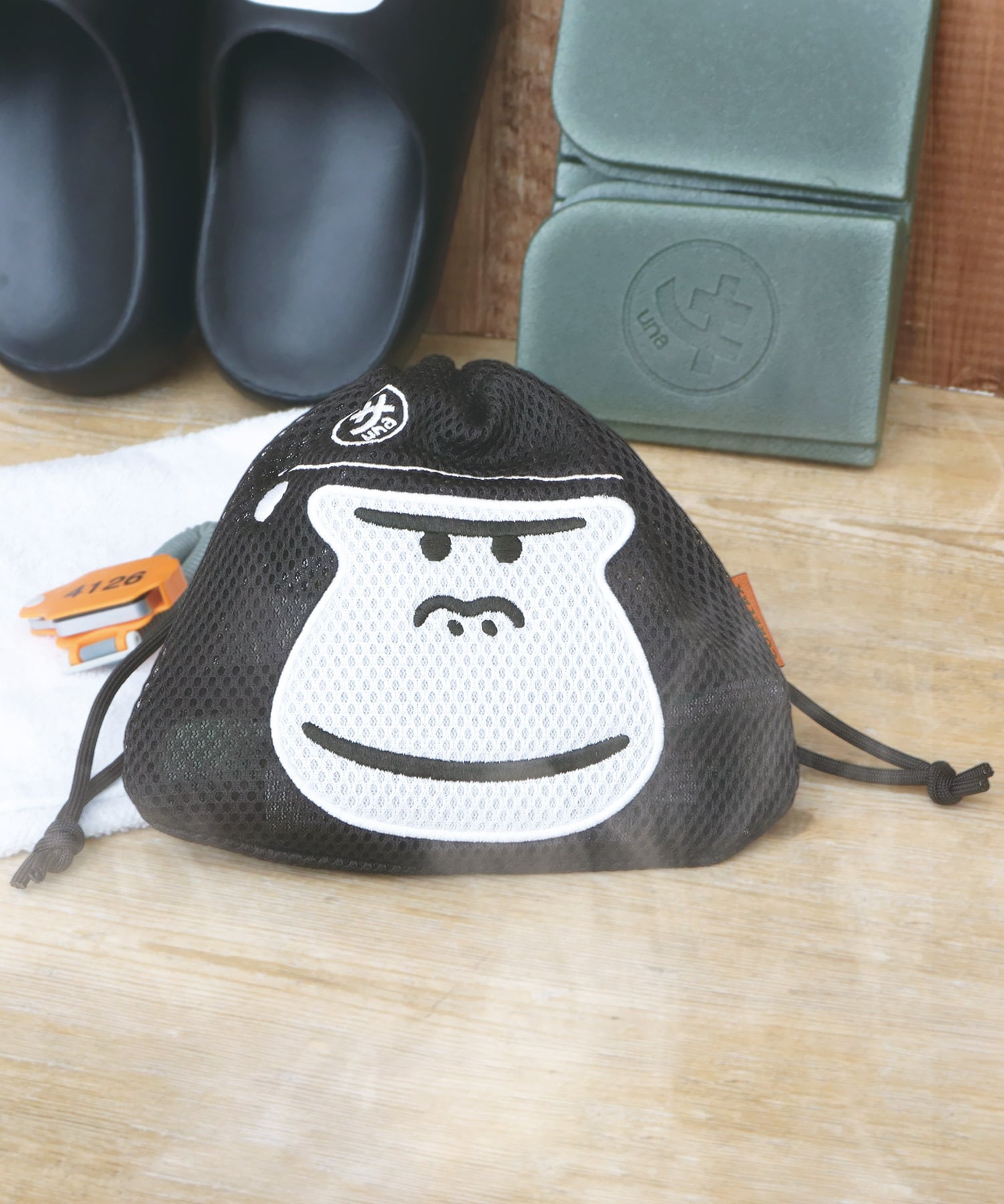 サウナ・温泉・銭湯シーンで使いやすい、洗える巾着。ブランドキャラクターでもある、ゴリラの“まもるさん” のフェイスデザインが目を惹くアイテム。