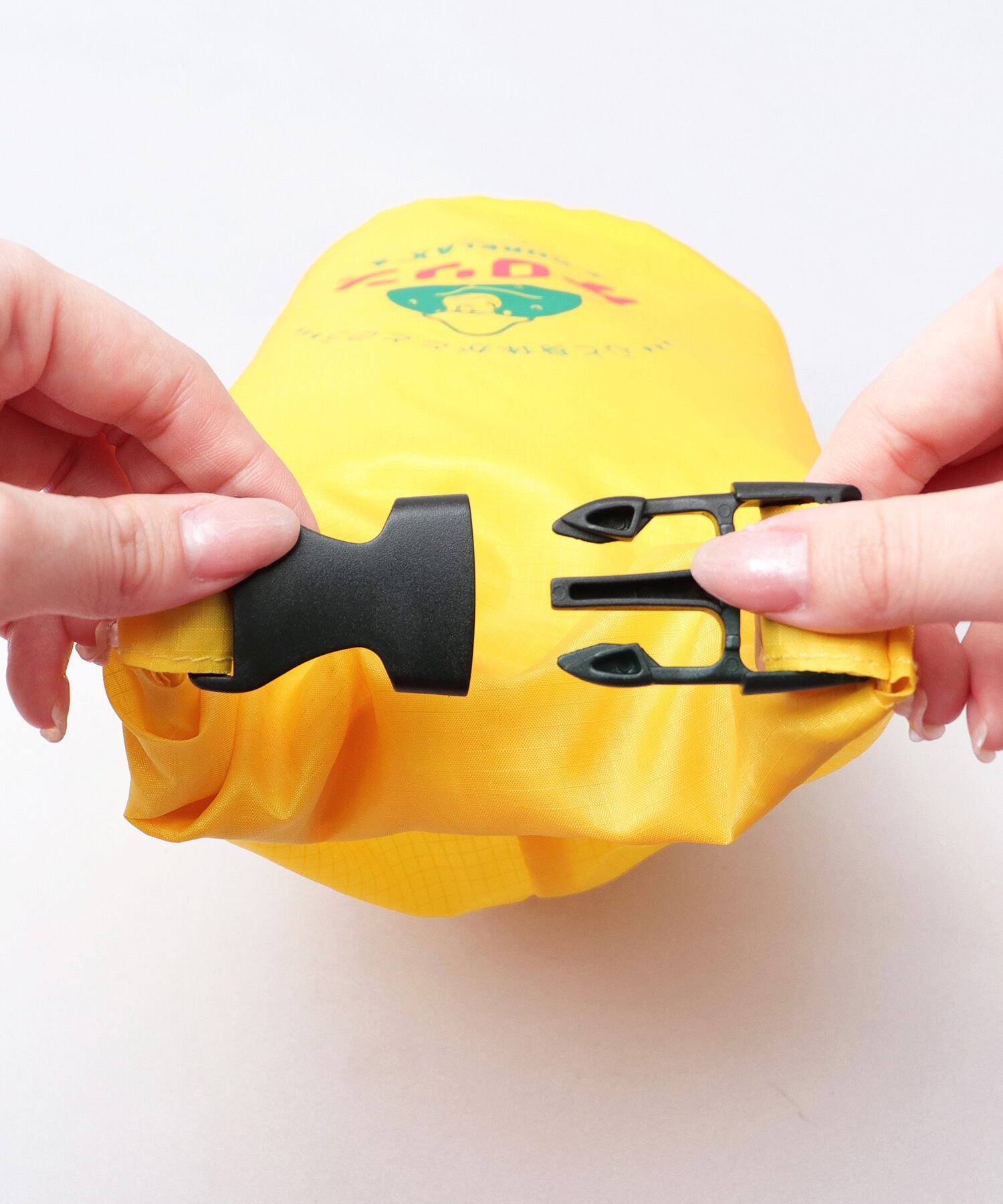 荷物を入れた後は、間口をくるくると巻いてバックルを留めるだけ。空気を抜いて軽く圧縮でき、持ち運びもスマート◎