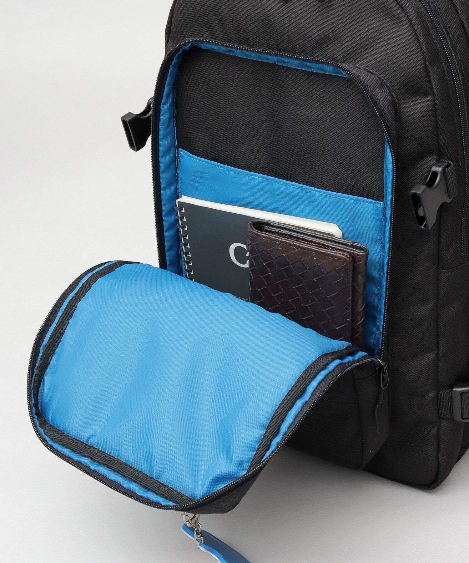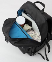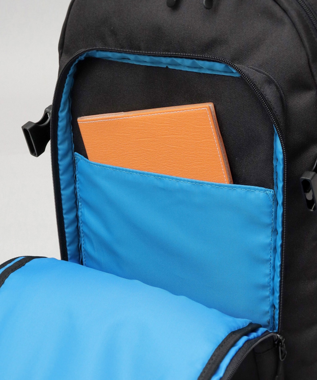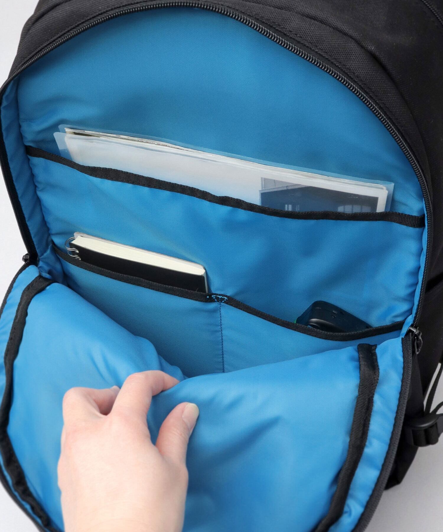 マチ幅をしっかり確保したメイン収納。内側にはPC・タブレット対応のクッションポケットとファスナーポケットを完備。