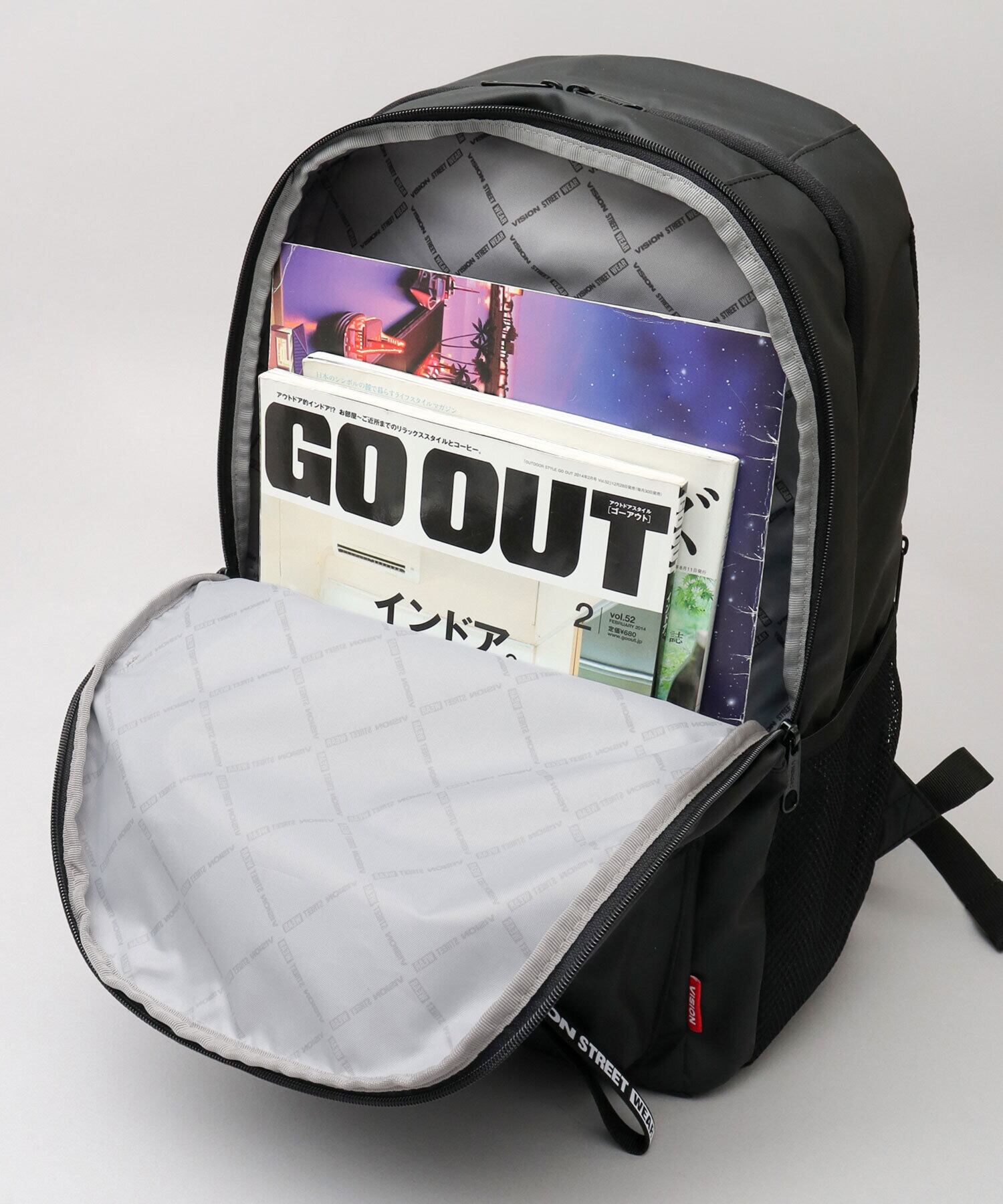スケートボードカルチャーやストリートファッションシーンで人気のブランド“VISION STREET WEAR(ヴィジョンストリートウェア)”の大容量バックパック。素材には、裏面にウレタンコーティングを施した600Dポリエステル生地を使用し、耐久性と耐水性を高めています。コーティング面をあえて表側に使用したマットな質感がデザインのポイント。収納は、荷物を分けて整理しやすい2層式構造に加え、バッグ内外に実用的なポケットを豊富に配置した高い収納力が魅力です。B4サイズ対応のメイン収納には、通勤・通学に便利なPCスリーブを装備。フロント・サイド・背面にも複数のポケットを備え、日常使いから通勤・通学まで幅広いシーンで活躍するバックパックです。