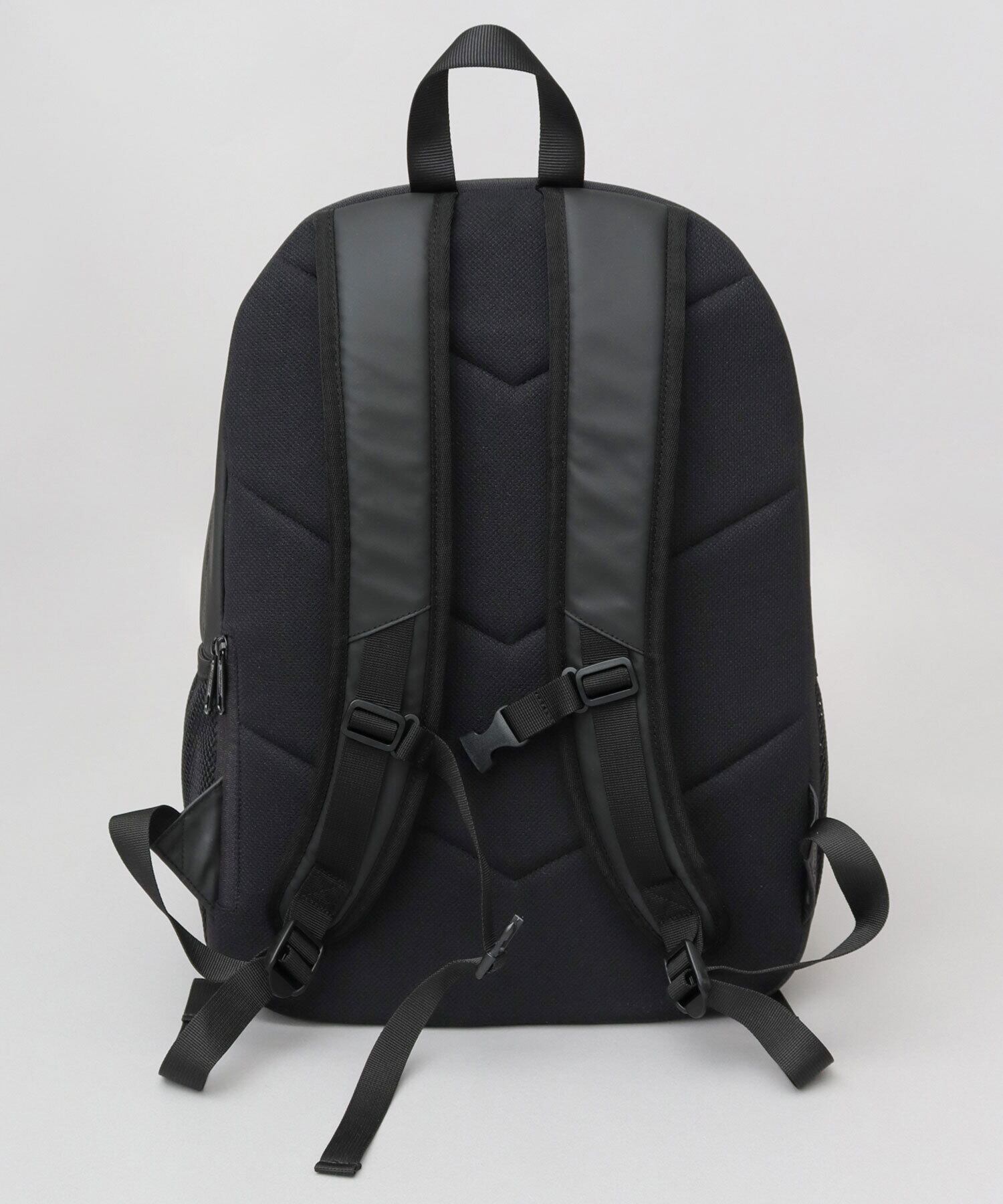 縦横にスペースを確保したラウンドシルエットのバックパック。マットブラックの落ち着いた表情に、ブランドタグとロゴ入りストラップがアクセント。