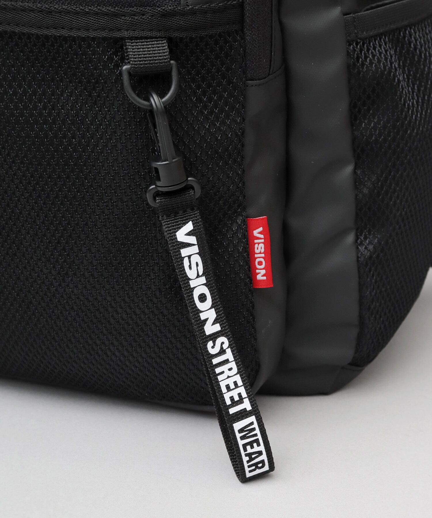 フロントポケット外側にはファスナー付きメッシュポケットを配置。Dカンにはオリジナルストラップを付属し、小ぶりなピスタグがアクセント。