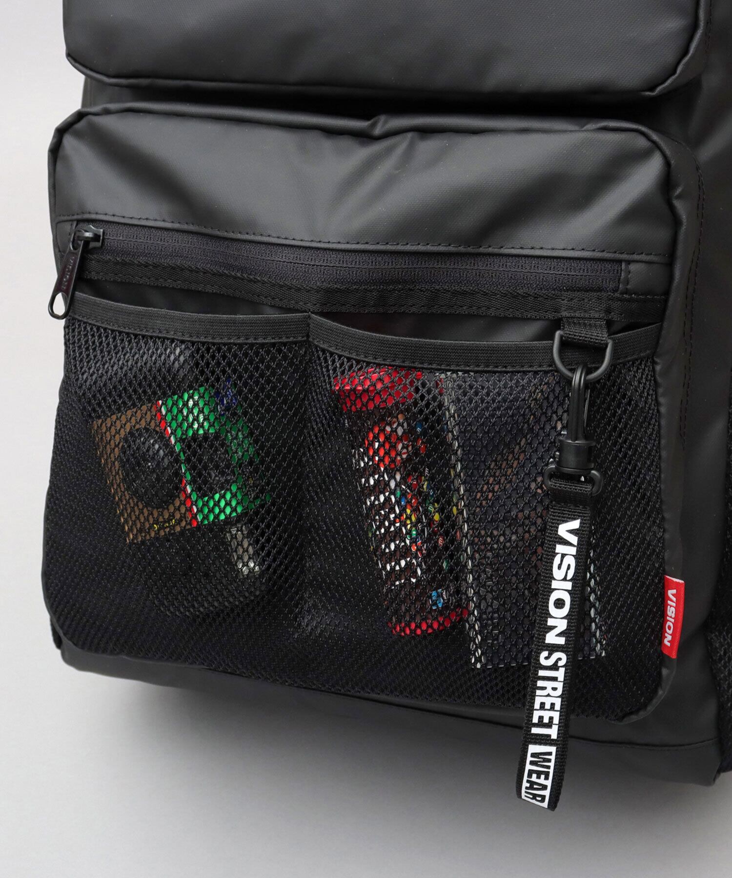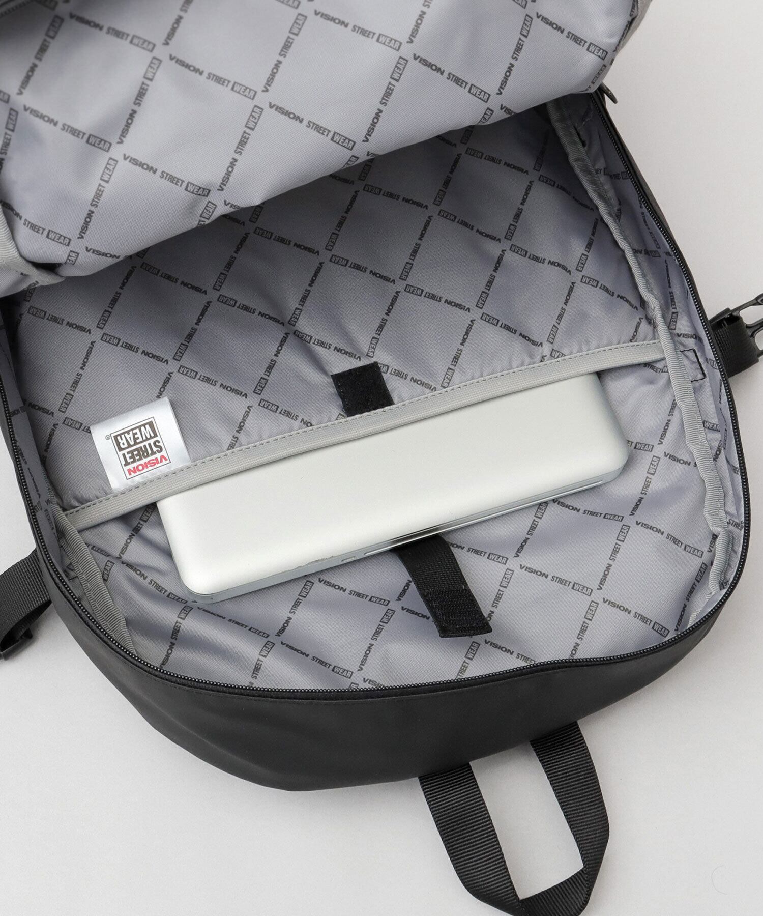 スケートボードカルチャーやストリートファッションシーンで人気のブランド“VISION STREET WEAR(ヴィジョンストリートウェア)”の大容量バックパック。素材には裏面にウレタンコーティングを施した600Dポリエステル生地を使用し、耐久性と耐水性を向上。フロントポケットを中心にバッグ内外へ実用的なポケットを配置した、収納力と使いやすさを兼ね備えたデザインです。メイン収納は荷物の出し入れがしやすい大きく開く仕様で、通勤・通学に便利なPCスリーブを完備。両サイドや背面にもポケットを備え、日常使いから通勤・通学まで幅広いシーンで活躍します。