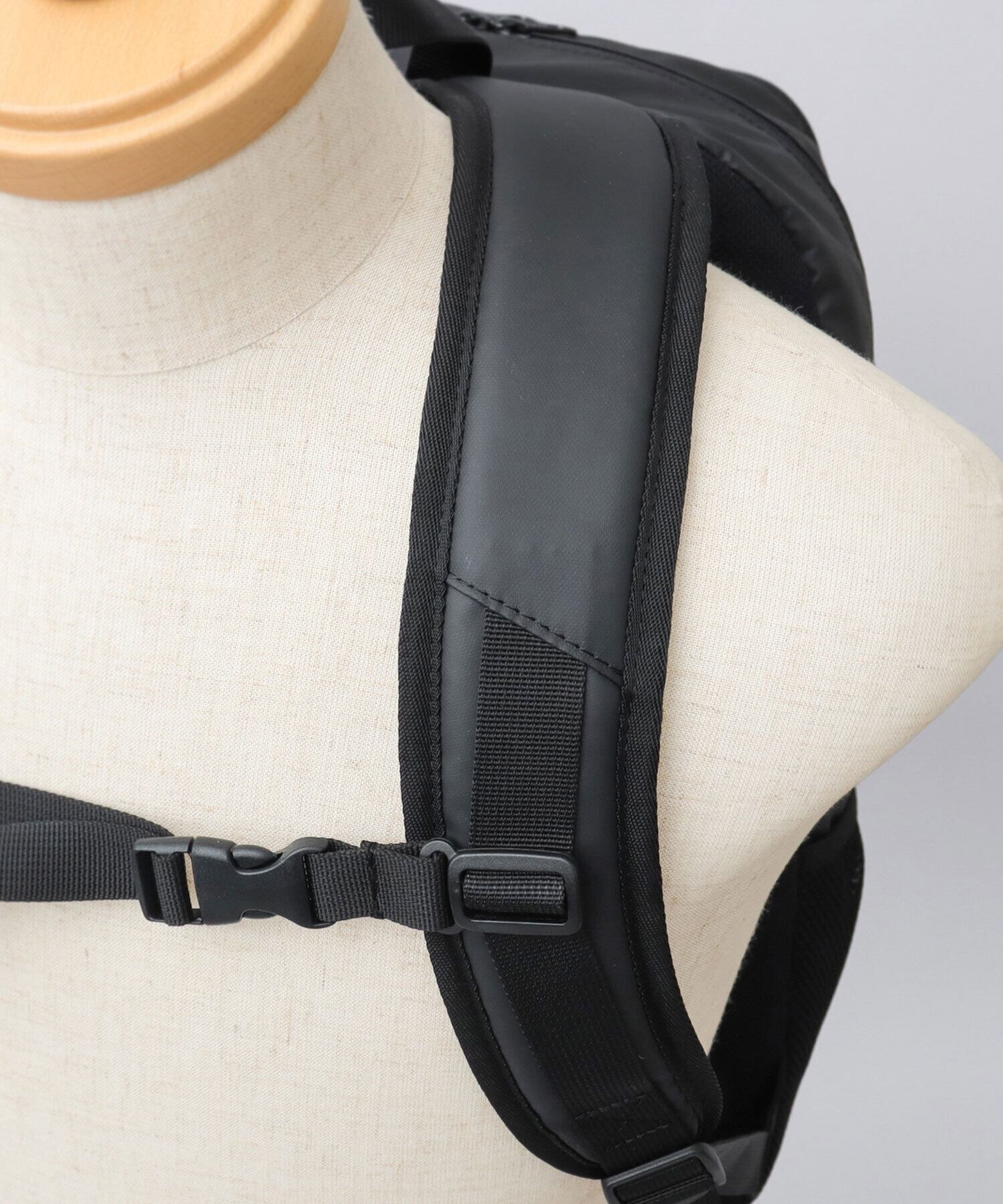 立体感のあるフロントポケットを中心に、バッグ内外へ豊富なポケットを備えた収納力の高いバックパック。マットブラックの落ち着いた表情に、ブランドタグとロゴ入りストラップがアクセント。