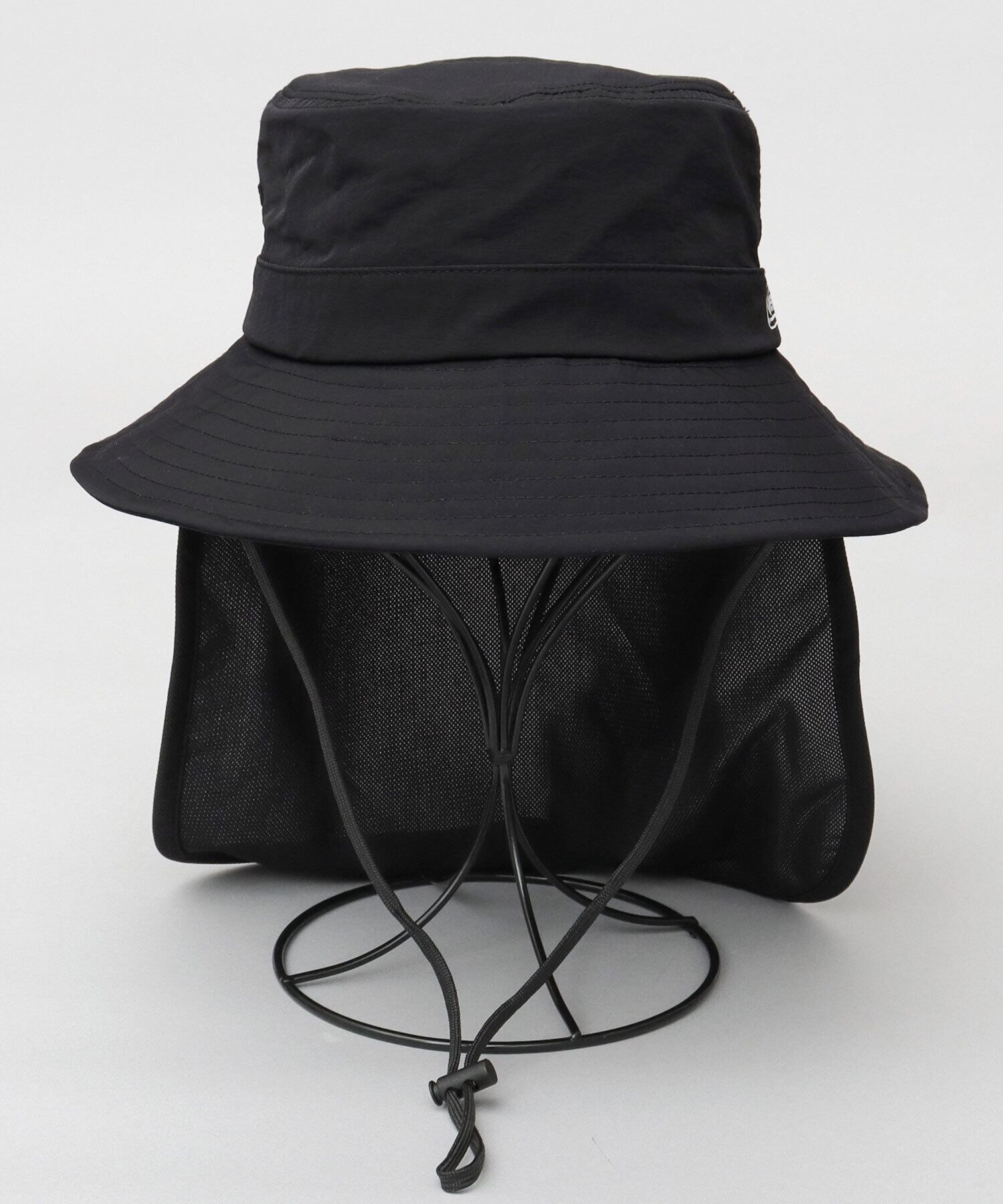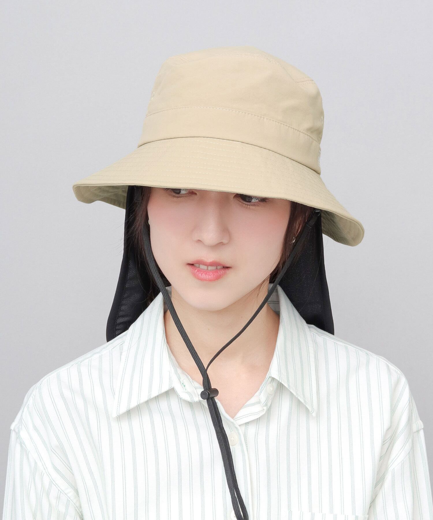帽子後部にシェードを備え、首元まで日差しをカバー。シェード部分には接触冷感機能付きのナイロン混メッシュ生地を使用し、首元のムレに配慮しています。取り外し可能で、タウンユースにも使いやすい仕様です。