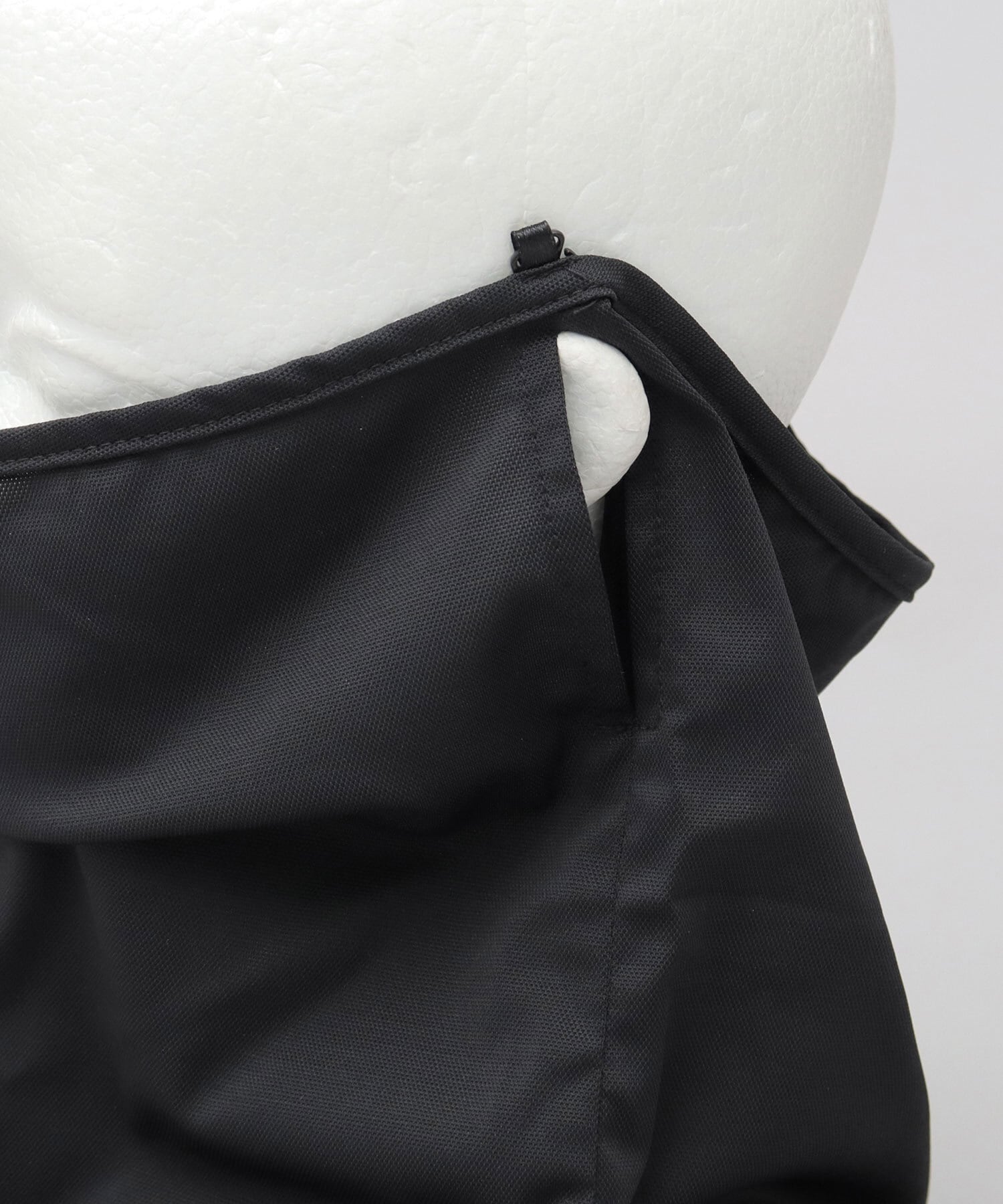 左右に耳を出せるスリット入りデザイン。フェイスラインをカバーしながらも、耳まわりのムレや圧迫感を軽減し、会話や周囲の音も聞き取りやすい設計です。