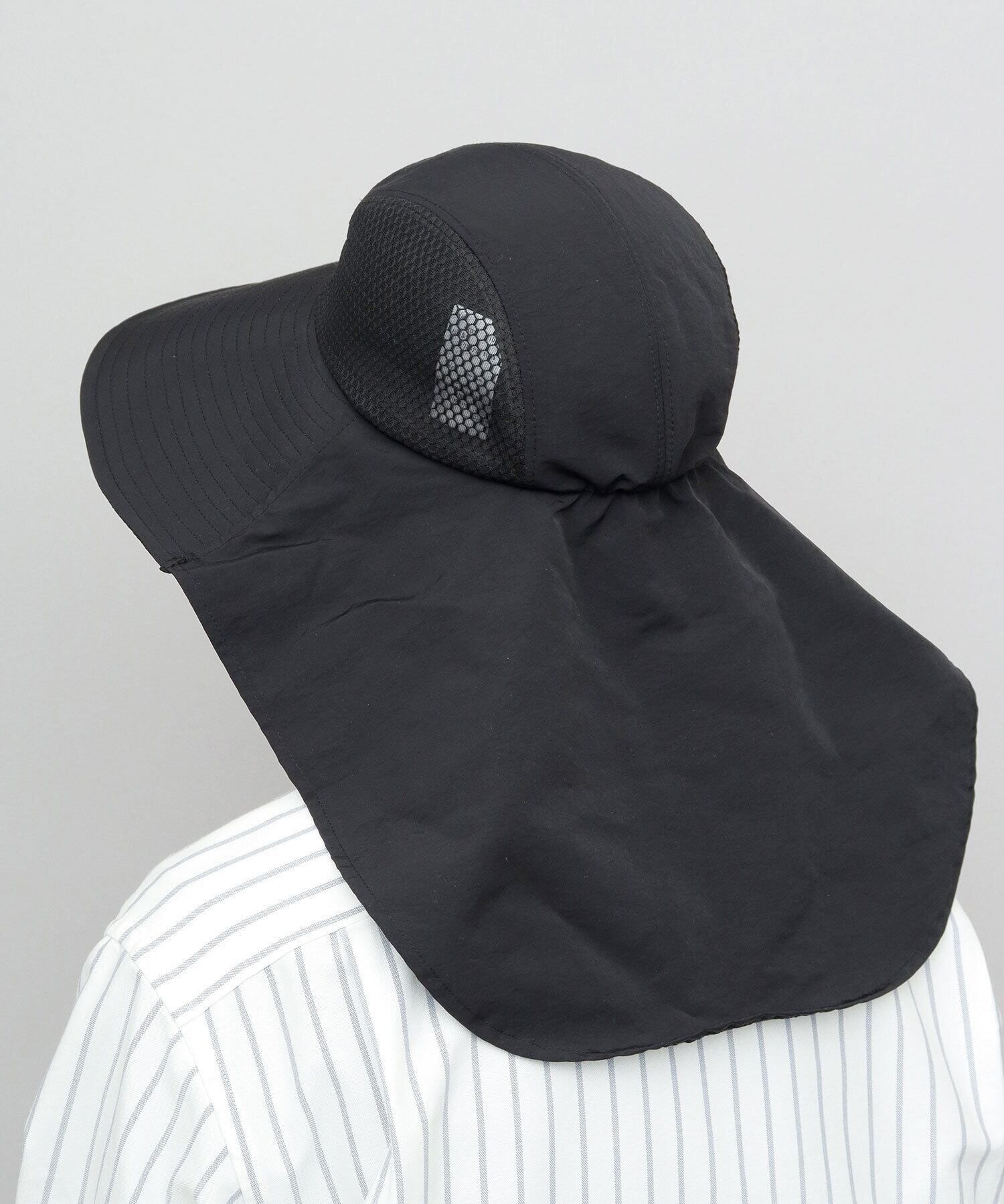 首元から背中までしっかり覆える大判サンシェード付き。ツバと一体型の設計で、強い日差しの下でも安心感のある被り心地です。